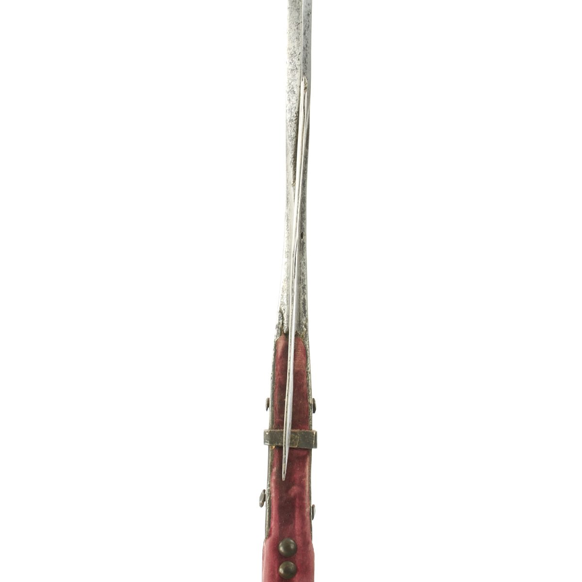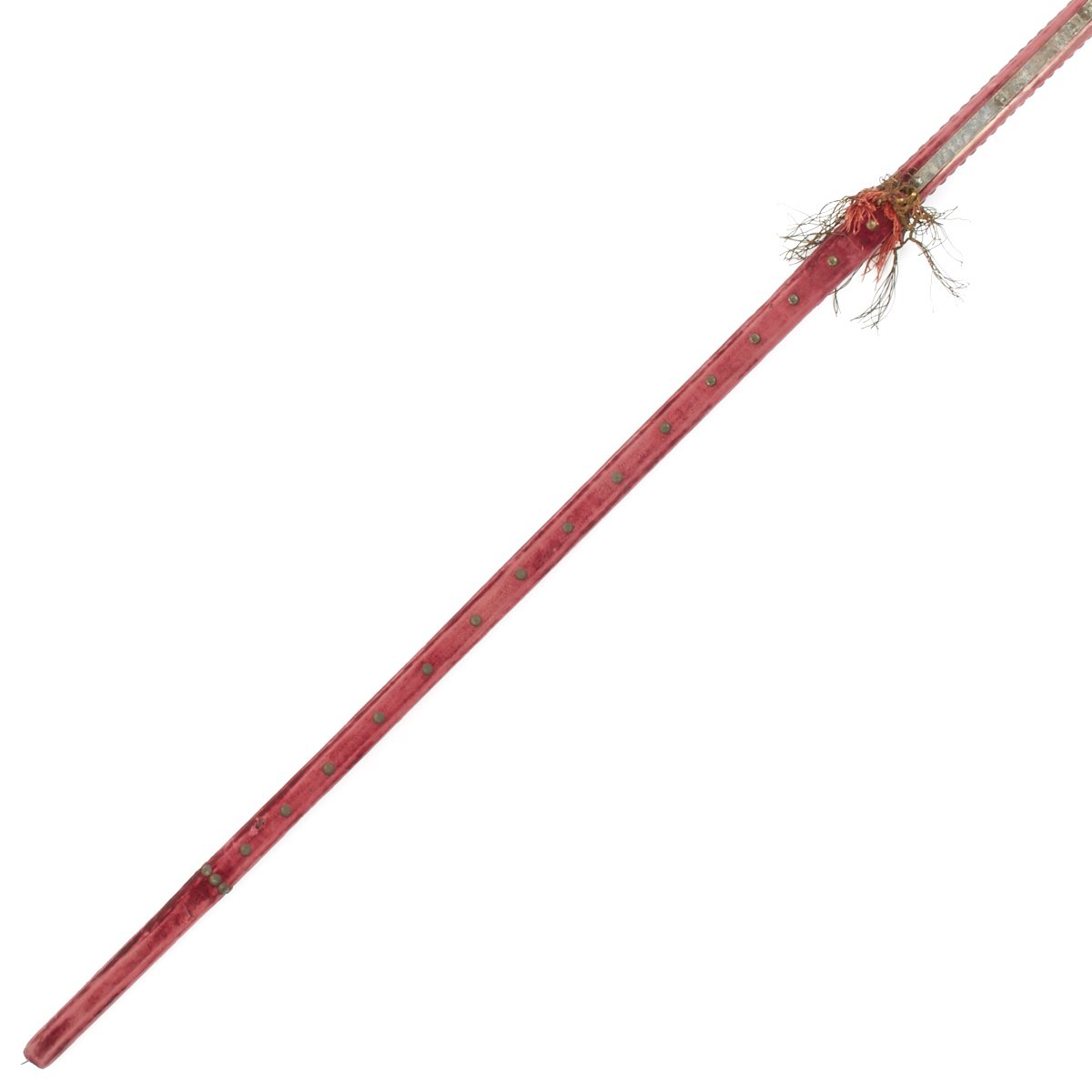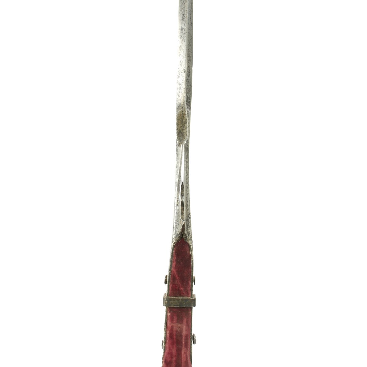 The well-forged head measures 21" overall, excluding the support straps, and has a decoratively pierced blade 7 - 3/4" across. With the straps, the head is approximately 40 inches long. The central spike measures 13" and the fluke 3". The shaft is covered with faded red velvet and decorative tassel below straps, though the tassel is in VERY delicate condition. There are brass tack decorations running down the length of the halberd in the velvet.