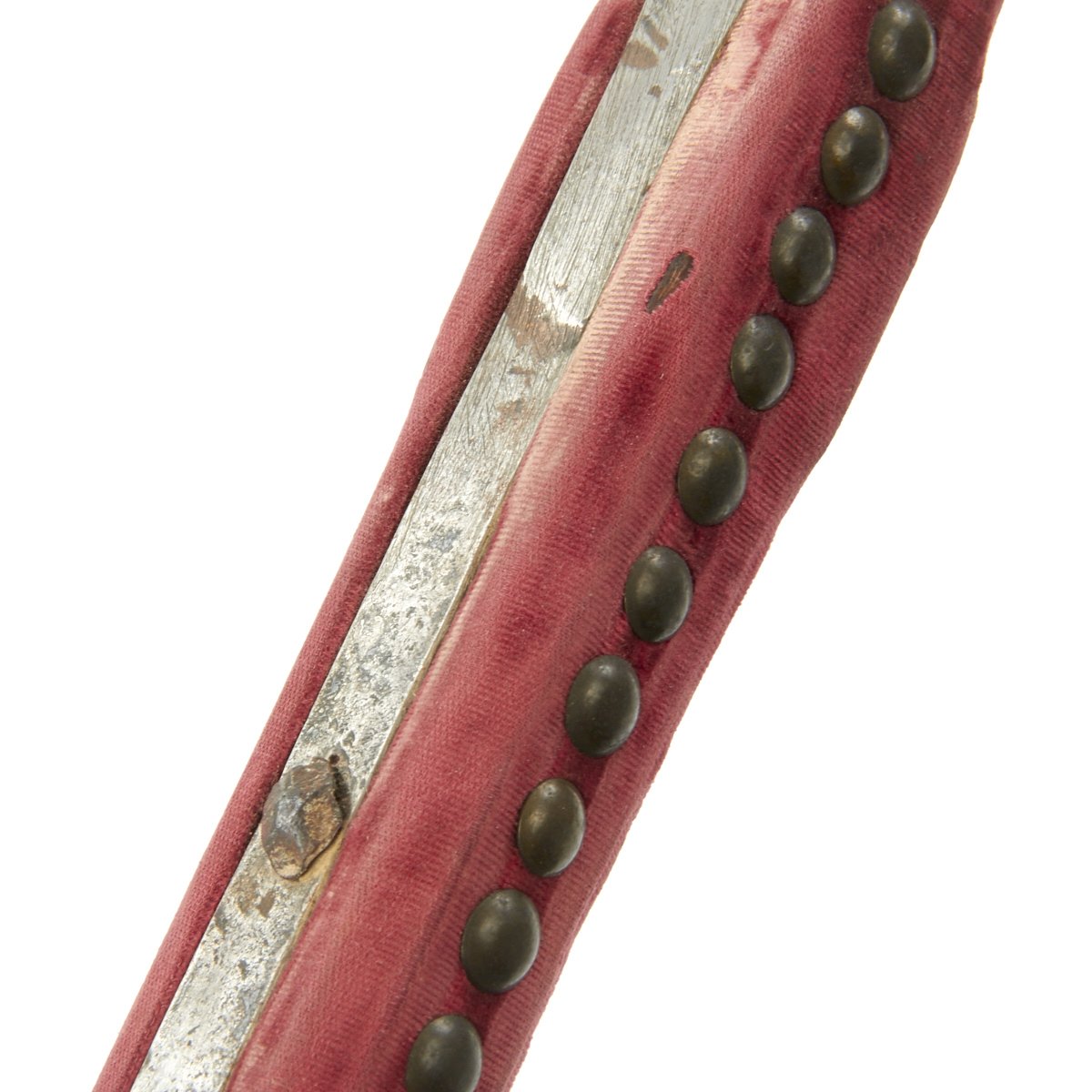 The straps do show some old copper brazed repairs. Head shows exfoliation and old European style cleaning. The velvet is worn, and most of the nap of the fabric has worn away. However, the velvet is not original to the piece, but an addition later, to enhance the look while on display, most likely at a major estate or castle. The style of the halberd leads us to believe that it is probably English, but without more definitive information, we can only say it is European.