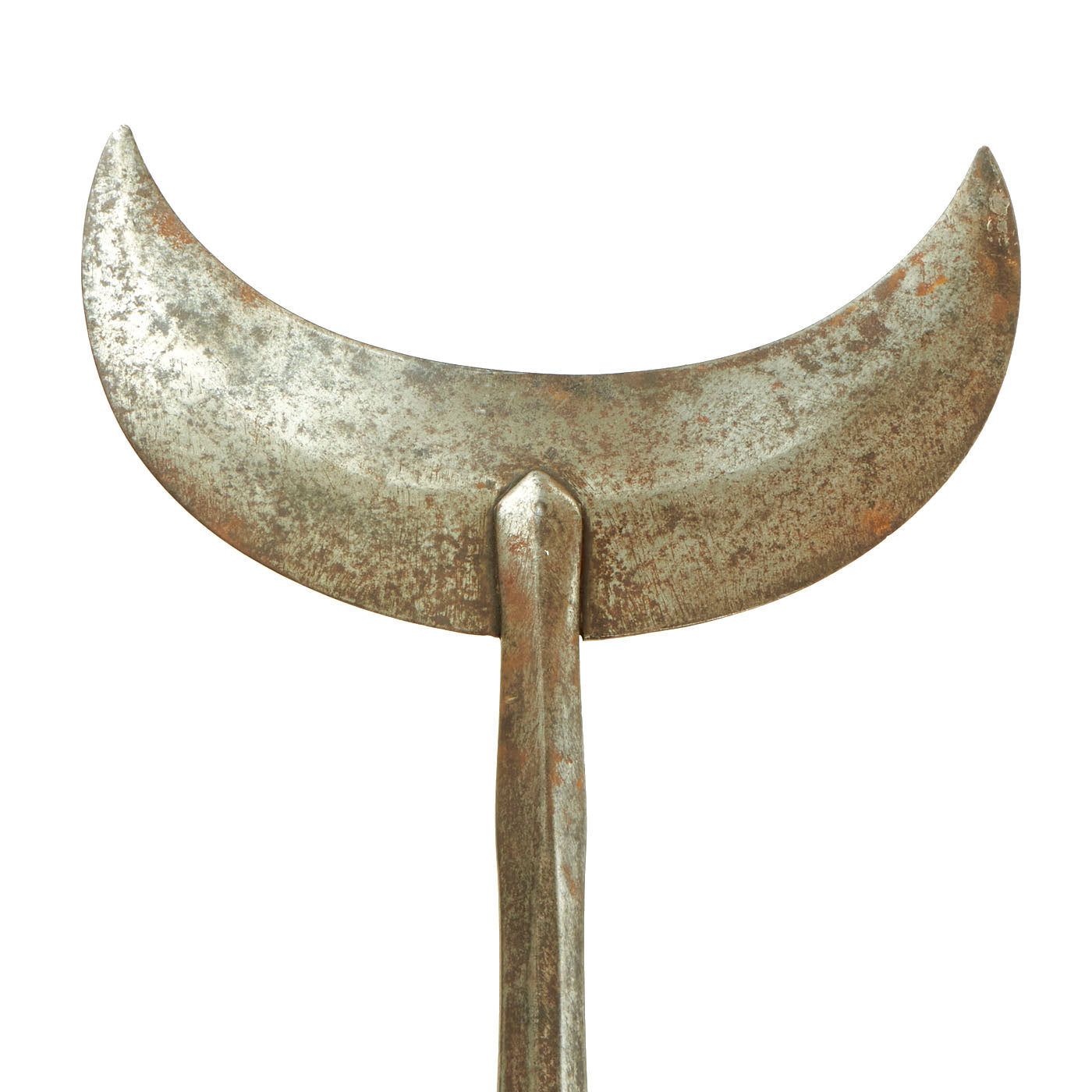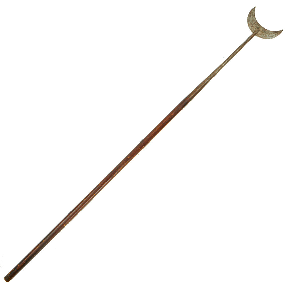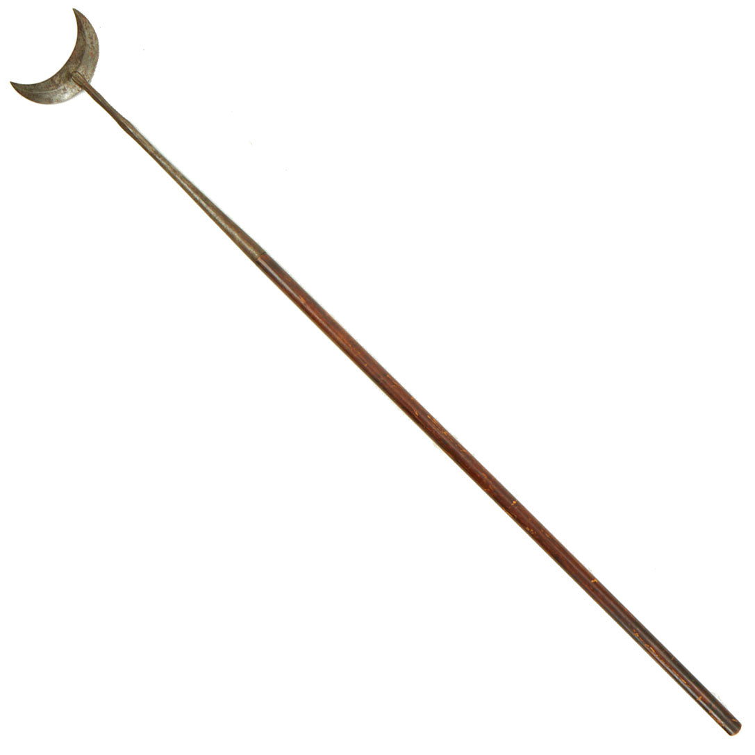 Original Item: Only One Available. This is an impressive Chinese late 18th Century Qing Dynasty (1636–1912) polearm with a crescent shaped blade, known as a Yuechan (月铲) , which translates loosely to "Crescent Moon Spade". These are also sometimes called "Gekken" after the Japanese term, but that is not correct. These were used mainly by infantry against mounted soldiers, as the blade shape allowed them to easily "catch" the rider, and hopefully injure and unhorse them. There were two forms, those like this example, and others with a moveable "moon" with hooks on the end.