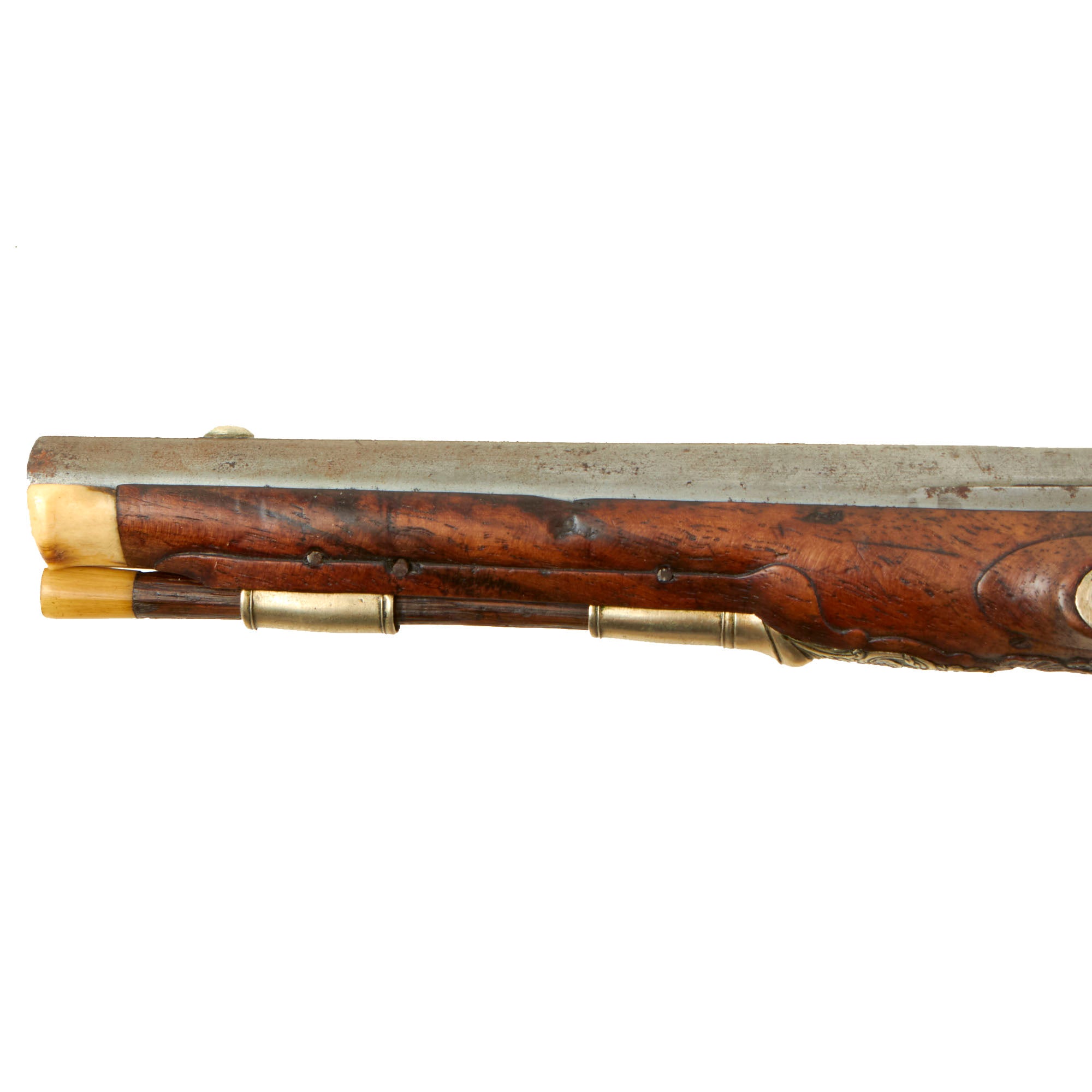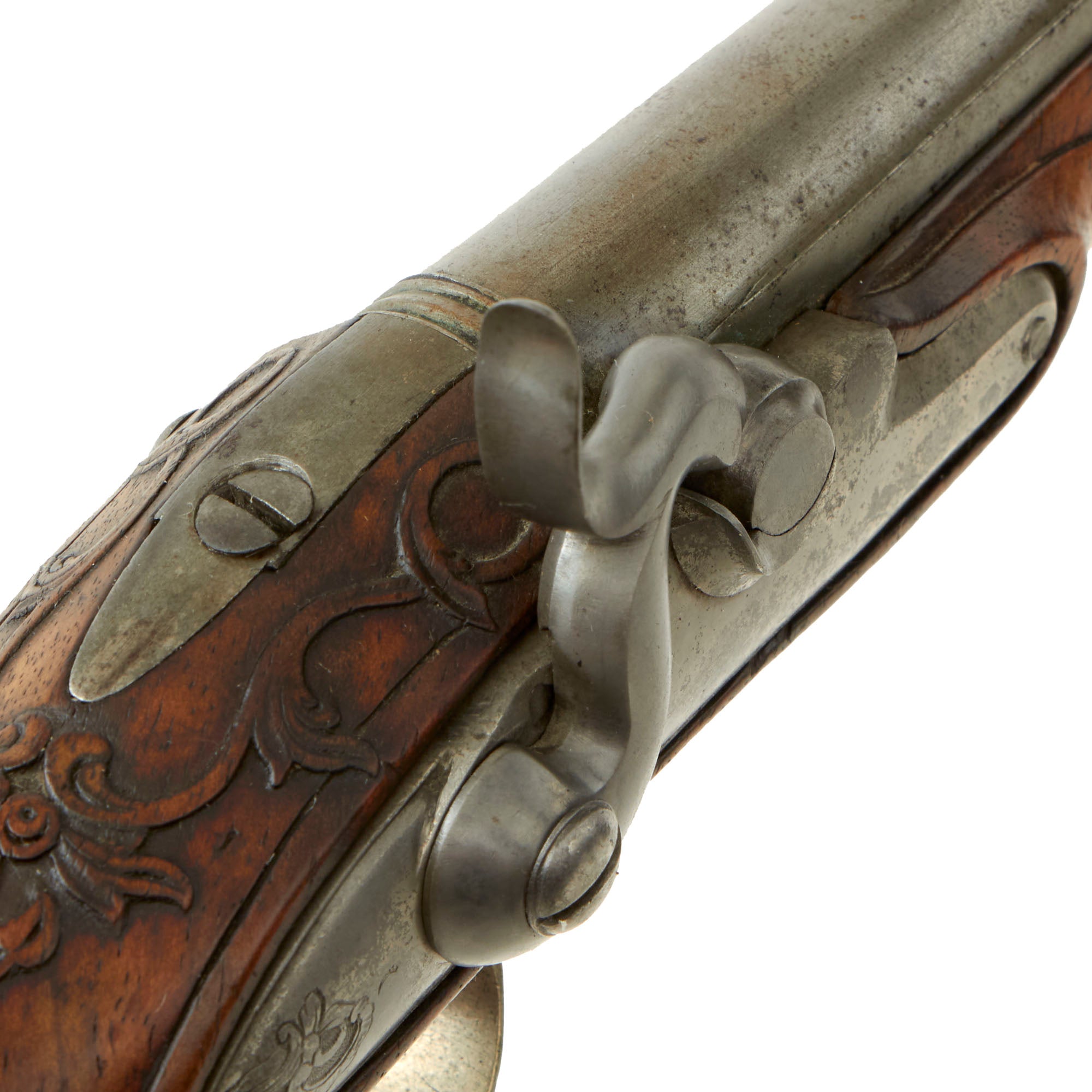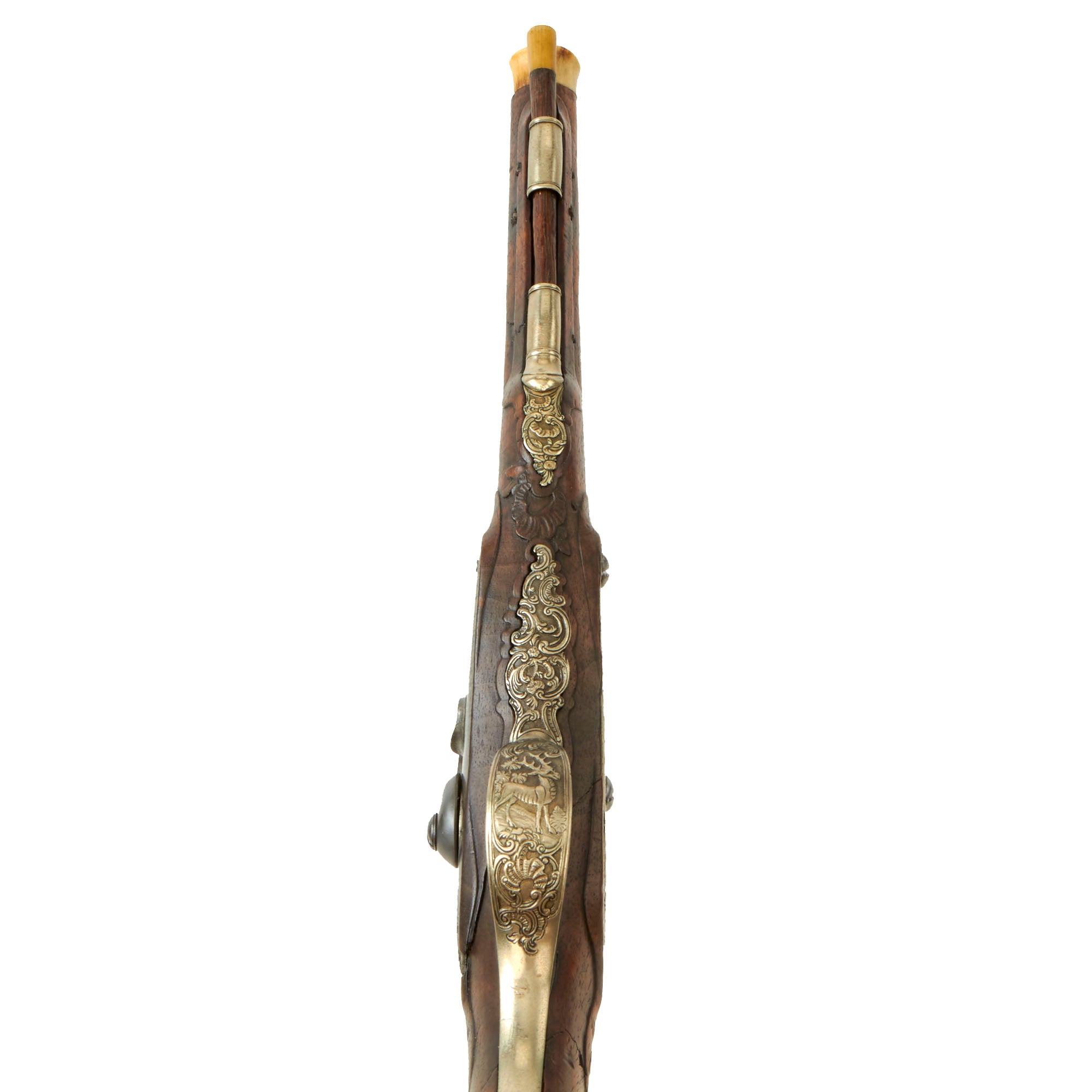 Condition is very good overall, showing a lovely matured patina on the metalwork, with the nickel silver showing a lovely glow. The carved wooden stock has some lovely figuring in the grain, though it is cracked through the wrist and there is also cracking along the right fore stock area. We checked the lock, and it is fully functional, holding at half cock and firing at full.