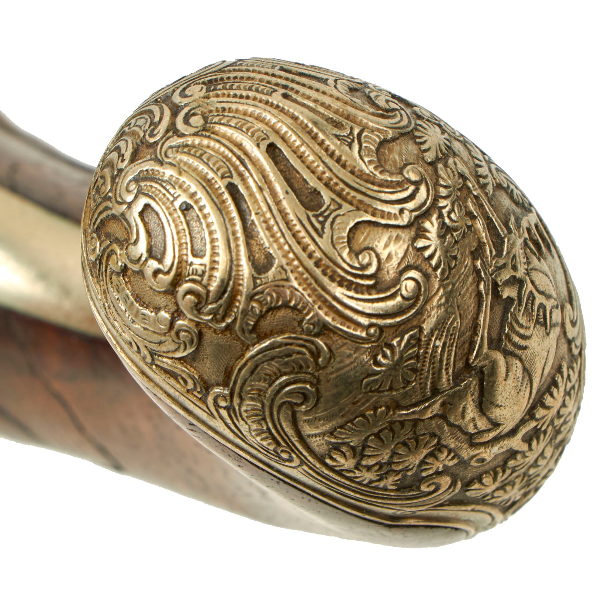 Original Item: Only One Available. Here we have a lovely late 18th Century German hunting pistol, originally made as a flintlock but later converted to the superior cap lock system, as with many arms of the time. It is not signed, perhaps with the markings lost at the time of conversion to the percussion cap system. It features exceptional quality embossed decorative “GERMAN” NICKEL SILVER mounts of Butt Cap, Trigger Guard, Side plate, Escutcheon and two ramrod pipes. These display all manner of animal life related to hunting, including stags, does, hunting dogs, and what looks to be a fox.