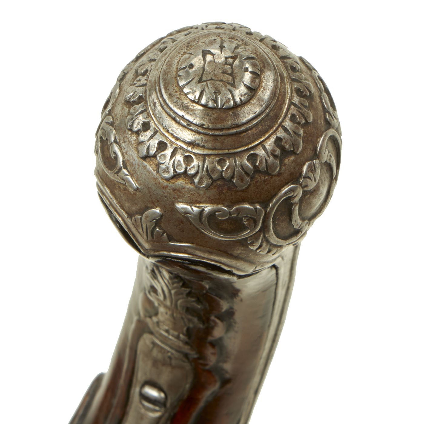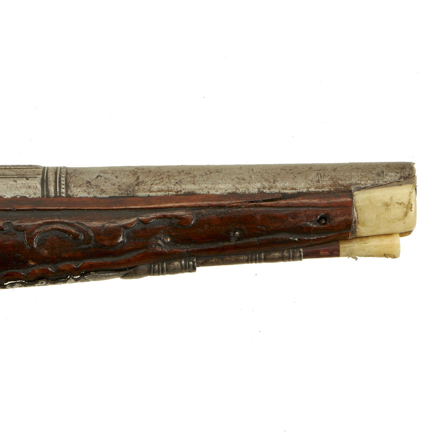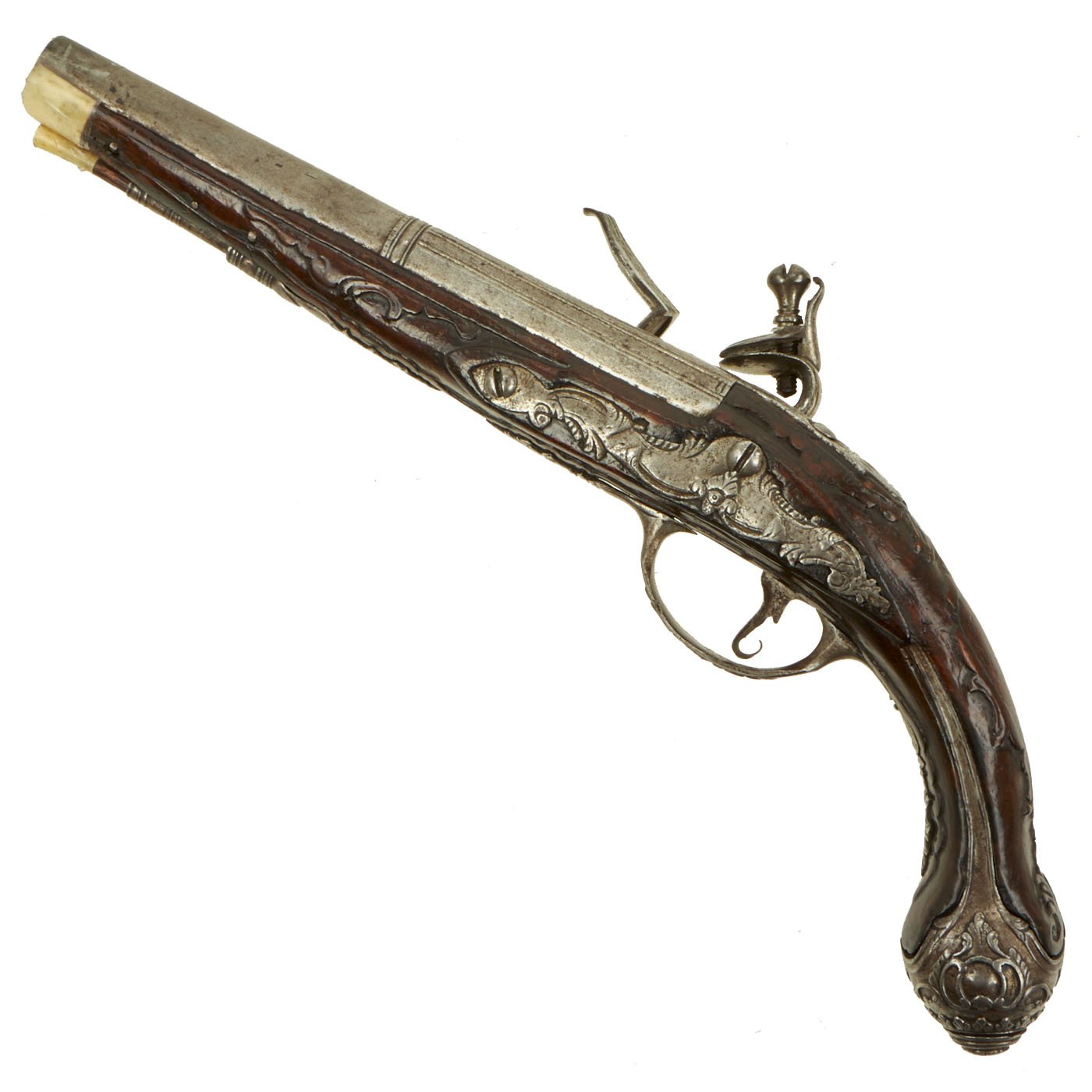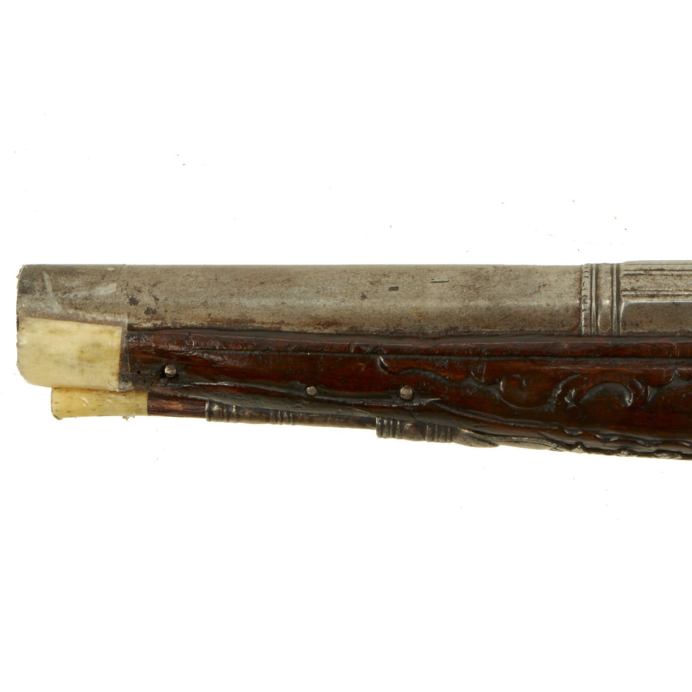 The pistol features all steel mounts beautifully embossed and carved in relief, with the hardwood stock also chiseled and carved to match. It is relatively slender, measuring 12 inches in overall length, with a 7 inch 0.55" bore barrel. It also has what appears to be walrus ivory nose cap and ramrod tip. We were not able to remove the ramrod, so we do not know if it is functional or ornamental.