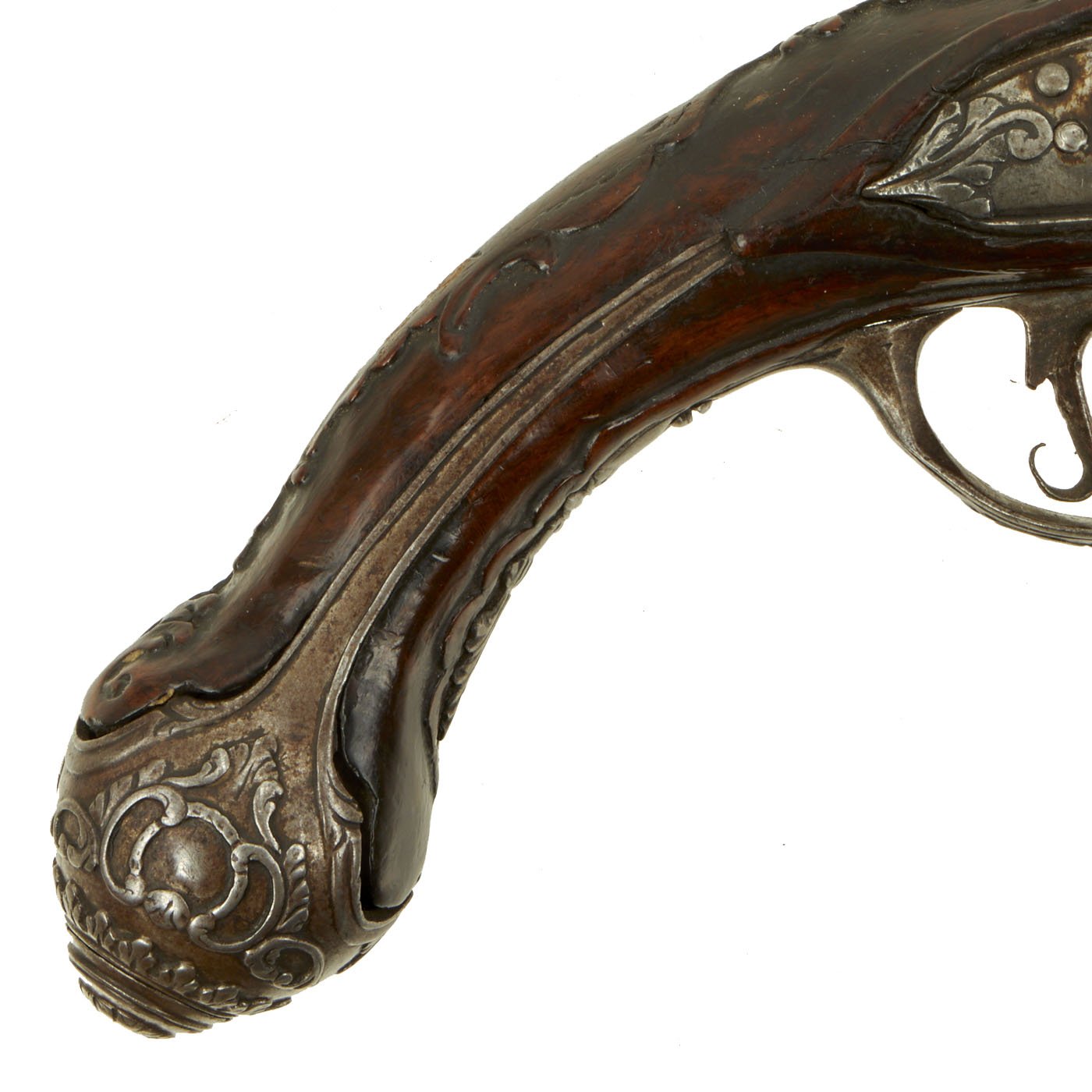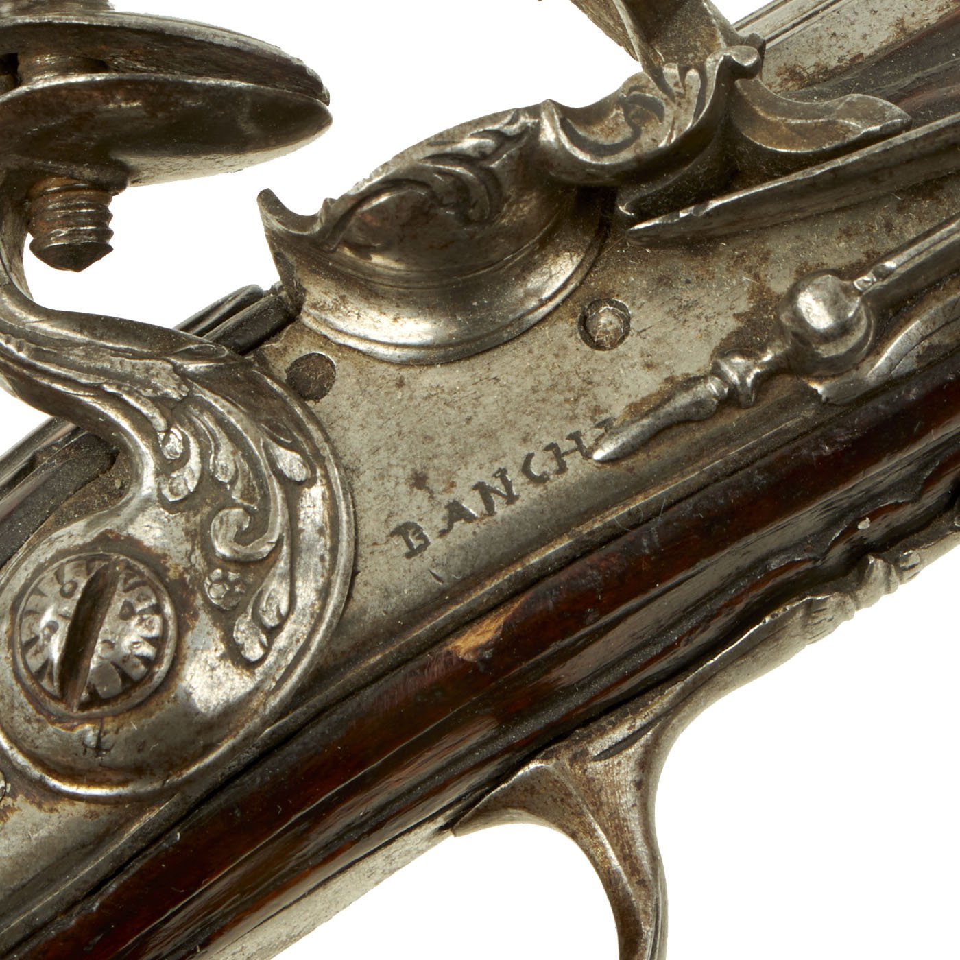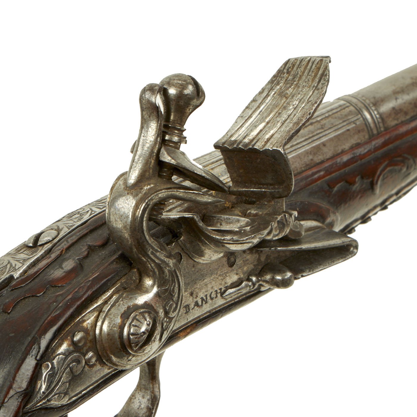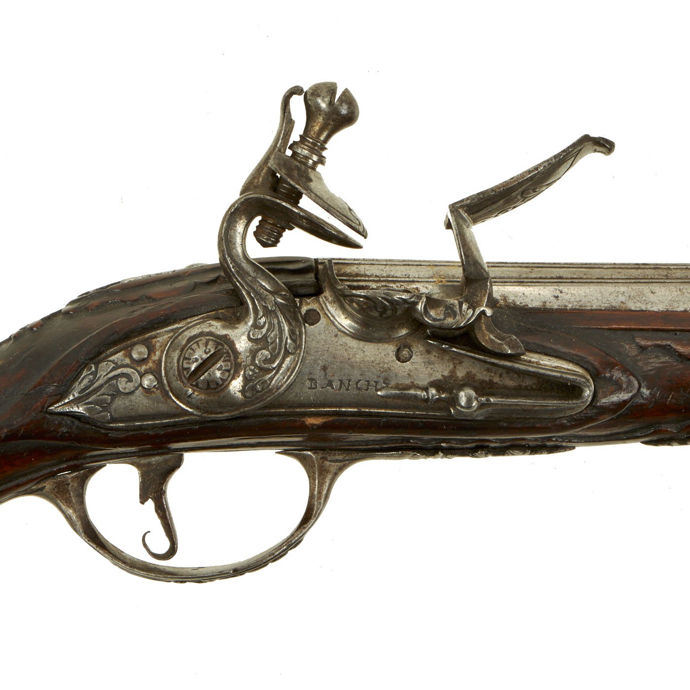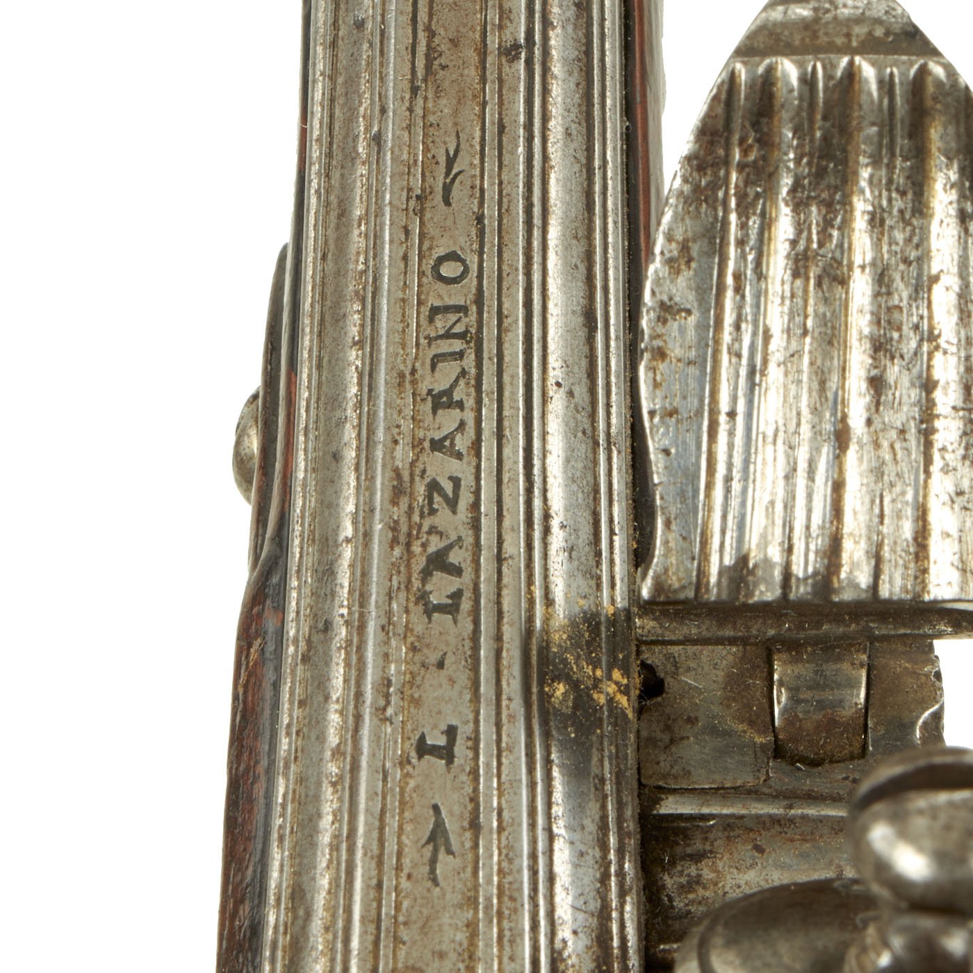 Original Item: Only One Available. Here we have a very nice Italian flintlock pistol of overcoat size. The rear portion of the steel barrel is fluted and clearly marked L. LAZARINO, for maker Lazaro Lazarino. The lock is also marked by maker G. Banchi. The pistol was made in the gun-making region of Brescia, Italy between 1790 and 1800.