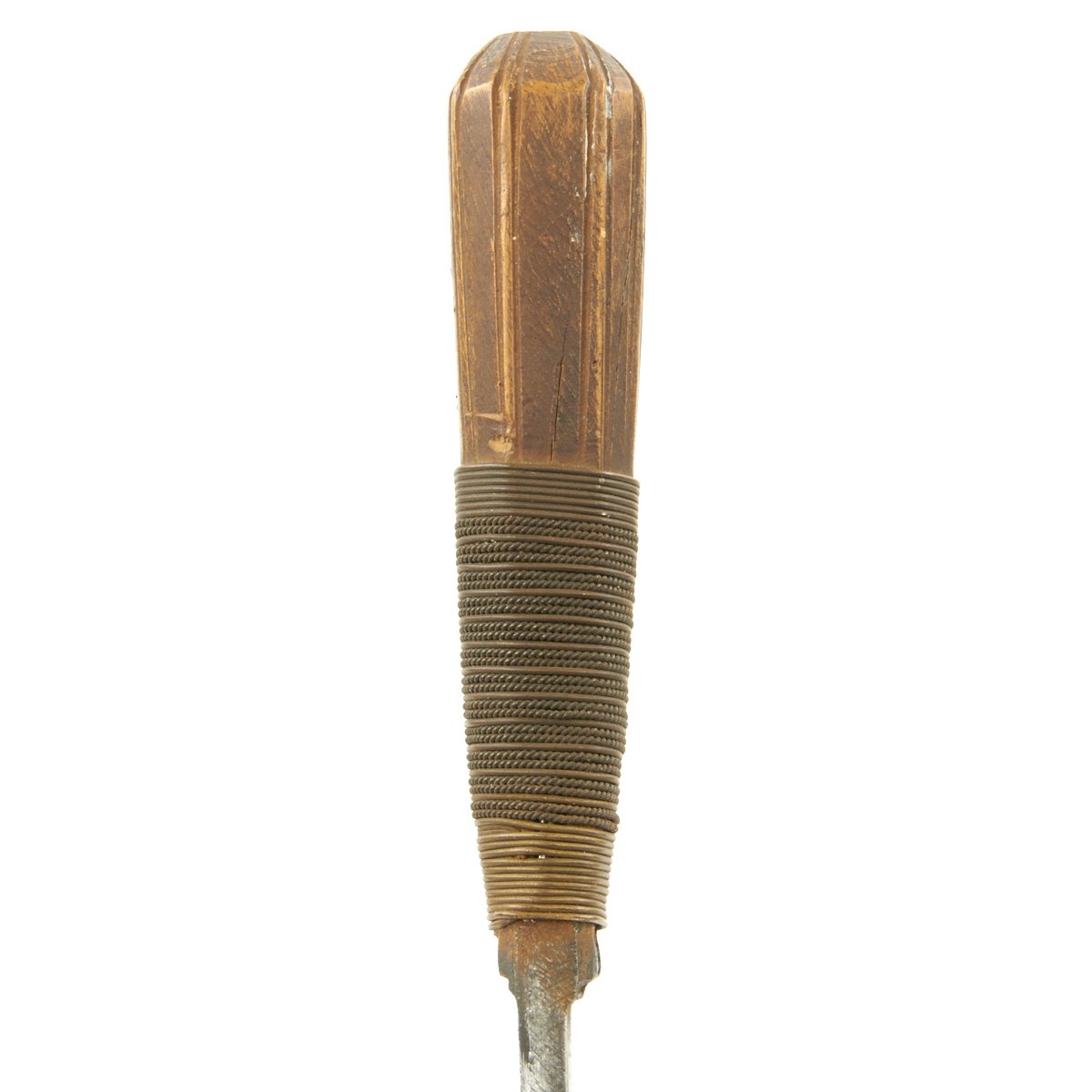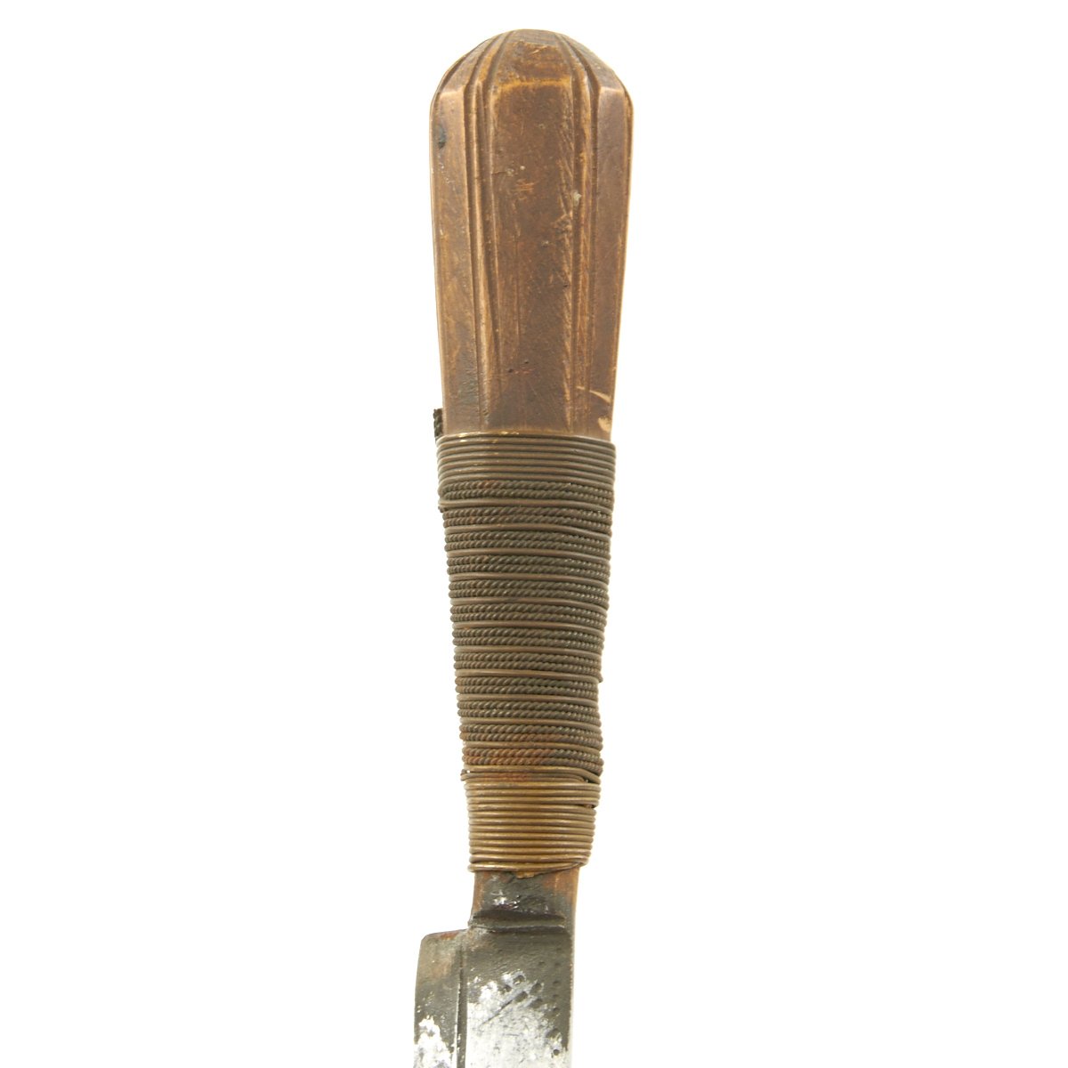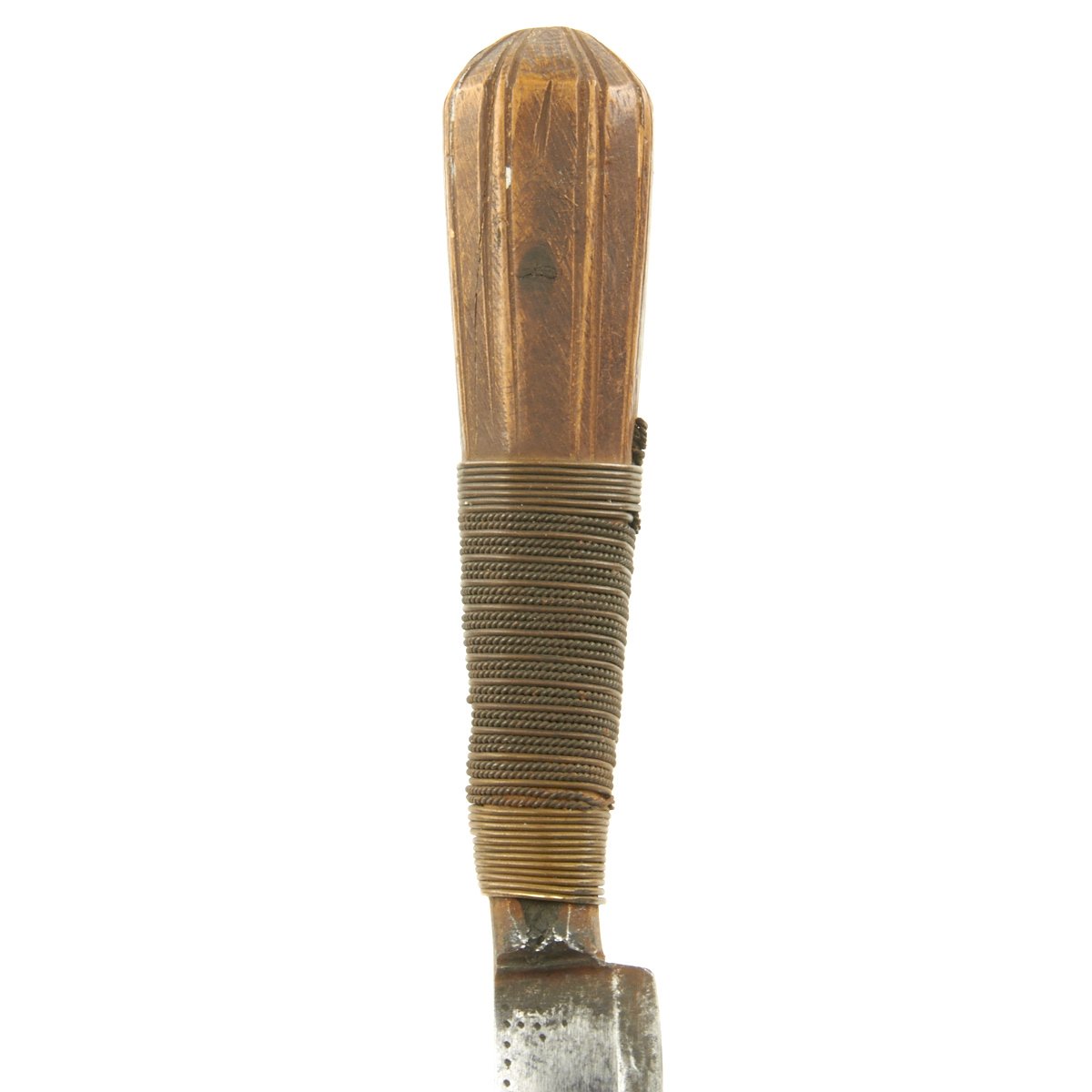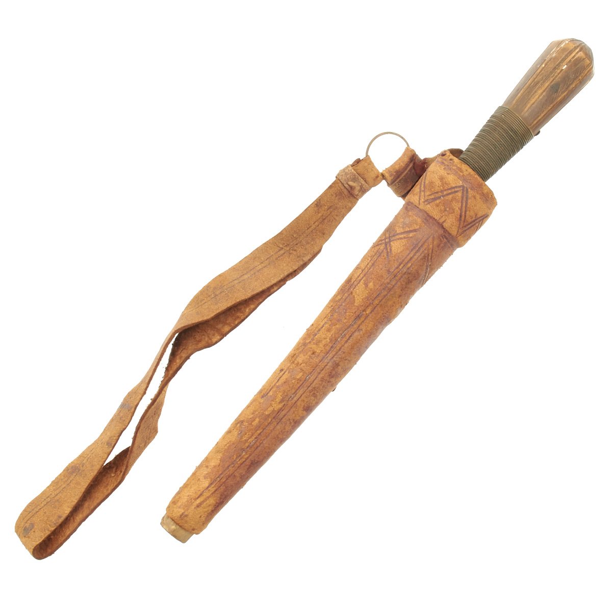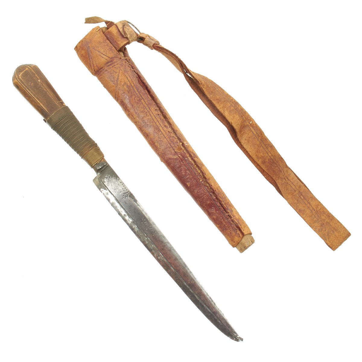 Original Item: Only One Available. This is a cute small dagger with a hand forged single-edged 6 1/2 inch long blade. It is equipped with an octagonal wood grip which has been bound in what appears to be brass wire, and measures 10 1/2 inches overall. Some decoration engraved on blade, which is contained in its original somewhat decorated tooled leather scabbard with wooden interior. Scabbard comes complete with wrist or hanging loop also of leather.