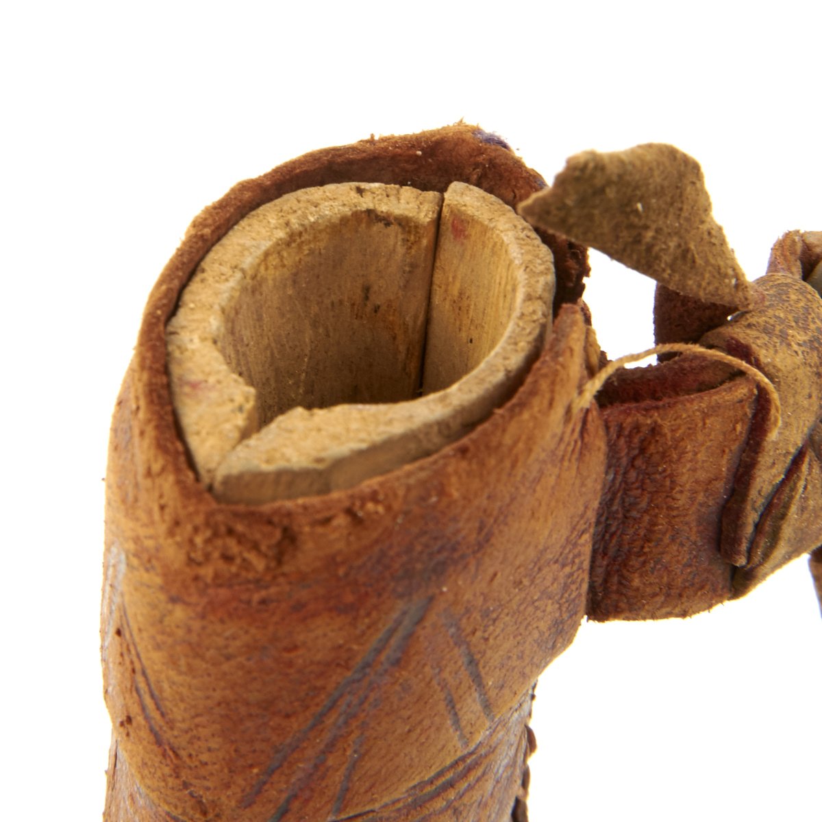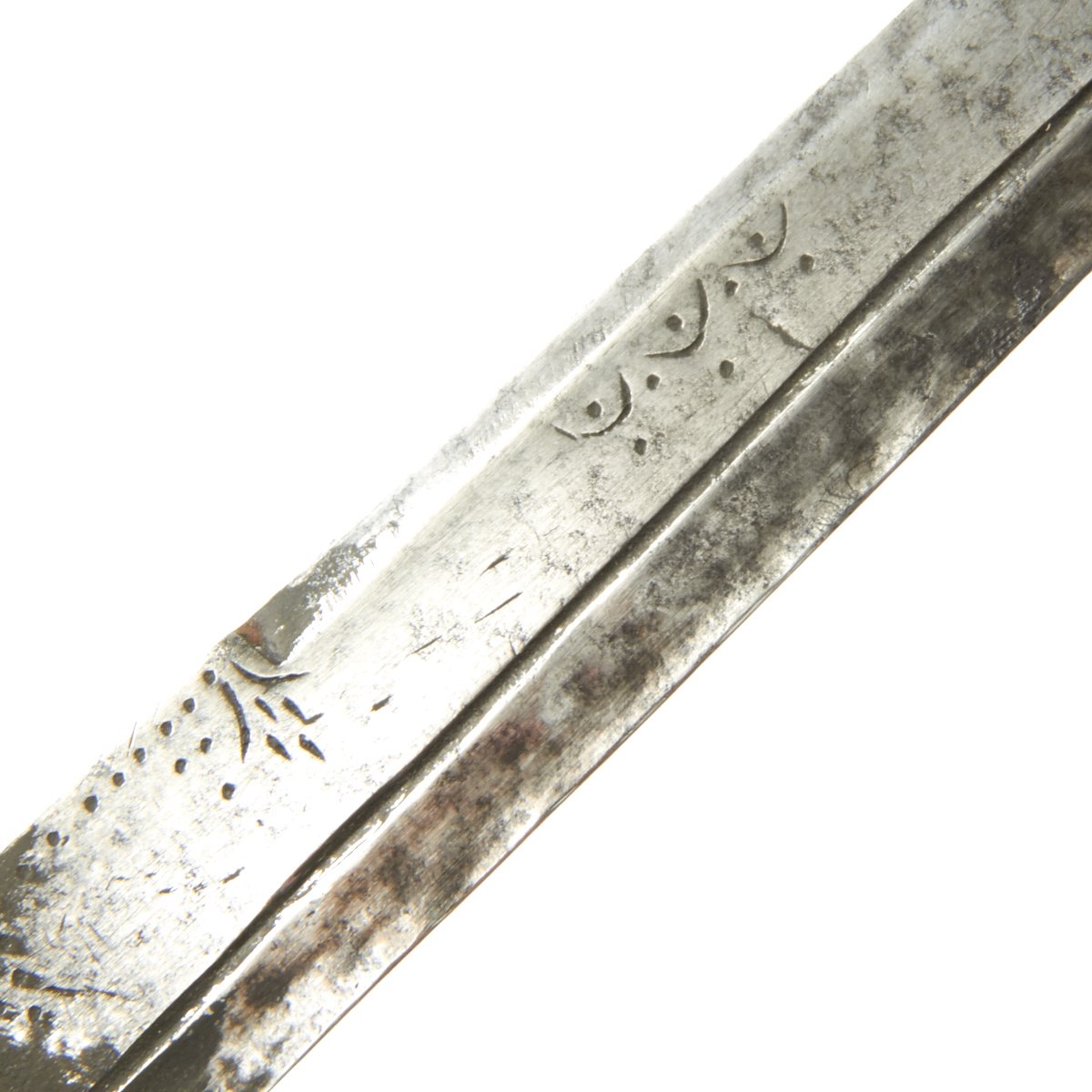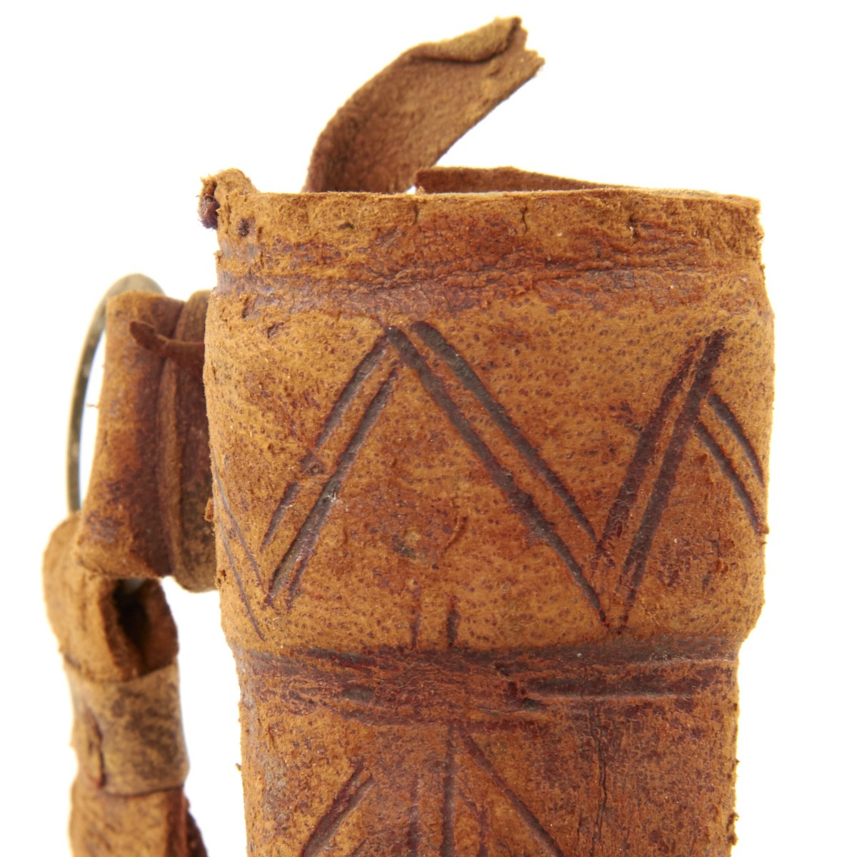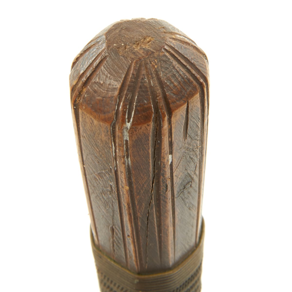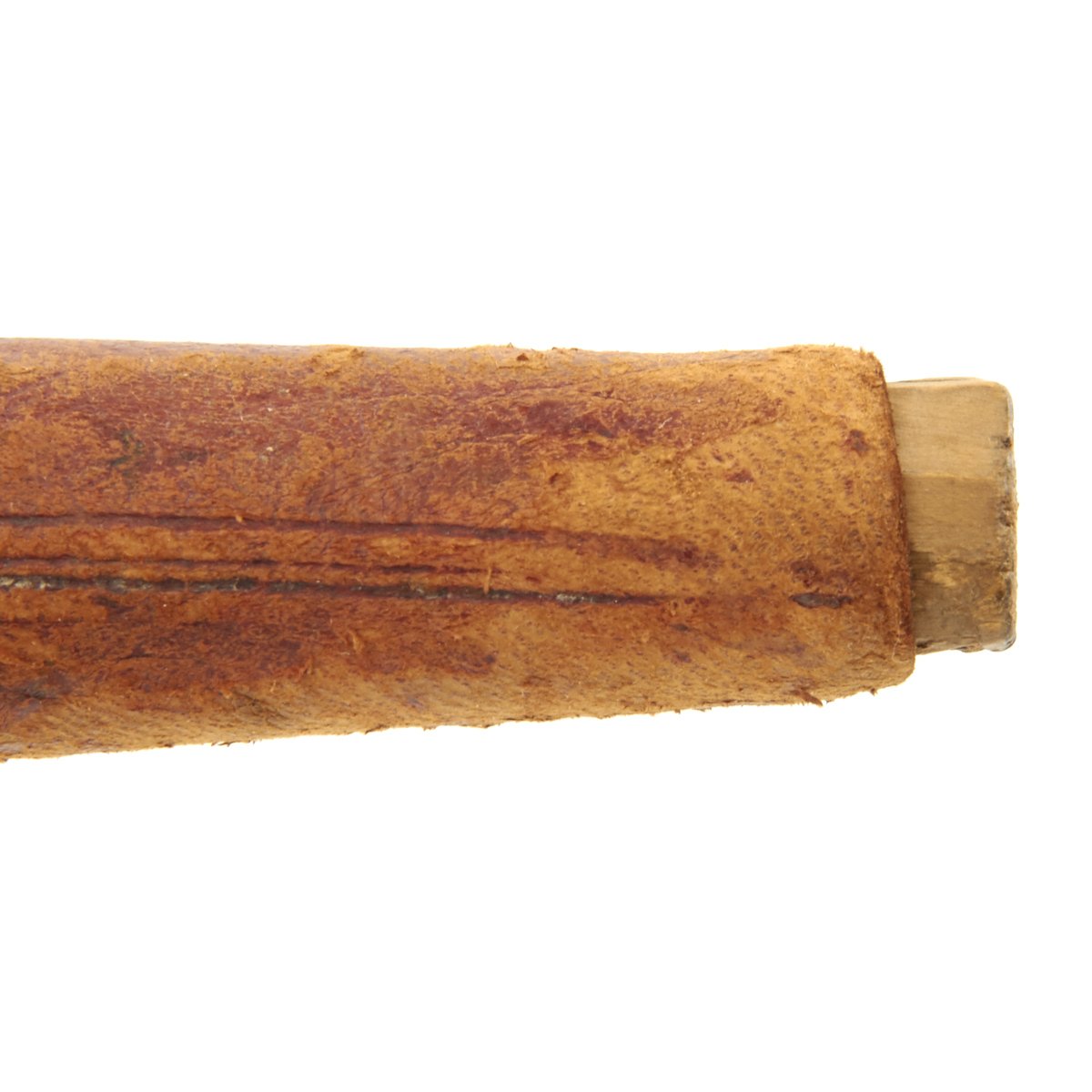 Original Item: Only One Available. This is a cute small dagger with a hand forged single-edged 6 1/2 inch long blade. It is equipped with an octagonal wood grip which has been bound in what appears to be brass wire, and measures 10 1/2 inches overall. Some decoration engraved on blade, which is contained in its original somewhat decorated tooled leather scabbard with wooden interior. Scabbard comes complete with wrist or hanging loop also of leather.