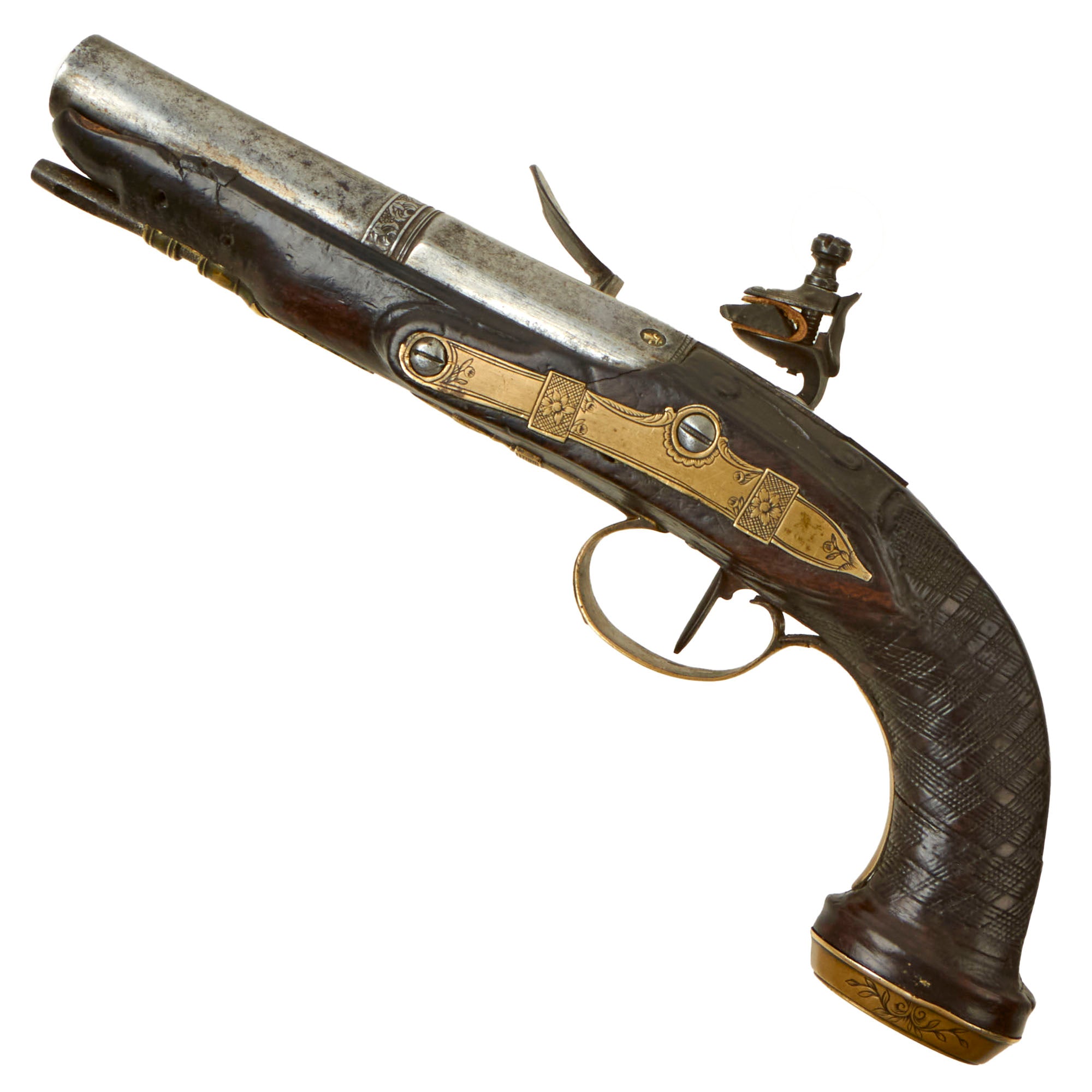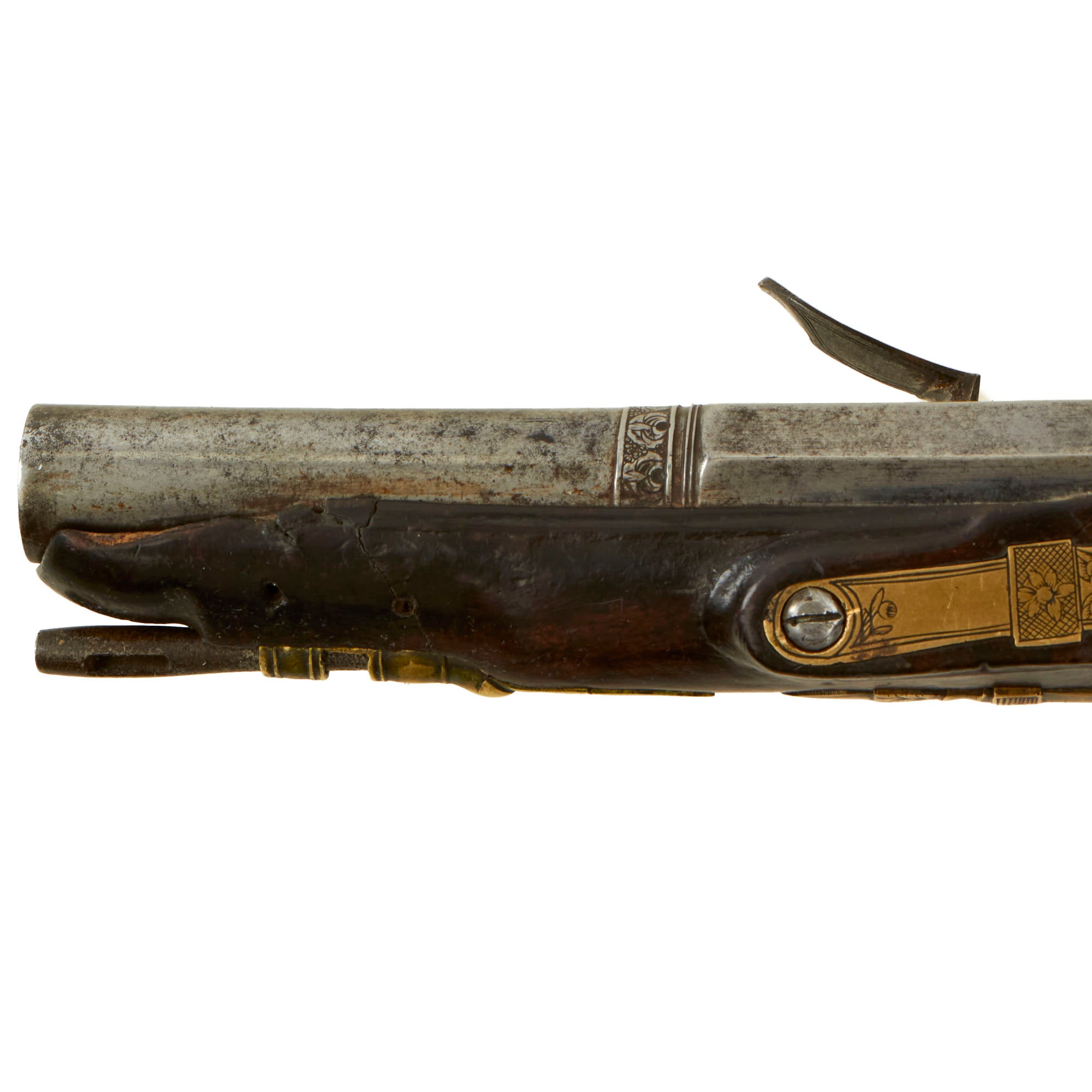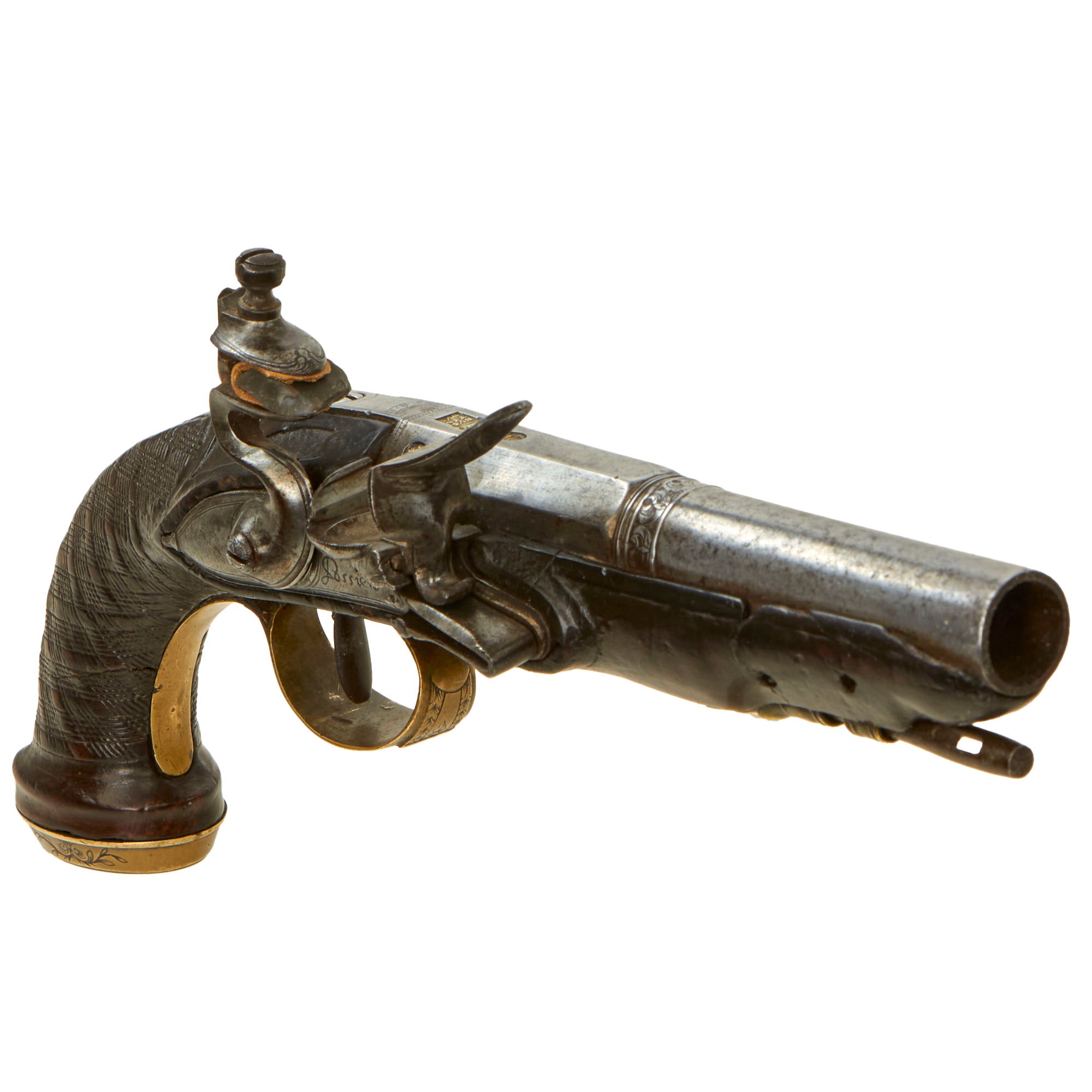 Original Item: Only One Available. This is a lovely little brass mounted flintlock pistol, which looks to have been made in Italy using a Spanish barrel, possibly from previously existing gun. Most Spanish pistols we have seen from the late 18th century used miquelet style locks, while this has an Italian flint lock, which even has a frizzen reinforcement bridle on the pan. The stock shows some lovely carving around the barrel tang, lock, and all of the fittings, making it quite lovely.