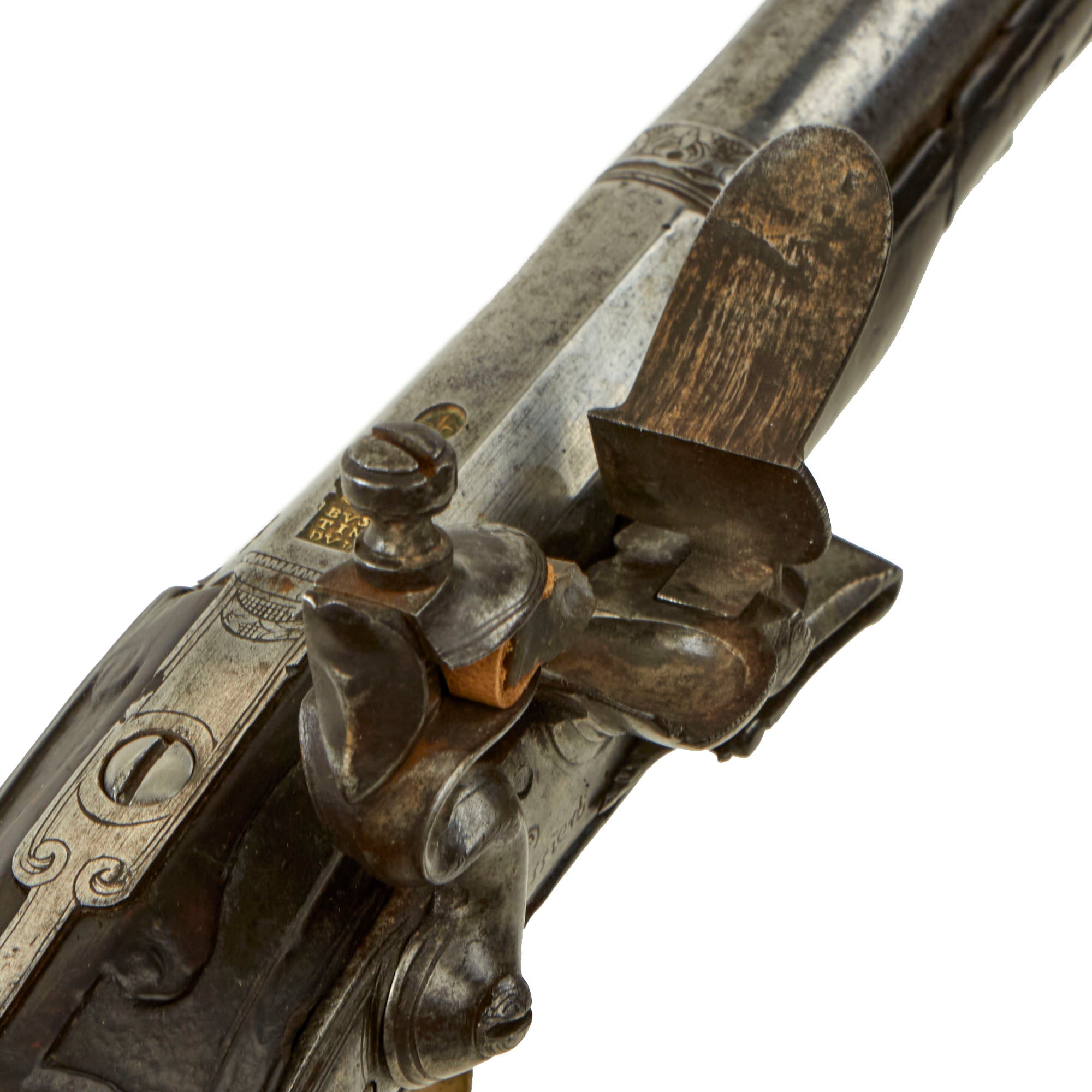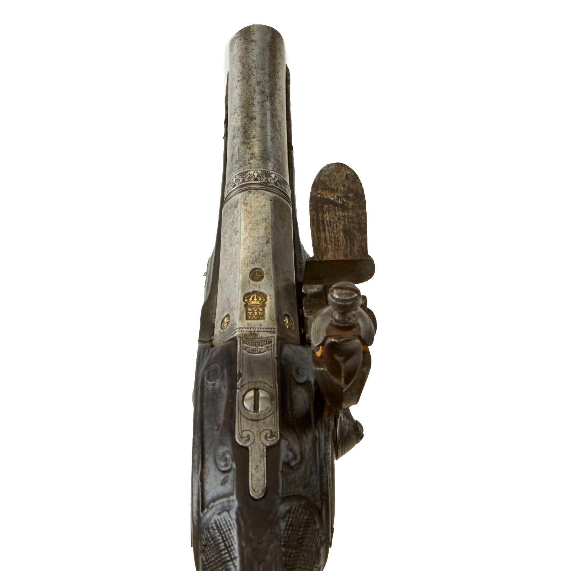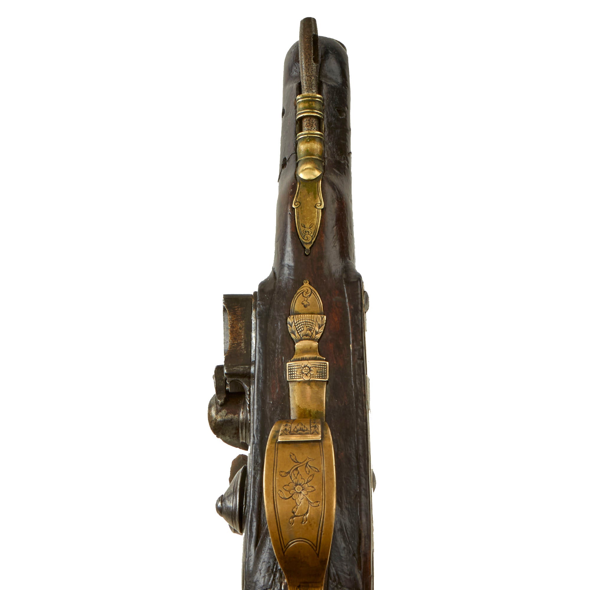 Original Item: Only One Available. This is a lovely little brass mounted flintlock pistol, which looks to have been made in Italy using a Spanish barrel, possibly from previously existing gun. Most Spanish pistols we have seen from the late 18th century used miquelet style locks, while this has an Italian flint lock, which even has a frizzen reinforcement bridle on the pan. The stock shows some lovely carving around the barrel tang, lock, and all of the fittings, making it quite lovely.