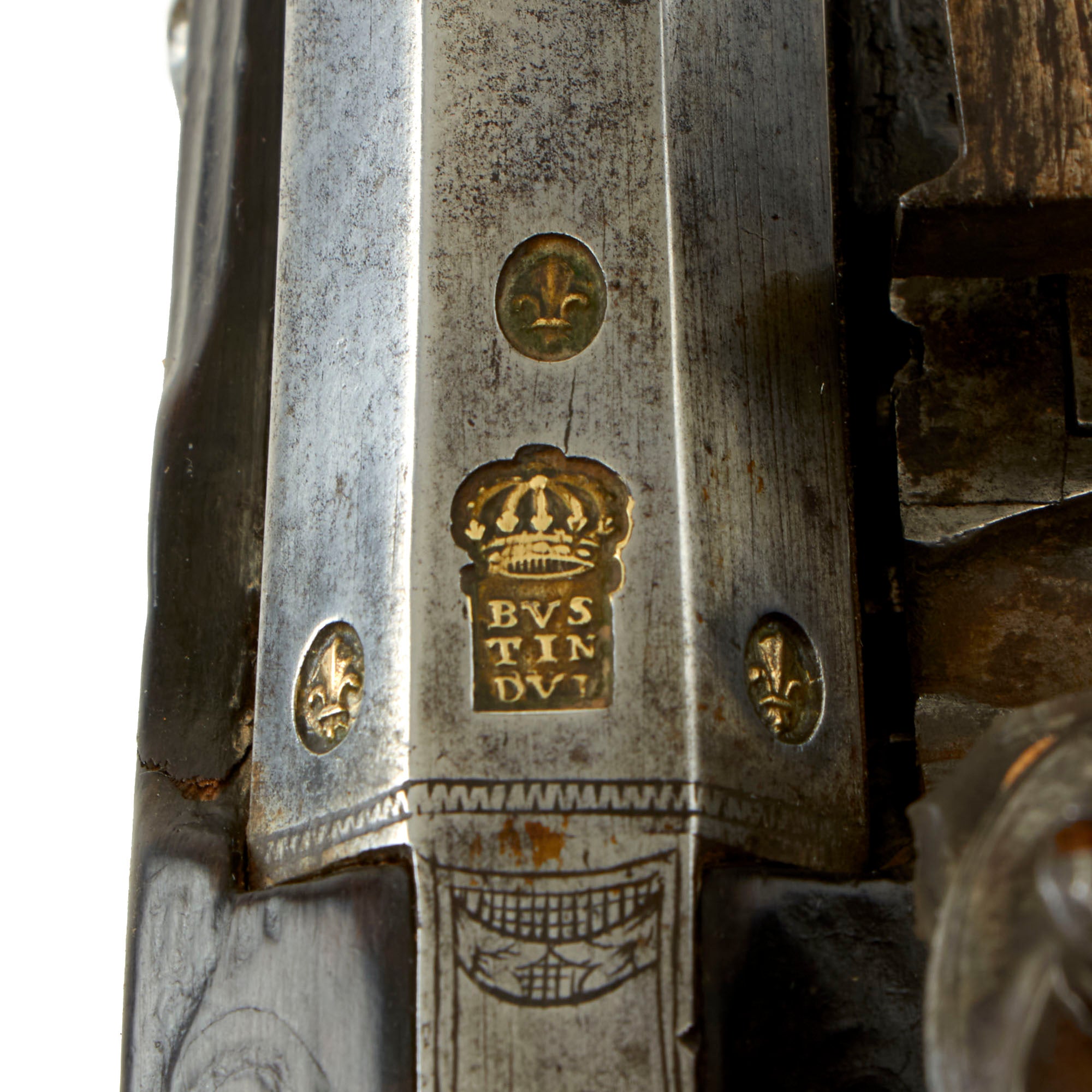 The lock plate is marked with stylized name Possiero, who research shows was an Italian maker, though there is very little information on them. The facets on the top of the barrel show three stamped Fleur-de-lis proofs covered with gold, with a recessed gold plated touch mark on the top that reads: