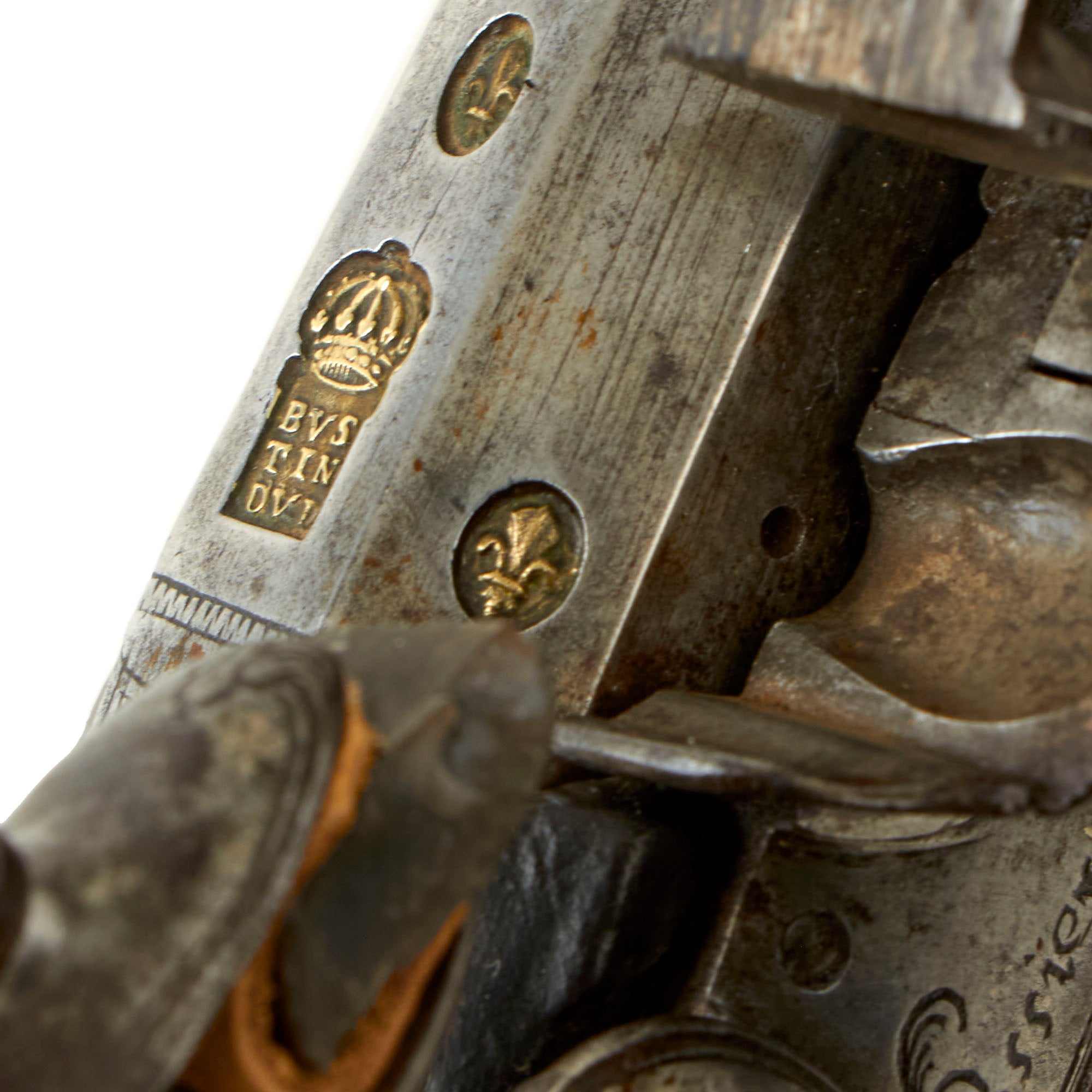 "Bustindui" is a very well known name in the Spanish gun-making city of Eibar, with multiple known members, including Jusepe, Juan Esteban, and Agostino. Often there would be an abbreviation above their name indicating which member of the family it was, however this example does not have any such marking. Definitely some very nice research potential in this pistol!