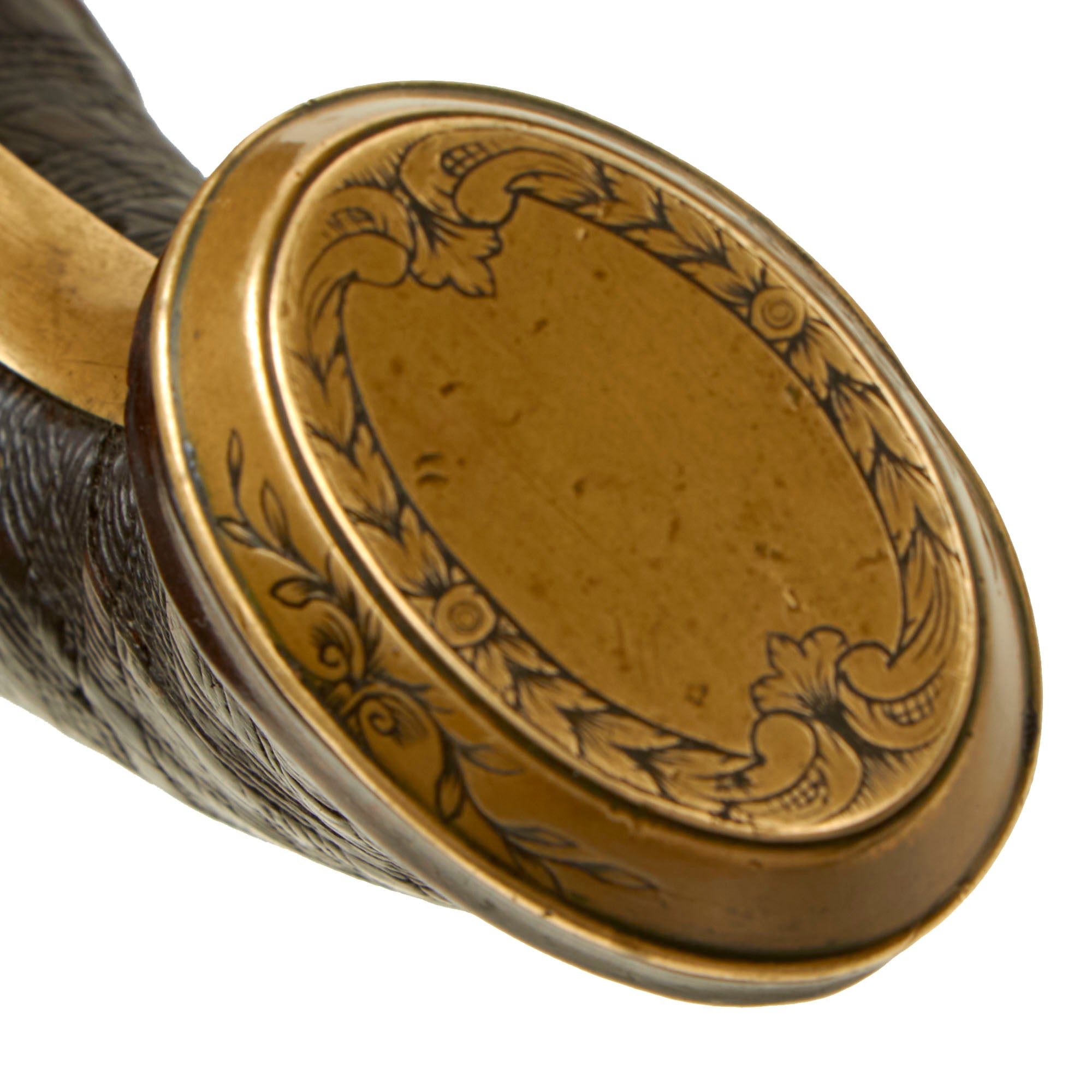 The pistol has an overall length of 10 inches, and is fitted with a 5 1/4 inch smoothbore barrel with a caliber of approximately .62". There is an iron cleaning rod under the barrel, which is most likely not original, as we would expect a ramrod for a muzzle loader. The two stage part octagonal barrel shows a lovely aged polished patina, with some lovely engraving near the change from octagon to round. The brass fittings have a beautiful mellow glow, with some fantastic engraved designs on all. Definitely must have taken sometime to complete all these fine ornamentations!