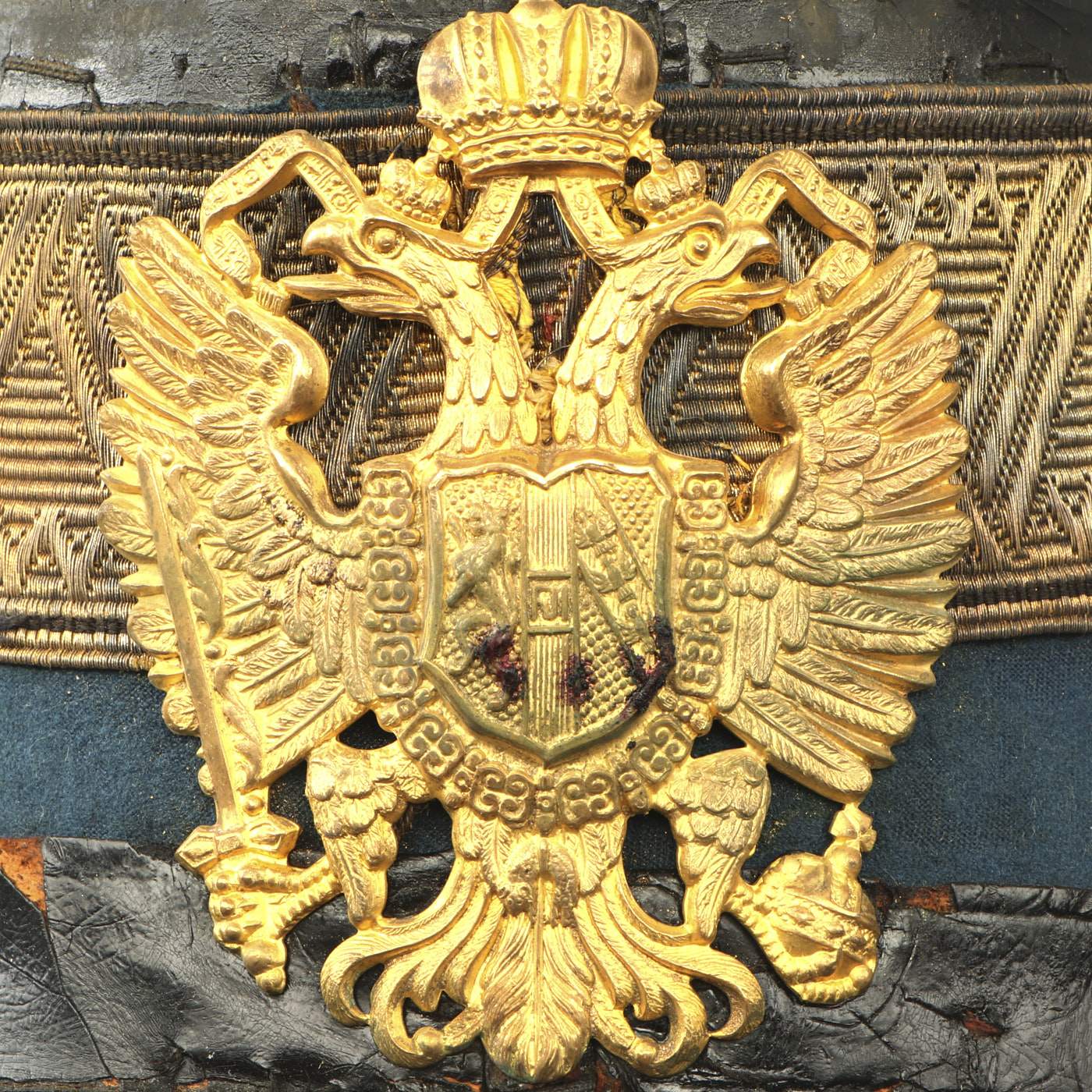 The helmet's Wappen (Front Plate) Shows the Austrian Imperial Double-headed Eagle holding a sword and orb in its talons. The central Escutcheon shows the marshaled arms of the Habsburg, Babenberg and Lorraine houses, with FJI in the center, for Franz Joseph I of Austria. He was Emperor of Austria from 1848 until his death in 1916.