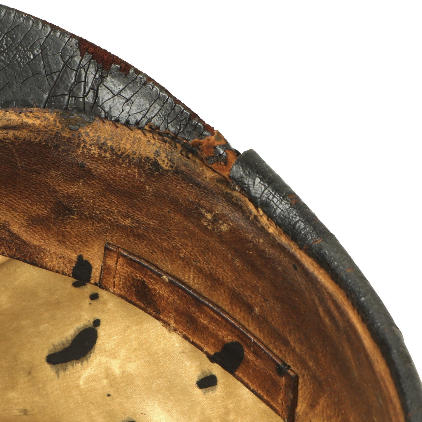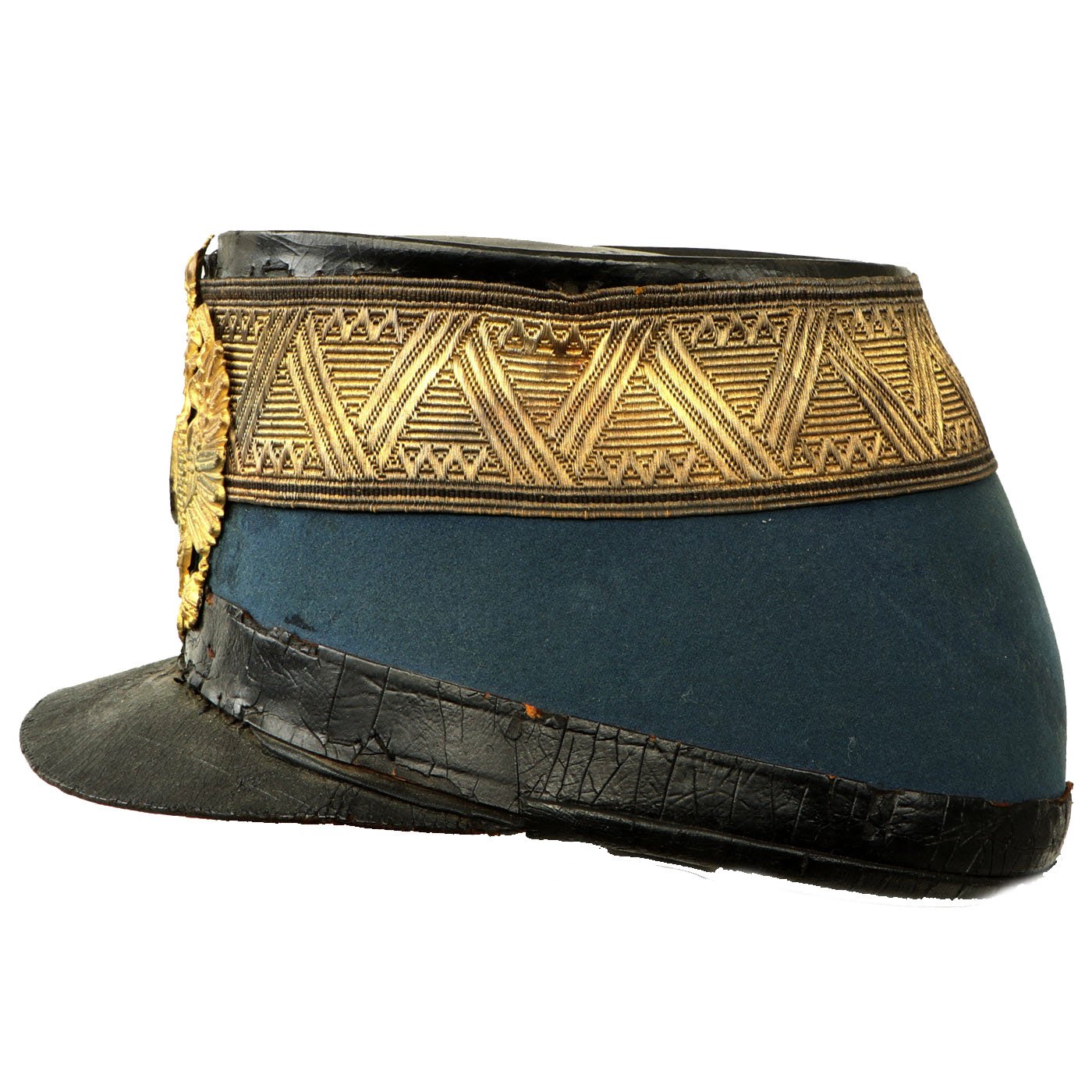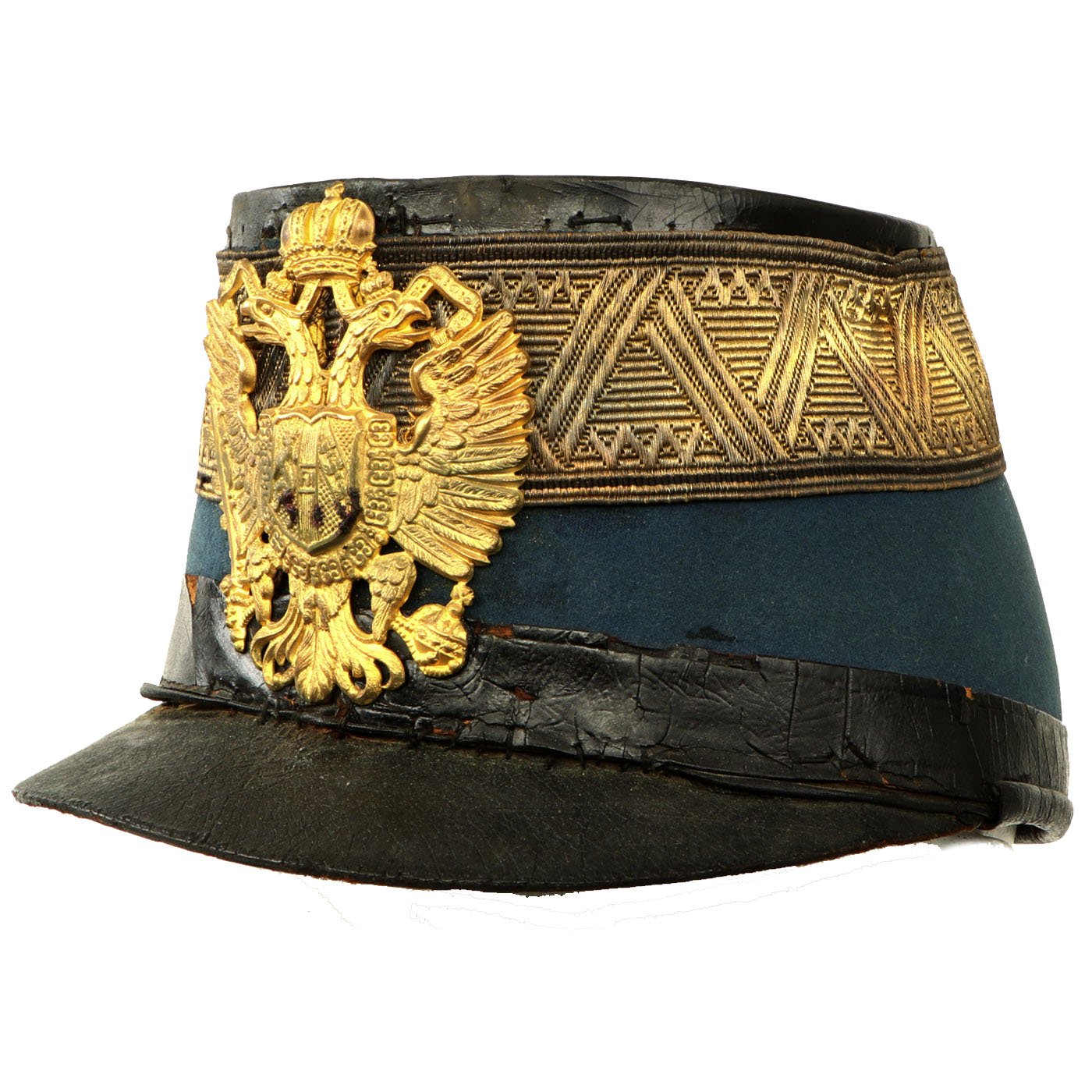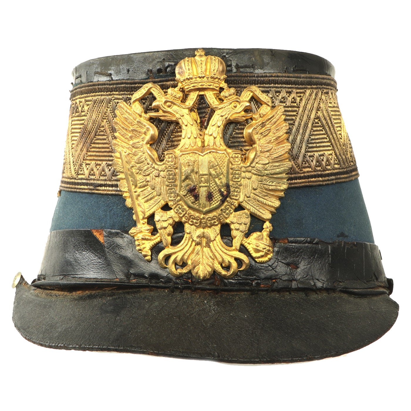 Original Item: Only One Available. This very nice Imperial Austrian Shako features a blue felt body with black leather crown, band and visor. Has single wide band of gold braid around the base of the crown, indicating officer issue.