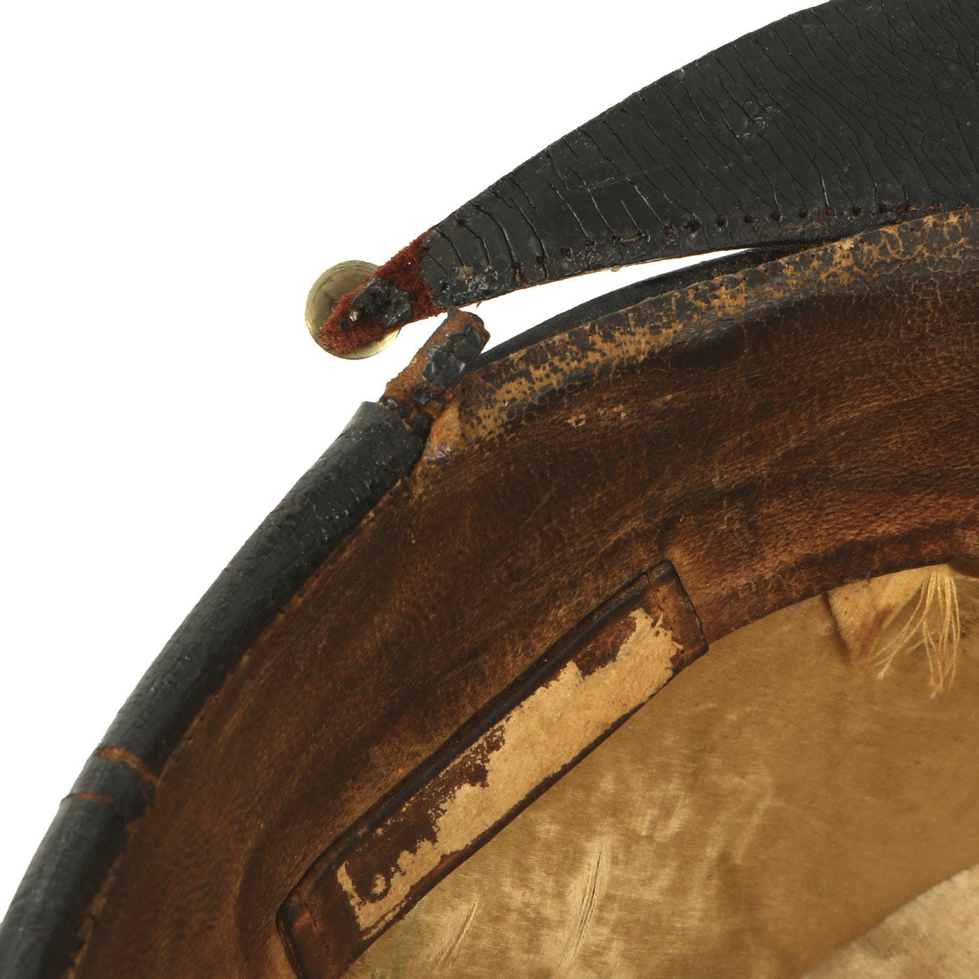 The interior is lined with white silk and has leather sweatband. There are some attachment points on the inside for a chin strap.