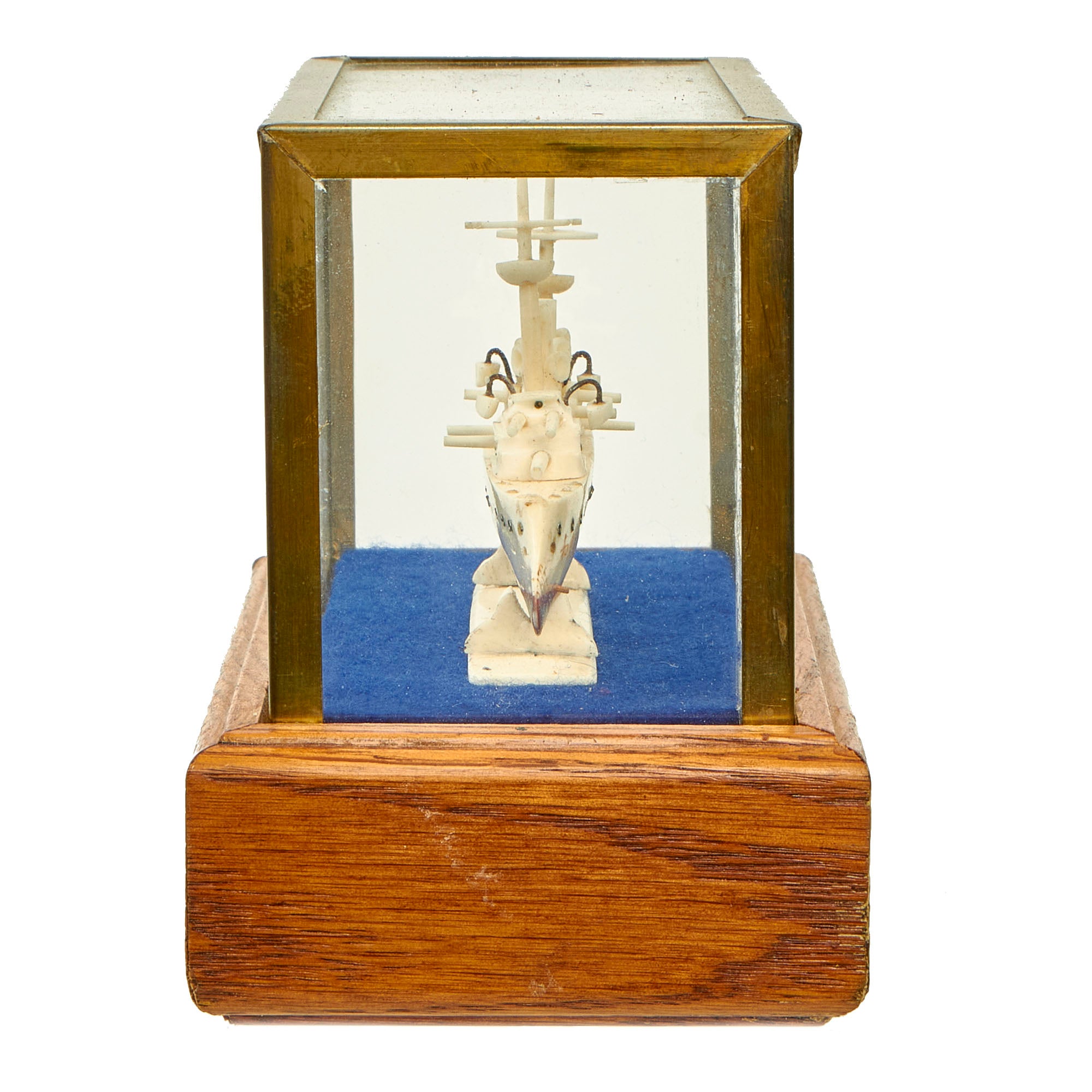 The ship is attached to a lovely whalebone stand, which is itself attached to a modern felt-padded wooden base, which has a brass glazed glass cover to keep the dust off. The base measures about 5 3/4" x 3 1/4", and measures 4 1/4"H with the cover on.