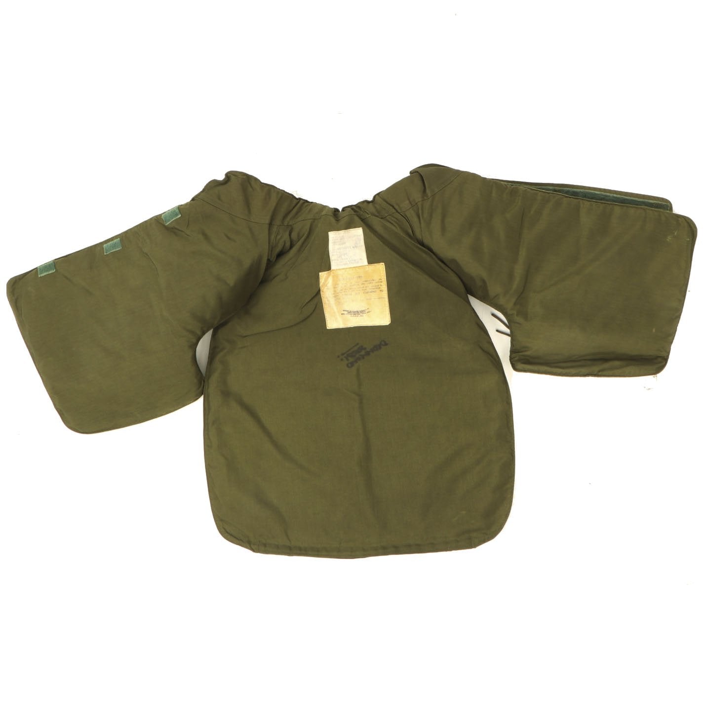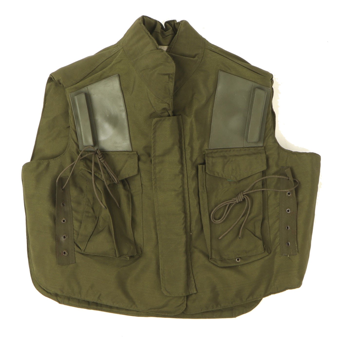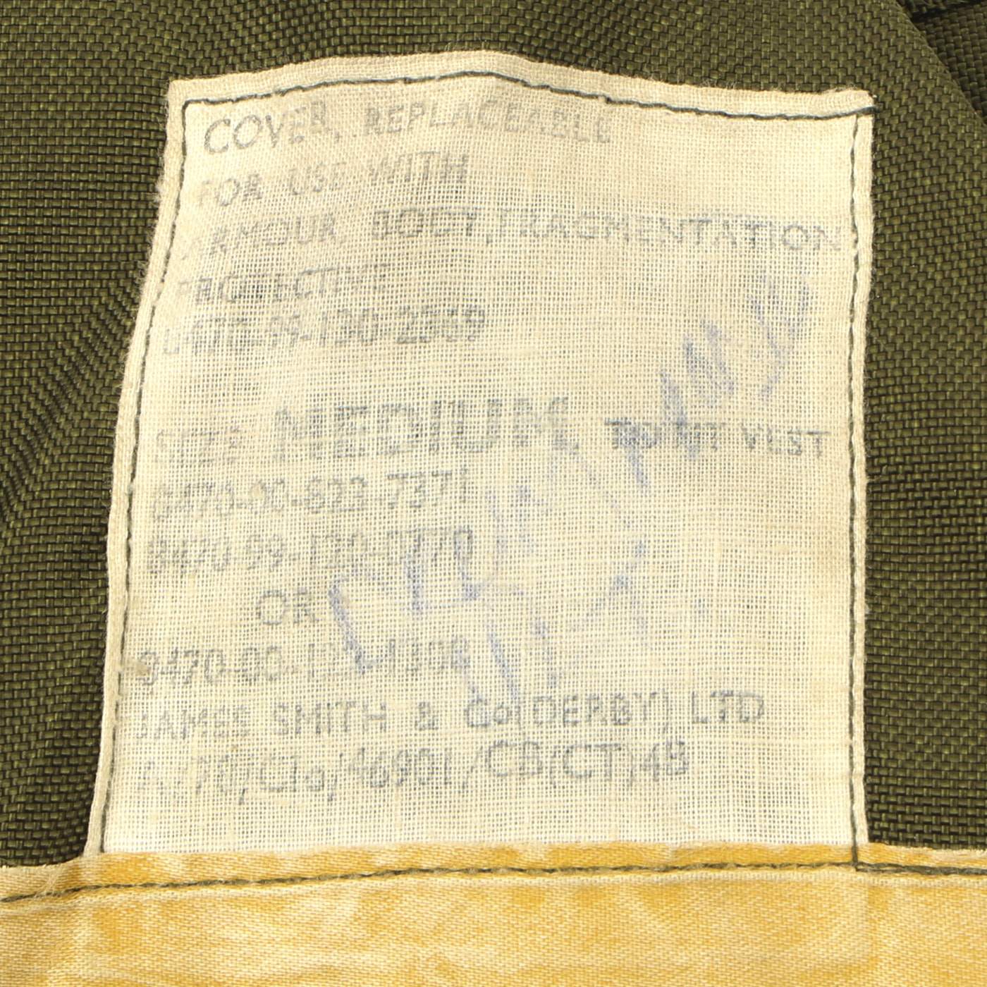Original Item: Only One Available. This is an excellent condition ARMOUR, BODY, FRAGMENTATION, PROTECTIVE in a size MEDIUM. Manufactured by JAMES SMITH & Co (DERBY) LTD.. These are bulletproof with included hips drawstrings (untied), sturdy front hook and loop closure, with front two pockets. It also has two nice rubber pads with "bumpers" on the front, which we assume is to help keep straps in place.