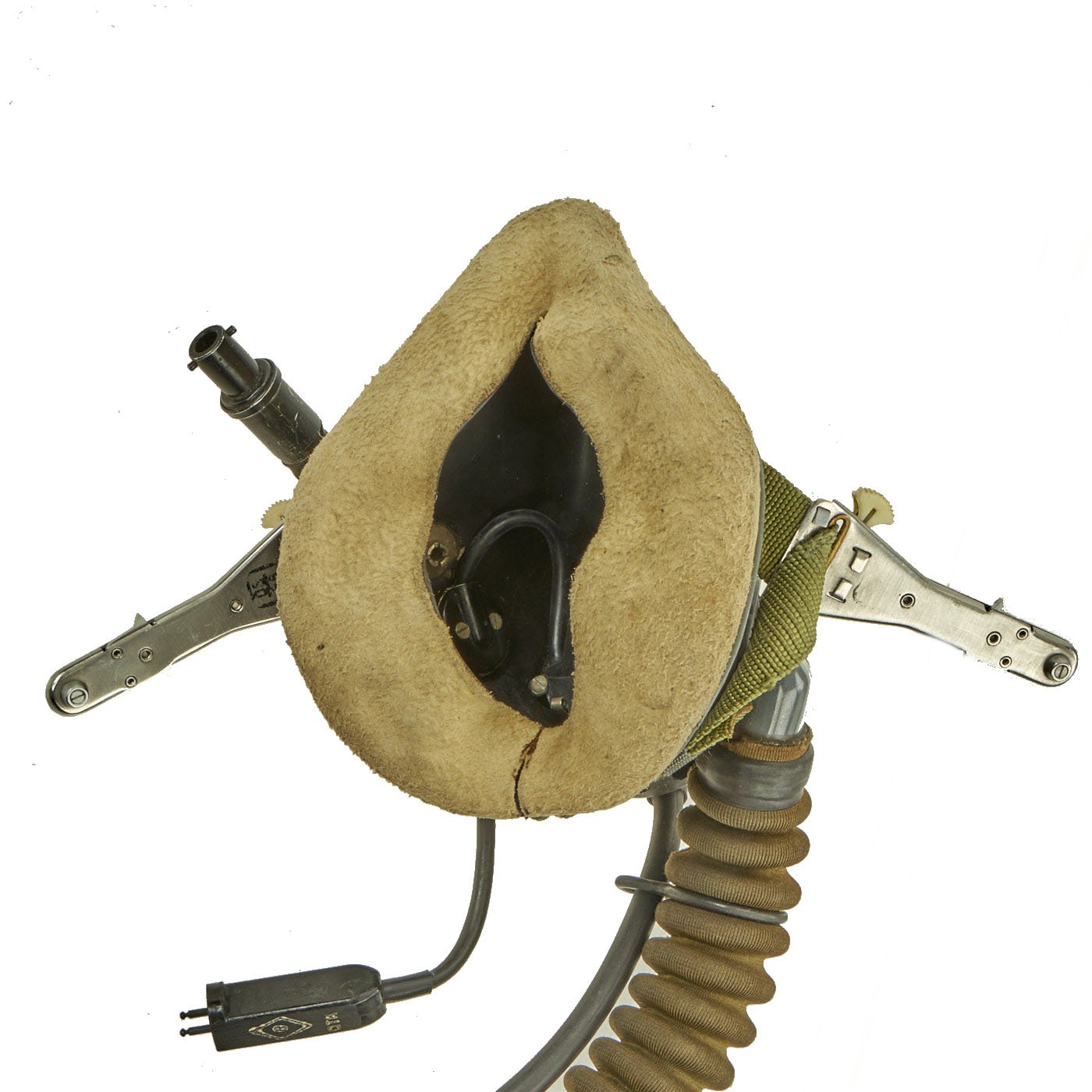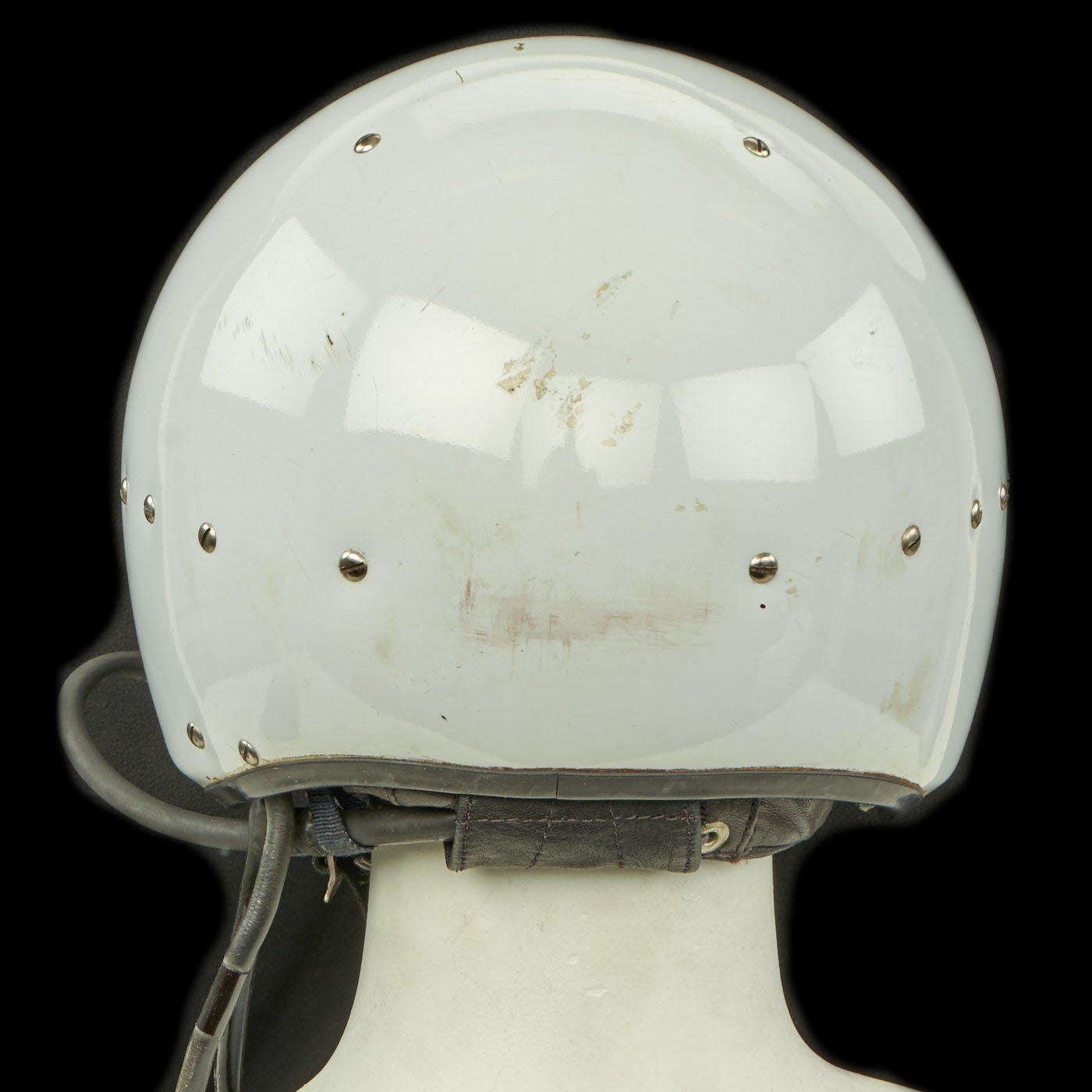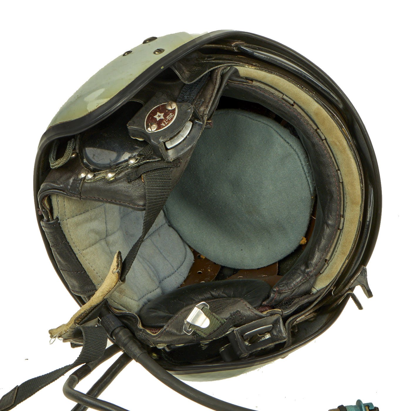 This example is equipped with a tinted visor, and the correct KM-35 oxygen mask with microphone, as well as the standard avionics. The helmet still has an intact label on the inside under the right earpiece: