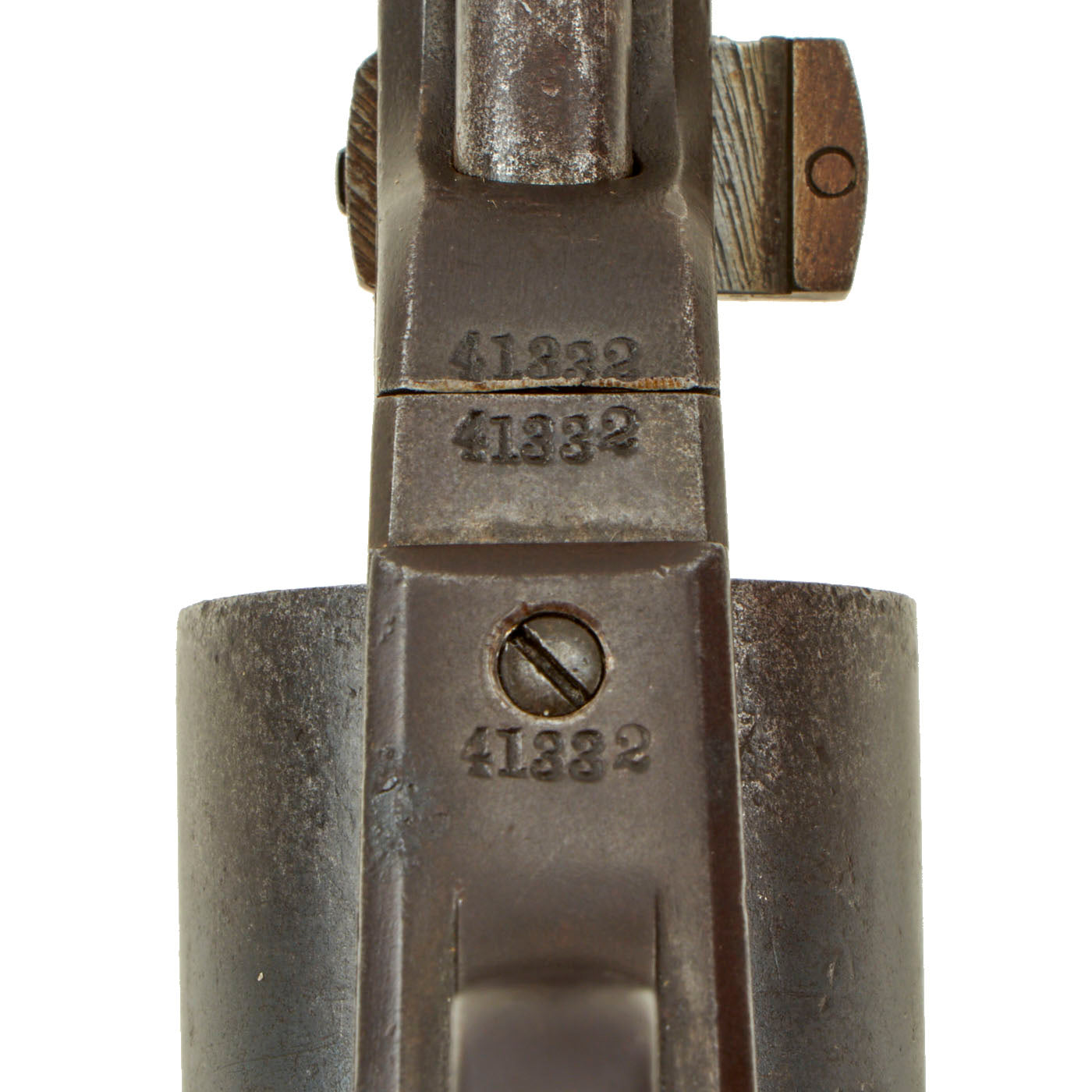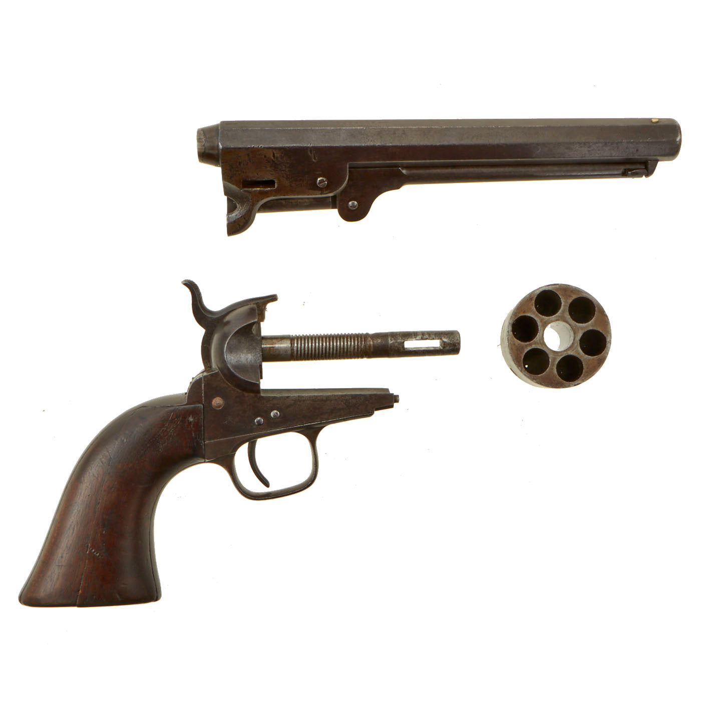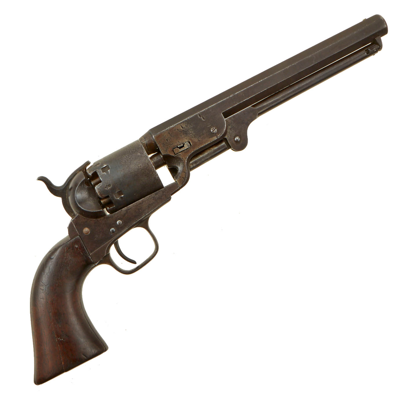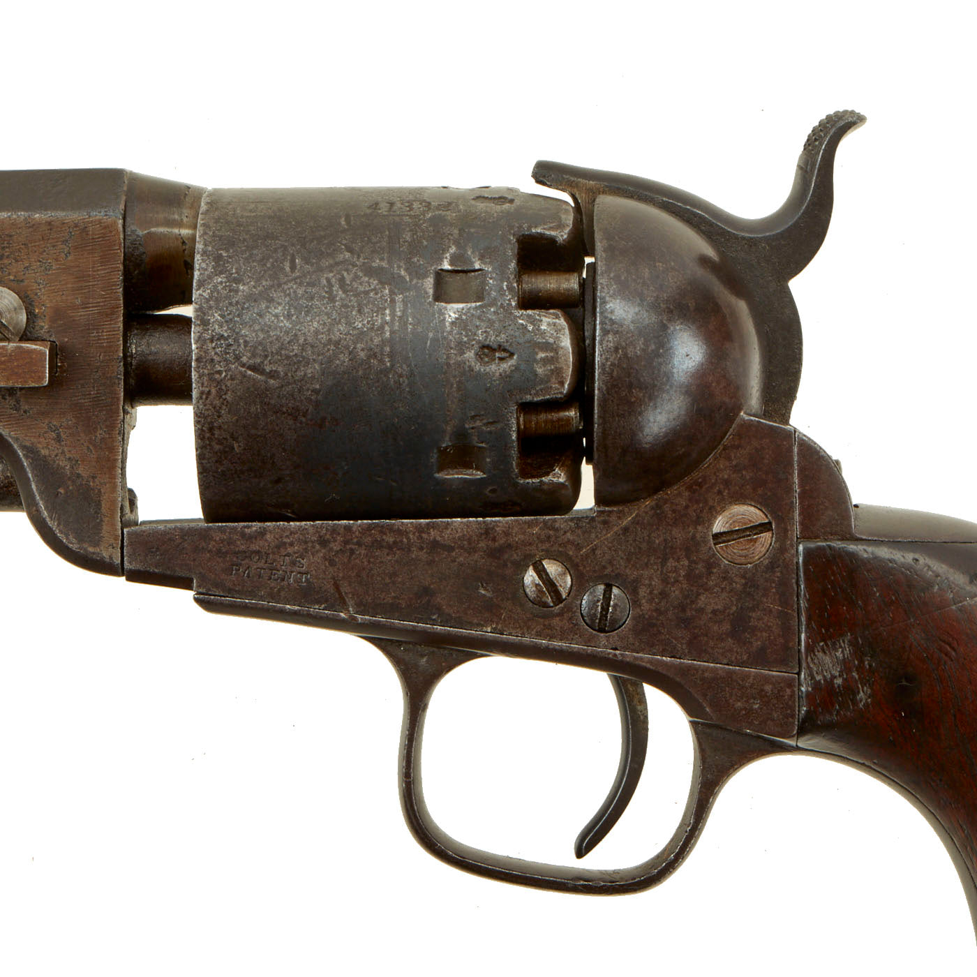 Original Item: Only One Available: This is a very nice and interesting LONDON marked Colt Model 1851 Navy percussion .36 caliber revolver, in truly excellent shape. It has some scattered old pits but otherwise it is a crisp and most attractive revolver. The Naval Battle Cylinder scene is still much apparent, as is the COLTS PATENT marking on the frame. The revolver also shows MOSTLY MATCHING serial # 41332 on the Barrel, Grip, Frame, Cylinder, Loading Rammer, Cylinder Arbor Pin (332), and trigger guard. Only the barrel wedge is not matching, and looks to be an unmarked period replacement.
