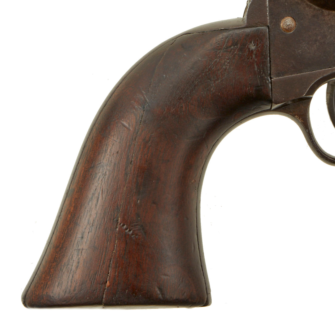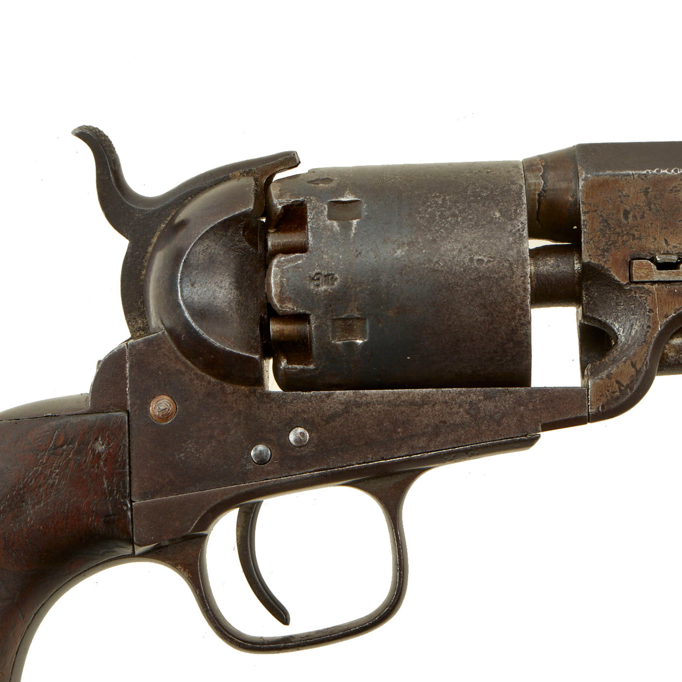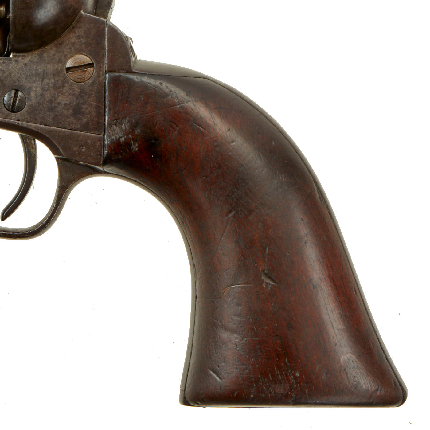 In very nice shape, the grips look both wonderful and totally original, with great grain and a nice oiled finish from years of use. The revolver cycles correctly, with a strong trigger pull and good cylinder lock up. As with any revolver of this age though, it can be finicky. The bore has clear lands and grooves, and a partly bright finish, showing past overall oxidation and fouling, now removed.