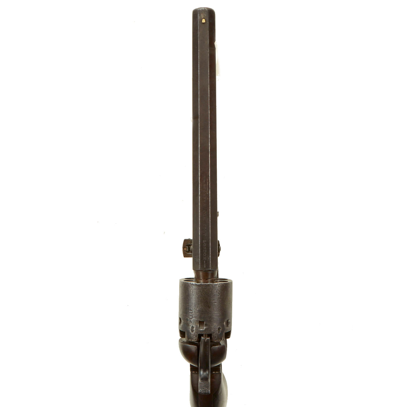 Actual production started in 1852 in London and stopped at the end of 1855. Thereafter LONDON Marked Colt Revolvers were prepared in the United States and shipped over as required, the serial number ranging from about 15,000 at the close of the London production line and in 1856 around 40,000 for those made in the U.S. for the London market with London Markings. This revolver bears London Proof Marks but is a RARE LONDON marked Navy made in the U.S.