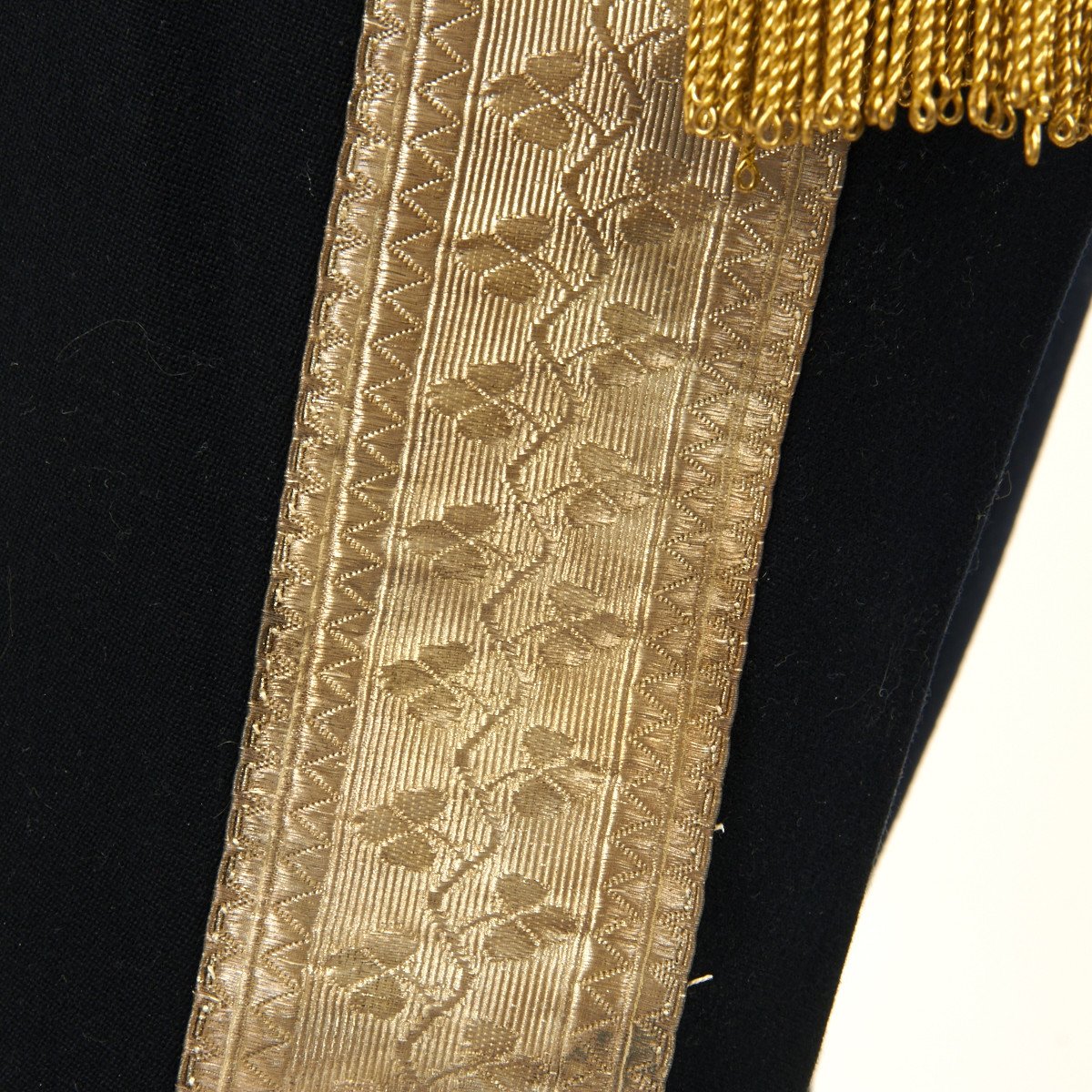 Pair of coveralls (trousers) of very dark navy blue with wide silvered embroidery stripe down the outside of each leg.