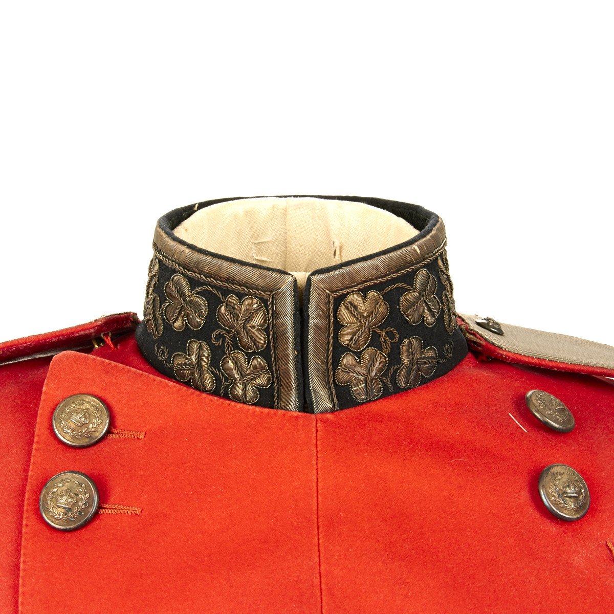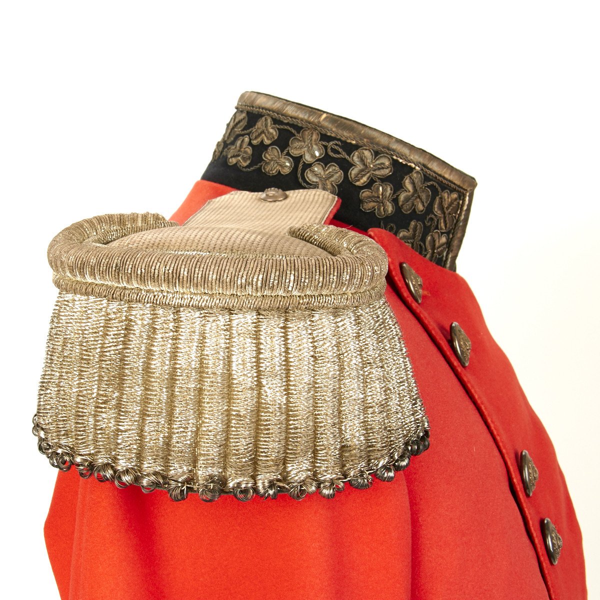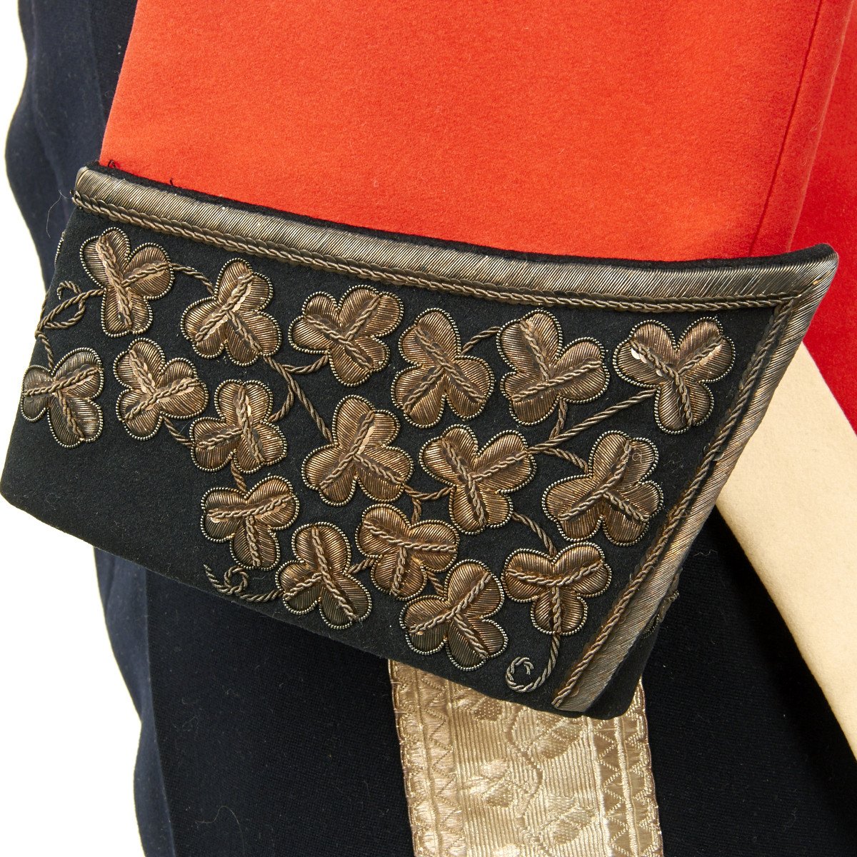 Red Melton cloth tailed frock coat of King George the Third era design, complete with blue collar and cuffs embroidered with silver wire shamrocks.