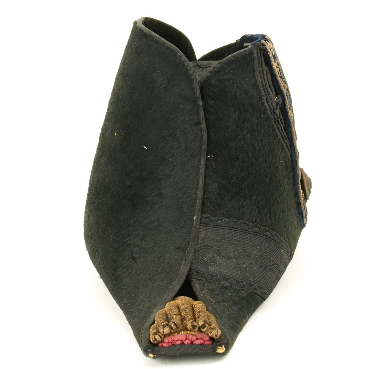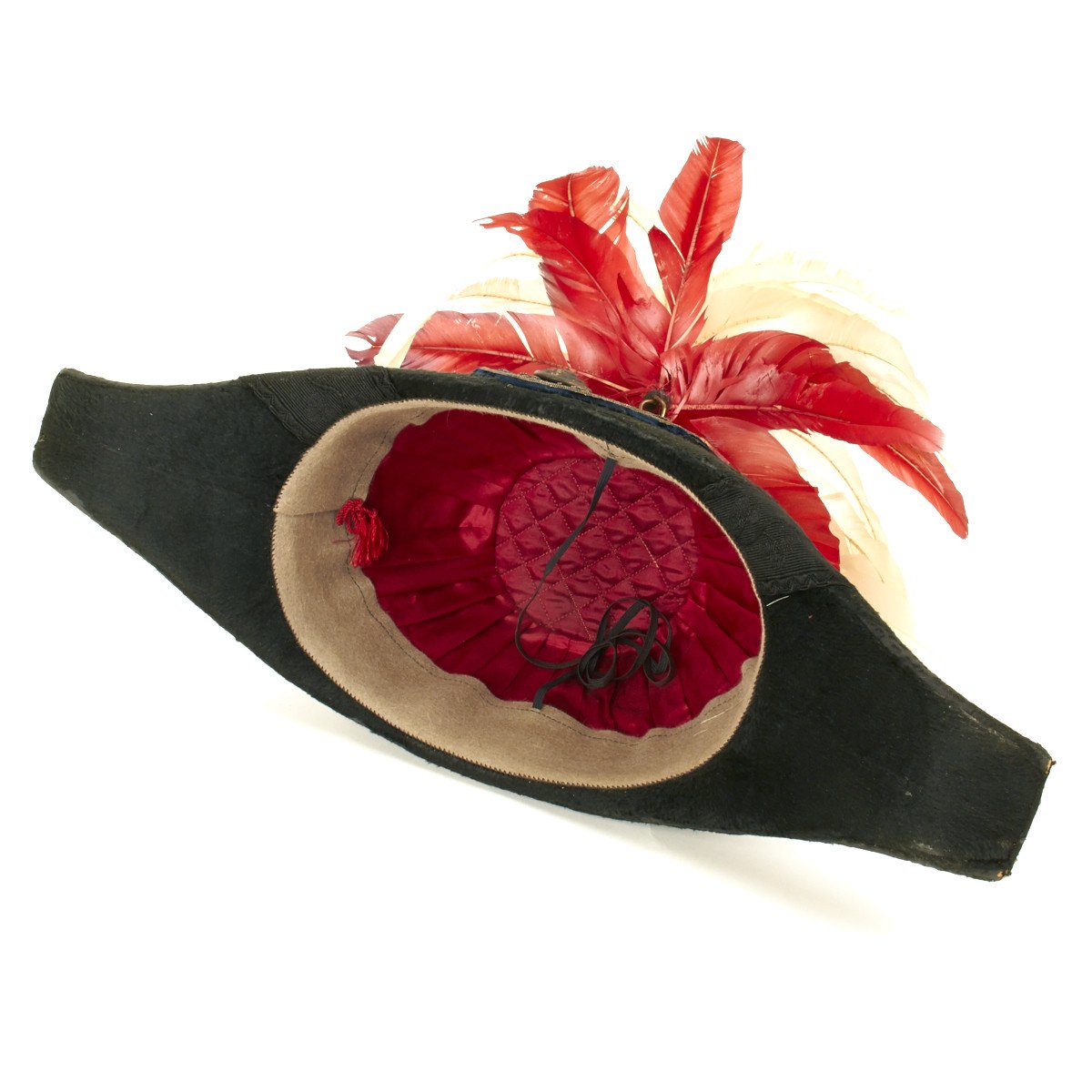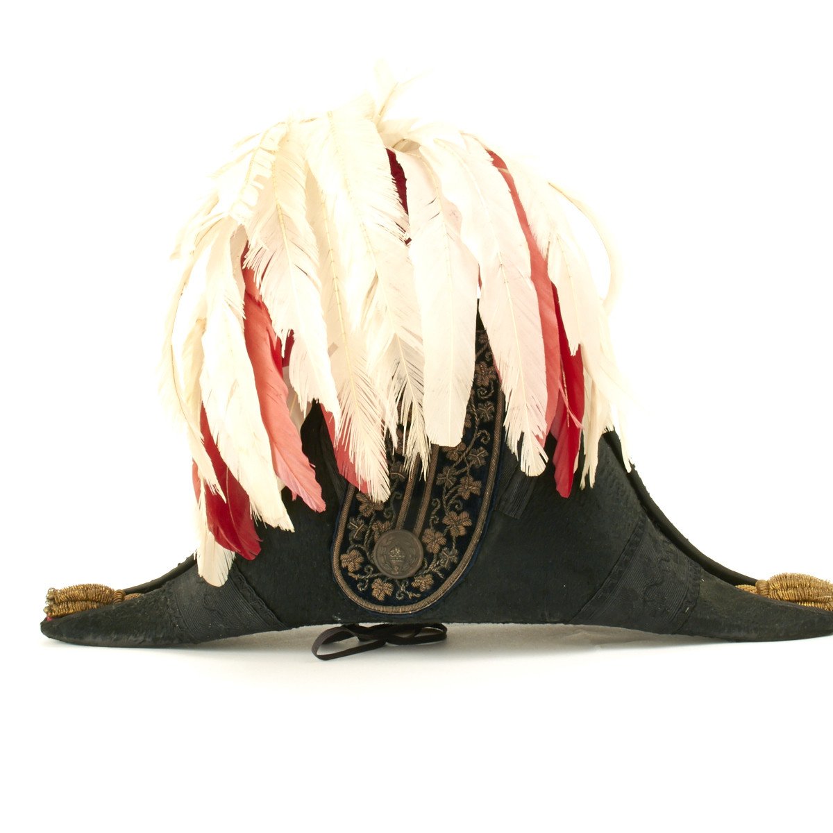 Bicorn hat similarly embroidered constructed of beaver pelt with red and white feather plume.