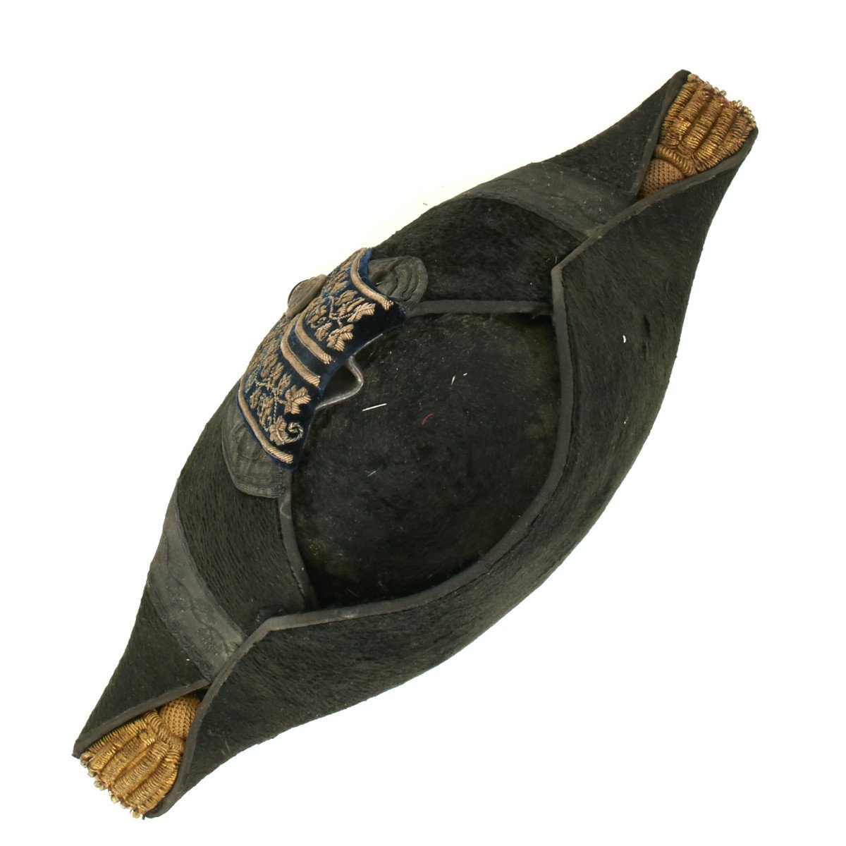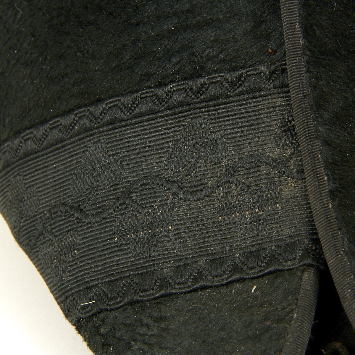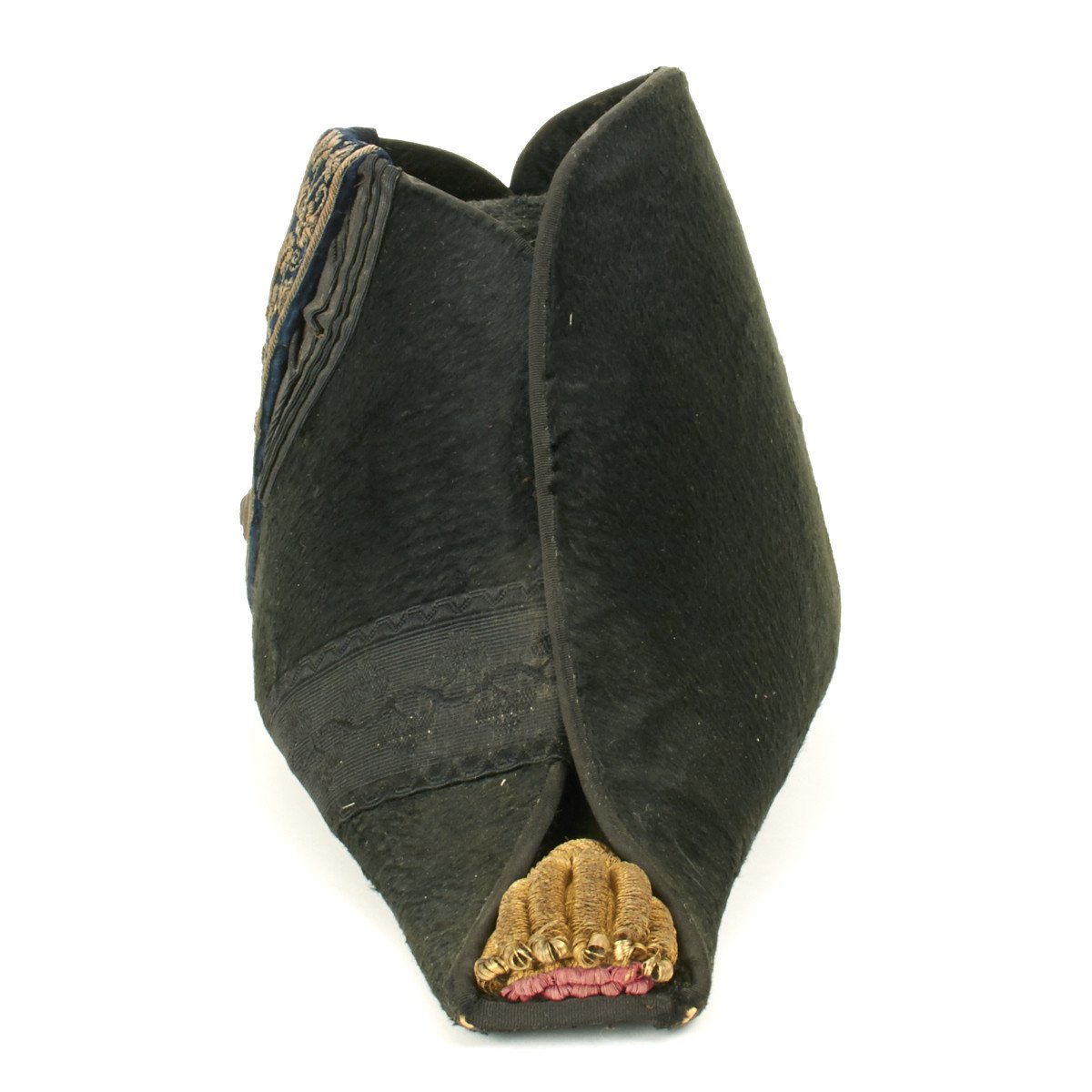 Bicorn hat similarly embroidered constructed of beaver pelt with red and white feather plume.