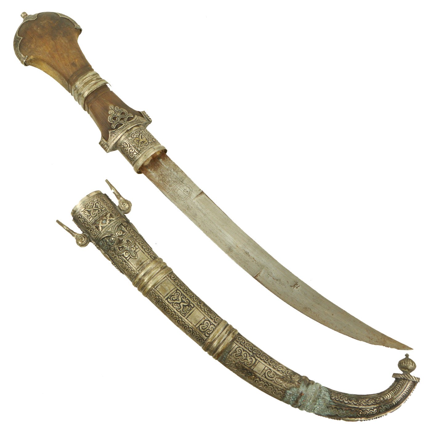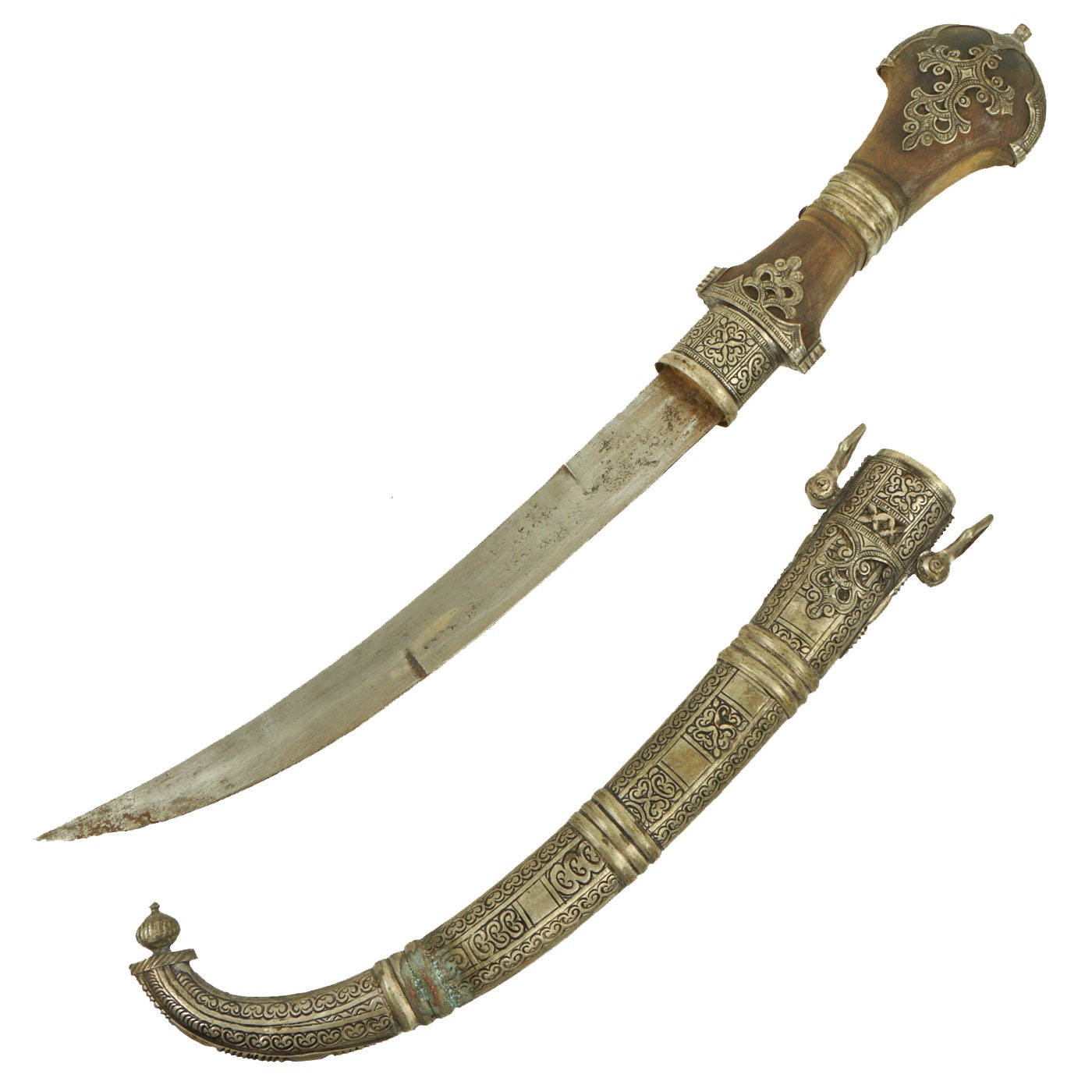 - One Original 19th Century North African Silver Mounted Jambiya Dagger with Silver Clad Scabbard. Measures 16" overall with a 9 1/2" blade.