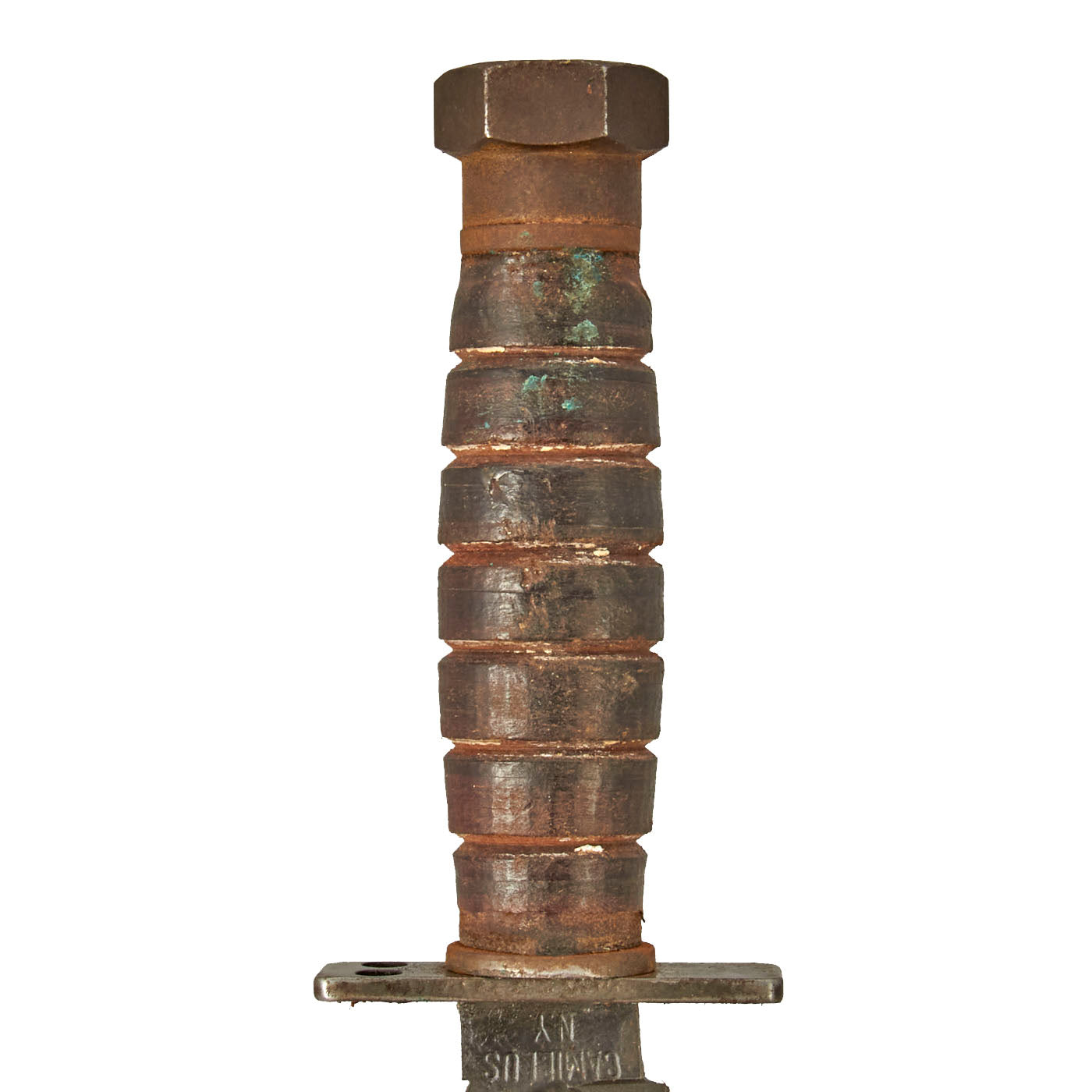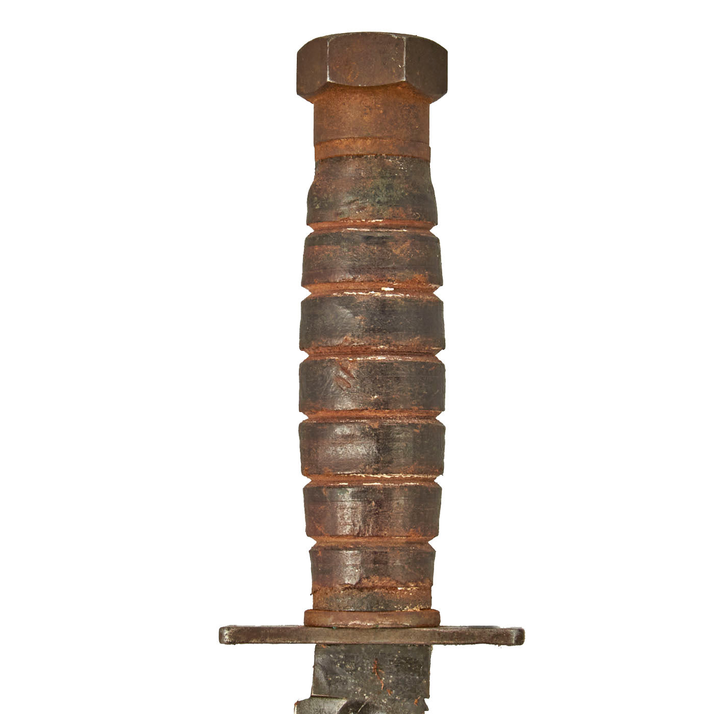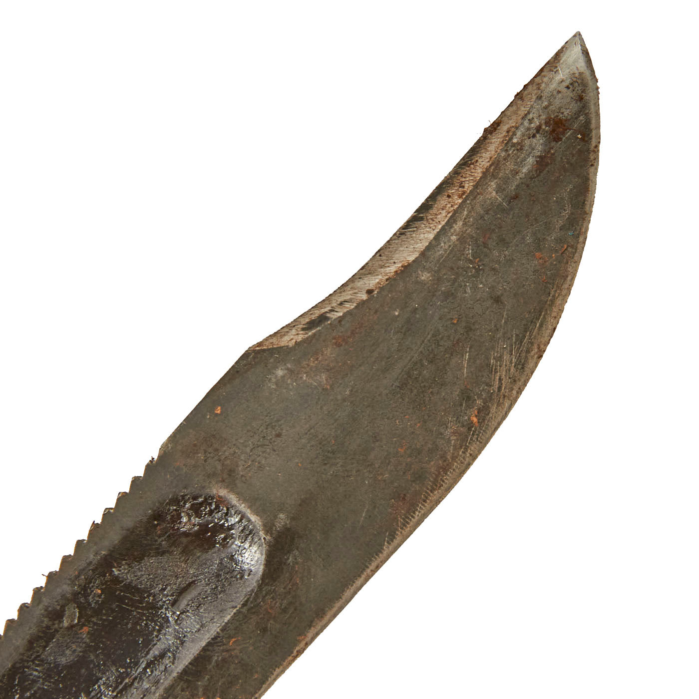 The blades are in very good condition, showing light wear from the scabbard, use, and sharpening. Both still have much of their original blued and parkerized finish , and the blades still have the original profile, though the tip does have a bit of rounding. The stacked leather grip is in very good shape, showing little sign of use. Both exhibit wear and light corrosion as pictured.