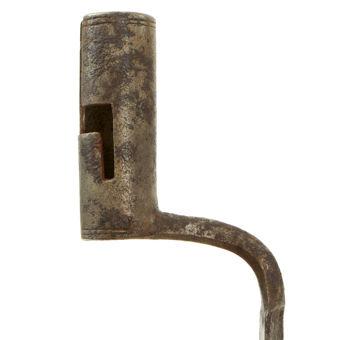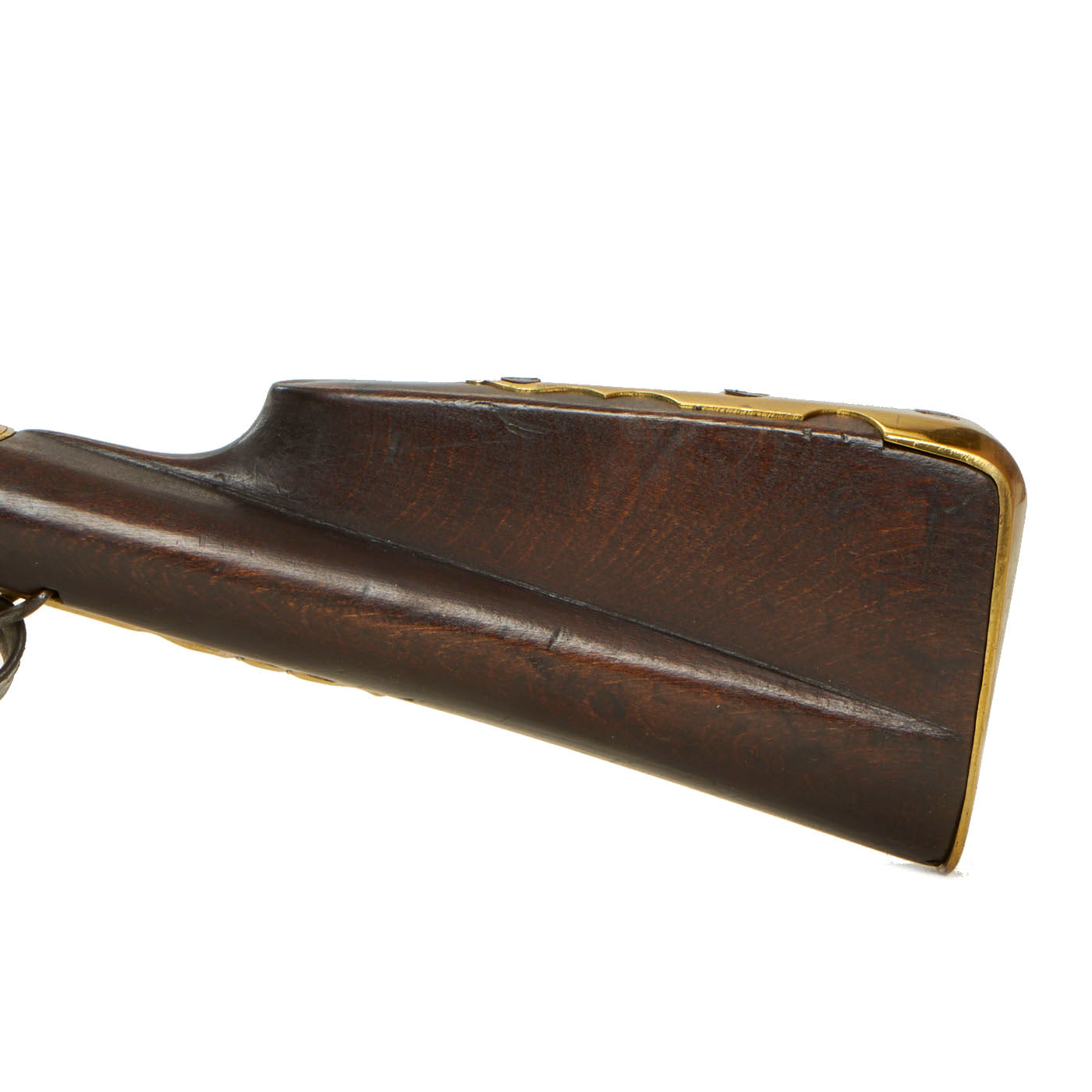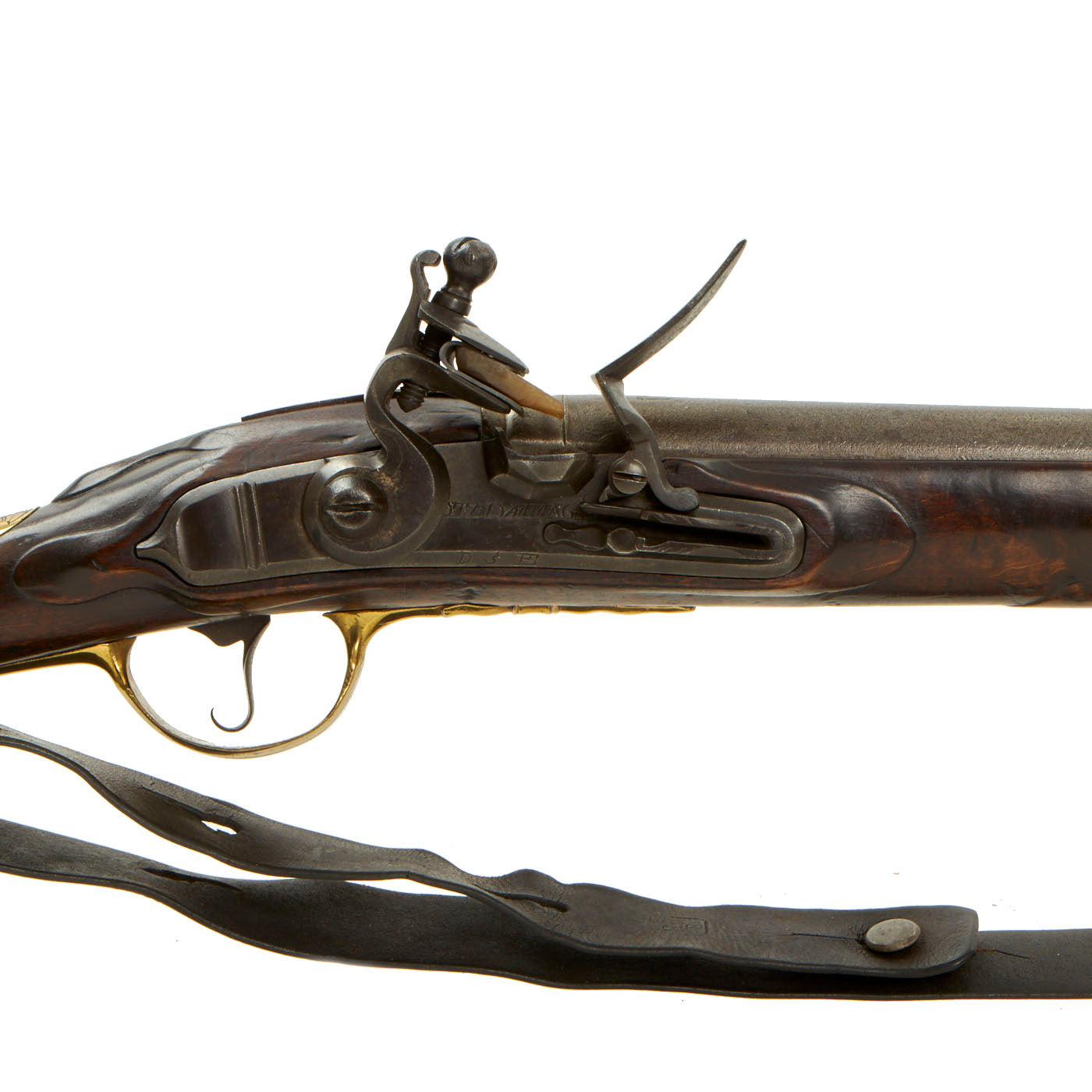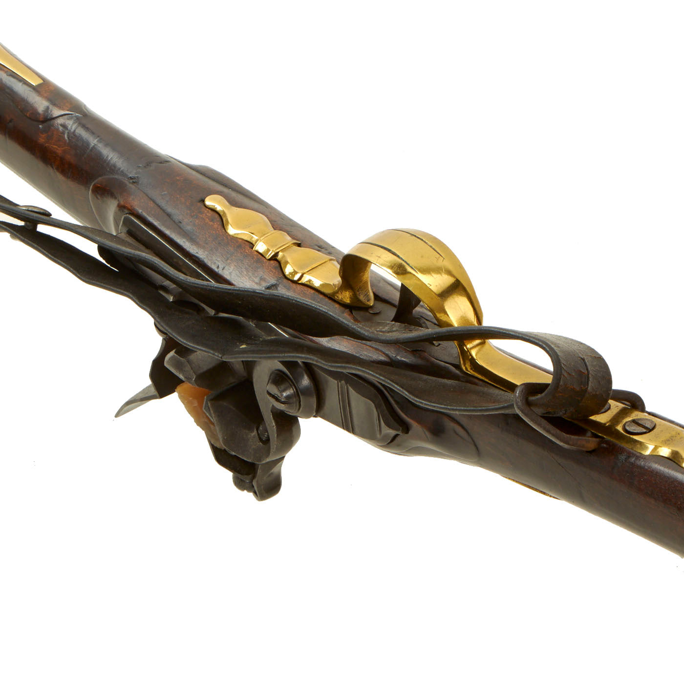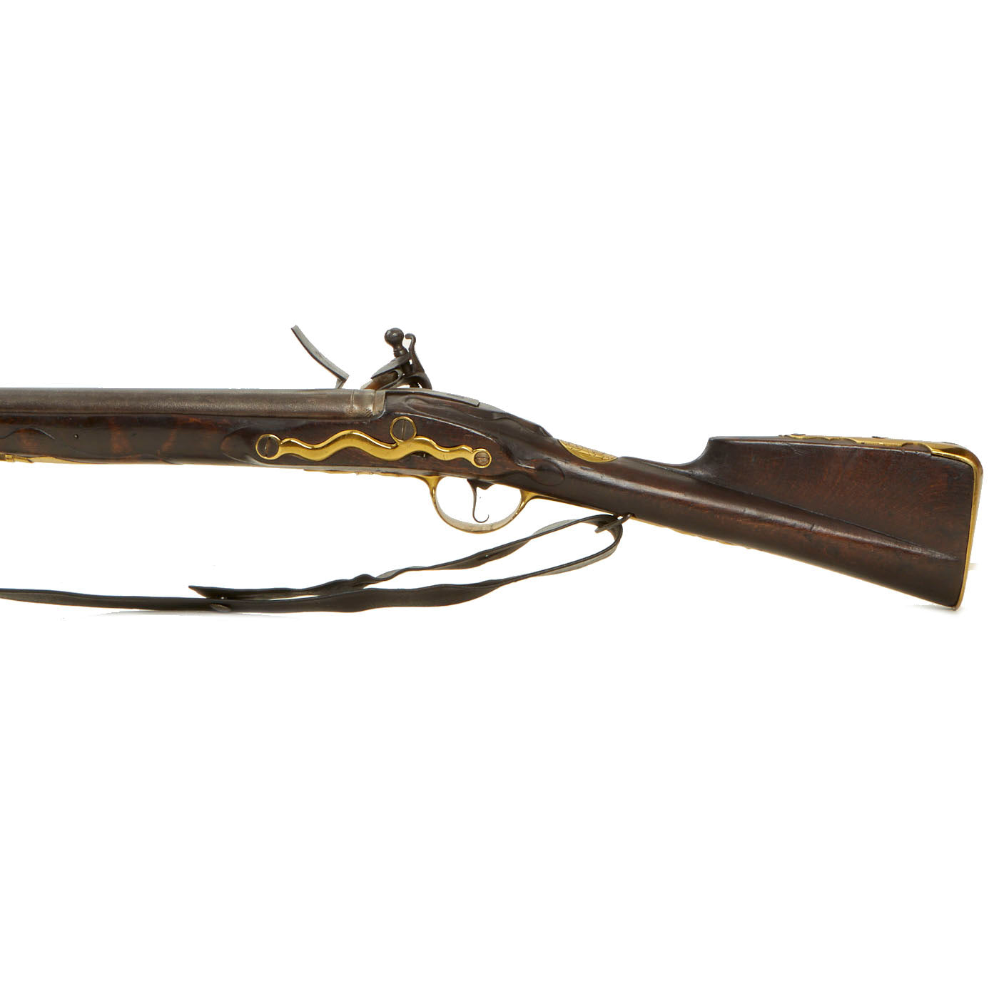Condition is simply excellent, and we will unlikely ever see another this good. The stock is incredible, well carved with embellishments around all of the fittings. It has a beautiful color, and we do not see any structural damage. The metalwork is also lovely, with the barrel having a lovely aged patina. We checked the lock, and it functions correctly, holding at half cock and firing at full. It still has the correct HEAVY ramrod, with intact threads on the front end. The included bayonet shows its age but fits perfectly. It has a lovely aged patina matching the barrel.