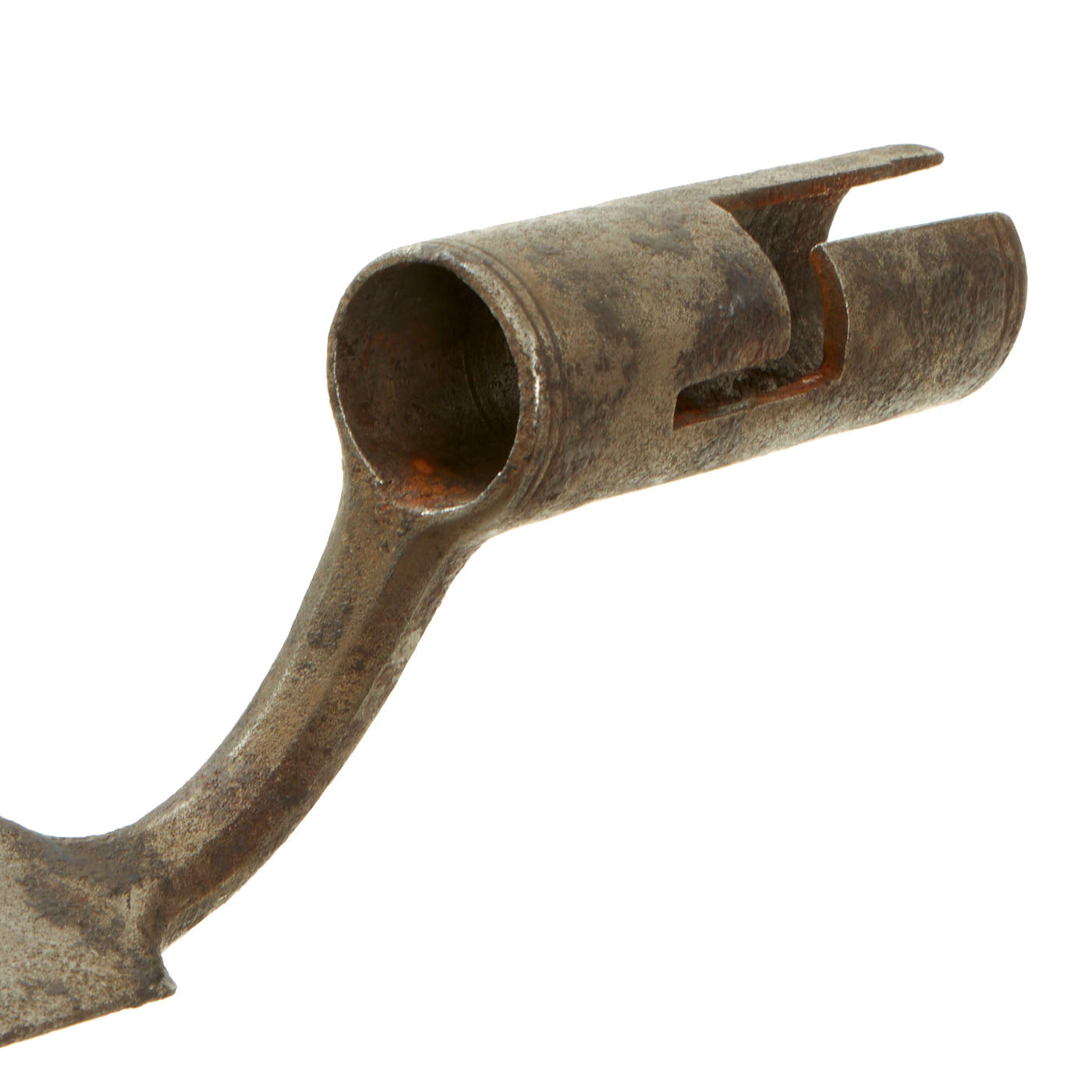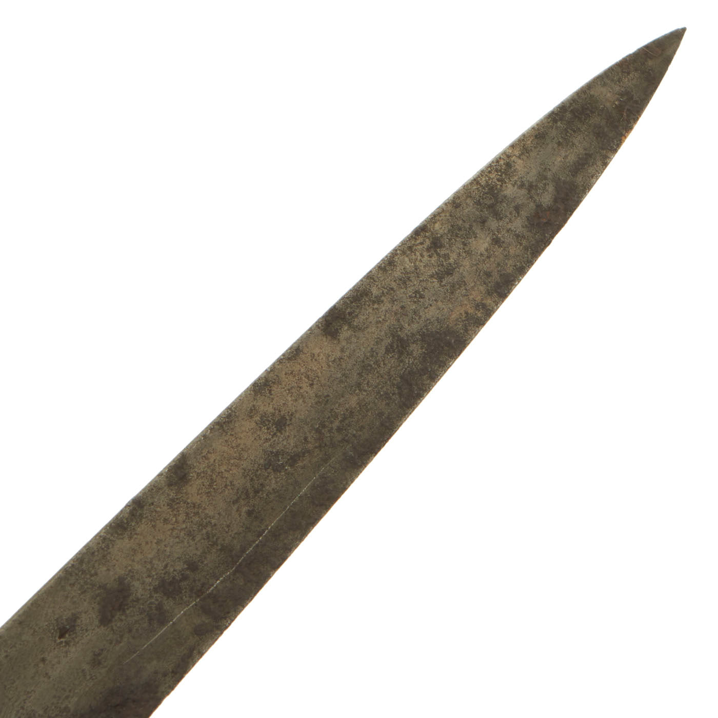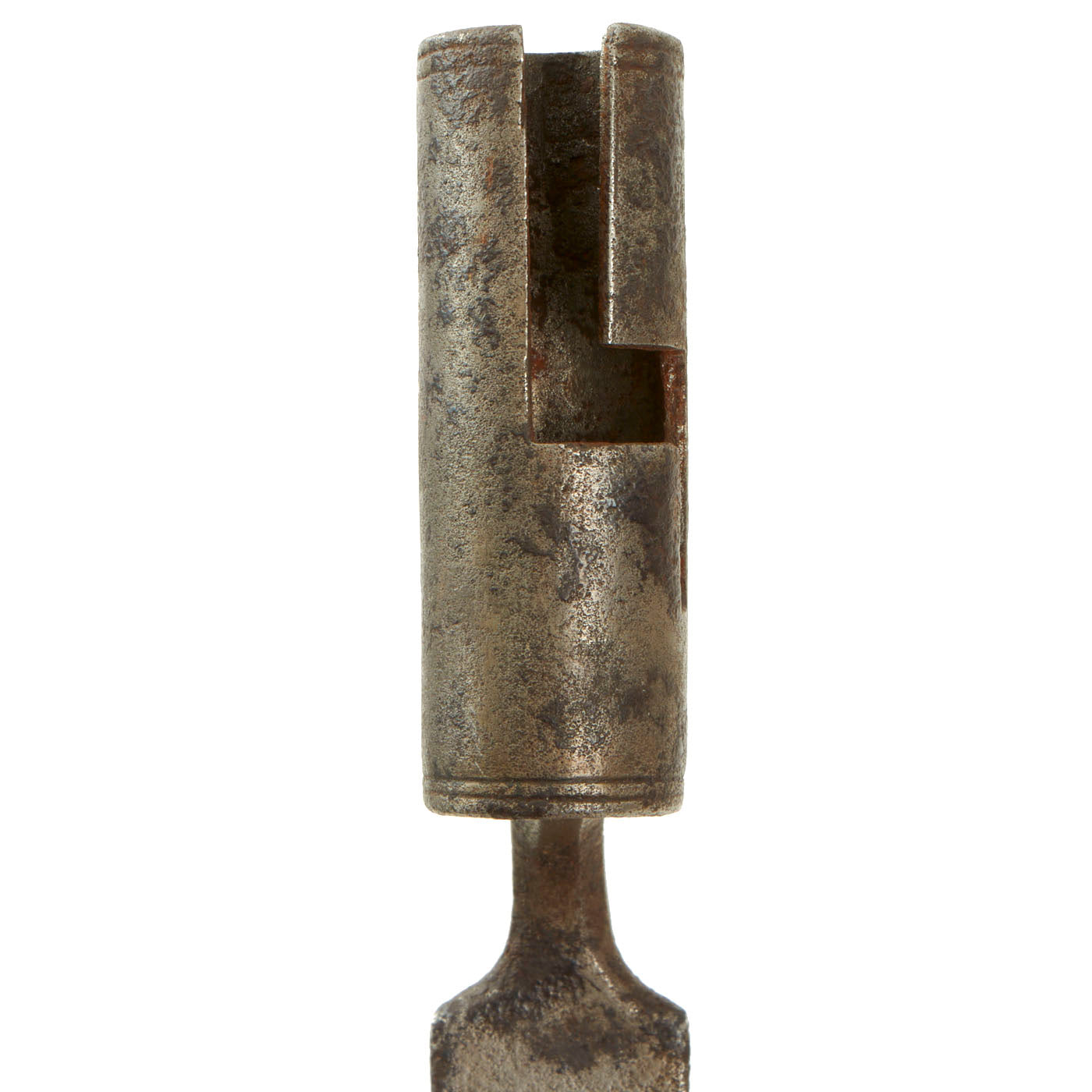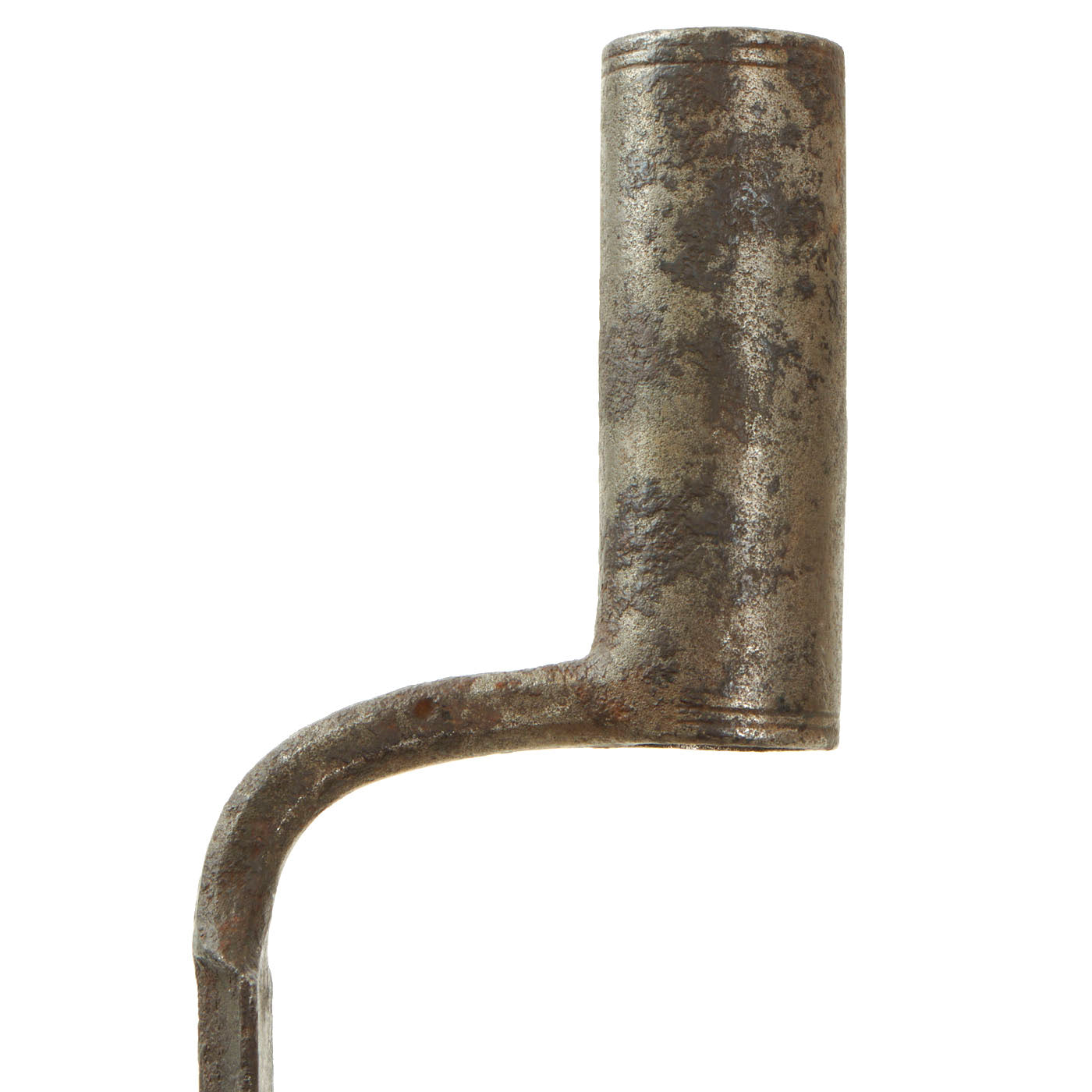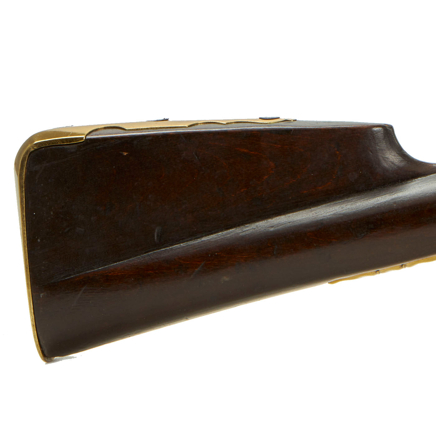 Condition is simply excellent, and we will unlikely ever see another this good. The stock is incredible, well carved with embellishments around all of the fittings. It has a beautiful color, and we do not see any structural damage. The metalwork is also lovely, with the barrel having a lovely aged patina. We checked the lock, and it functions correctly, holding at half cock and firing at full. It still has the correct HEAVY ramrod, with intact threads on the front end. The included bayonet shows its age but fits perfectly. It has a lovely aged patina matching the barrel.