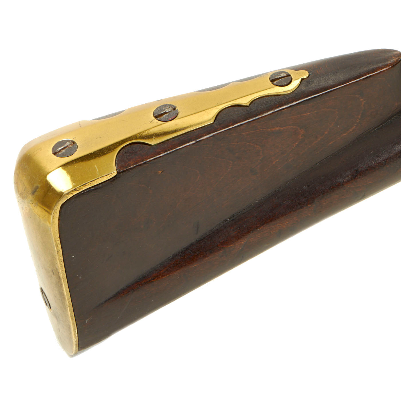This substantial German musket has a 41 inch long barrel held on by pins through the stock, and measures 57 1/2 inches in overall length. All brass Regulation mounts of angular design are polished bright, almost like the day it was issued. There is a brass escutcheon on the back of the wrist, which looks to have a coat of arms on it, which we are unfortunately unable to identify. There are also some proof marks on the breech end of the barrel as well.
