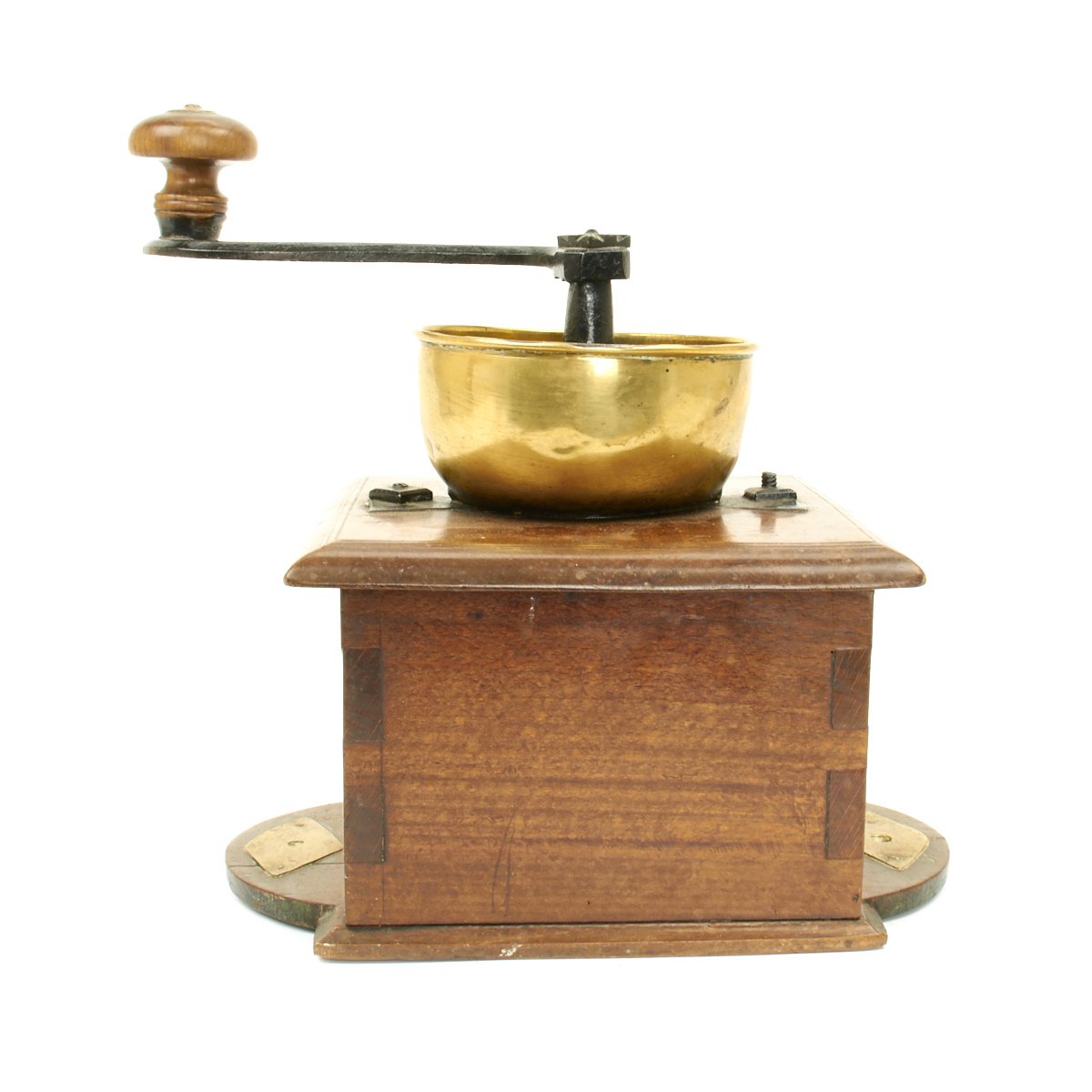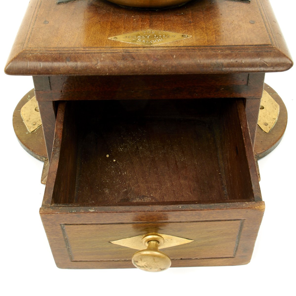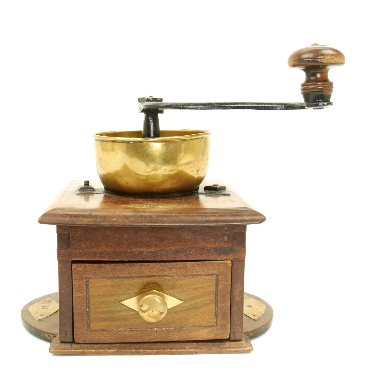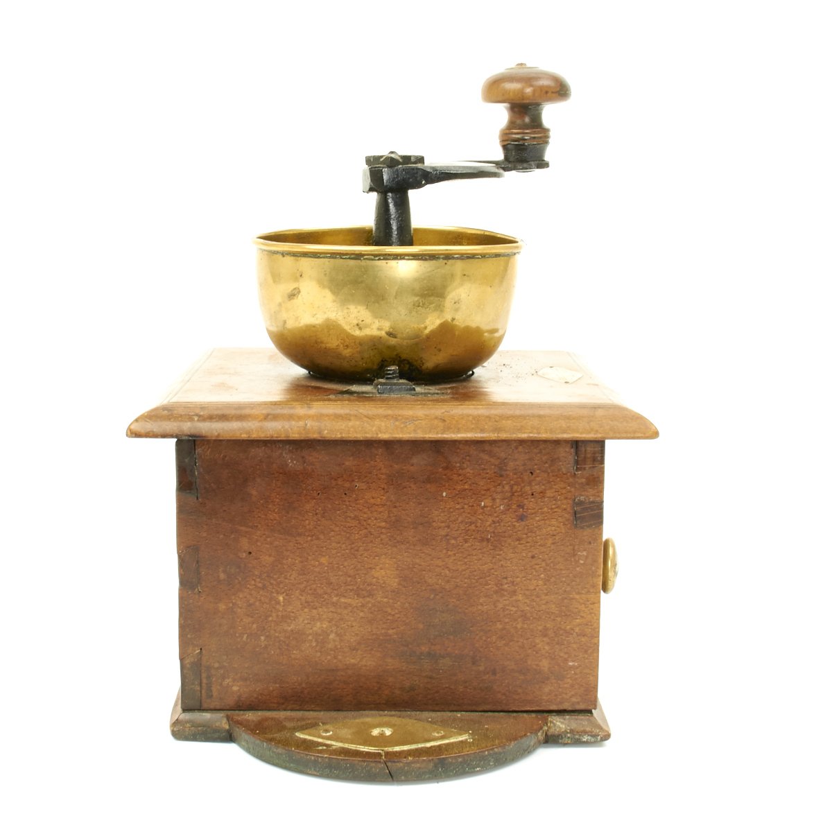 Original Item: One Only. This item is massive and it is definitely quite old. Constructed of a wood cabinet with single drawer for ground coffee. It is topped with a large brass bowl and very large rotating coffee grinder handle to center of bowl.