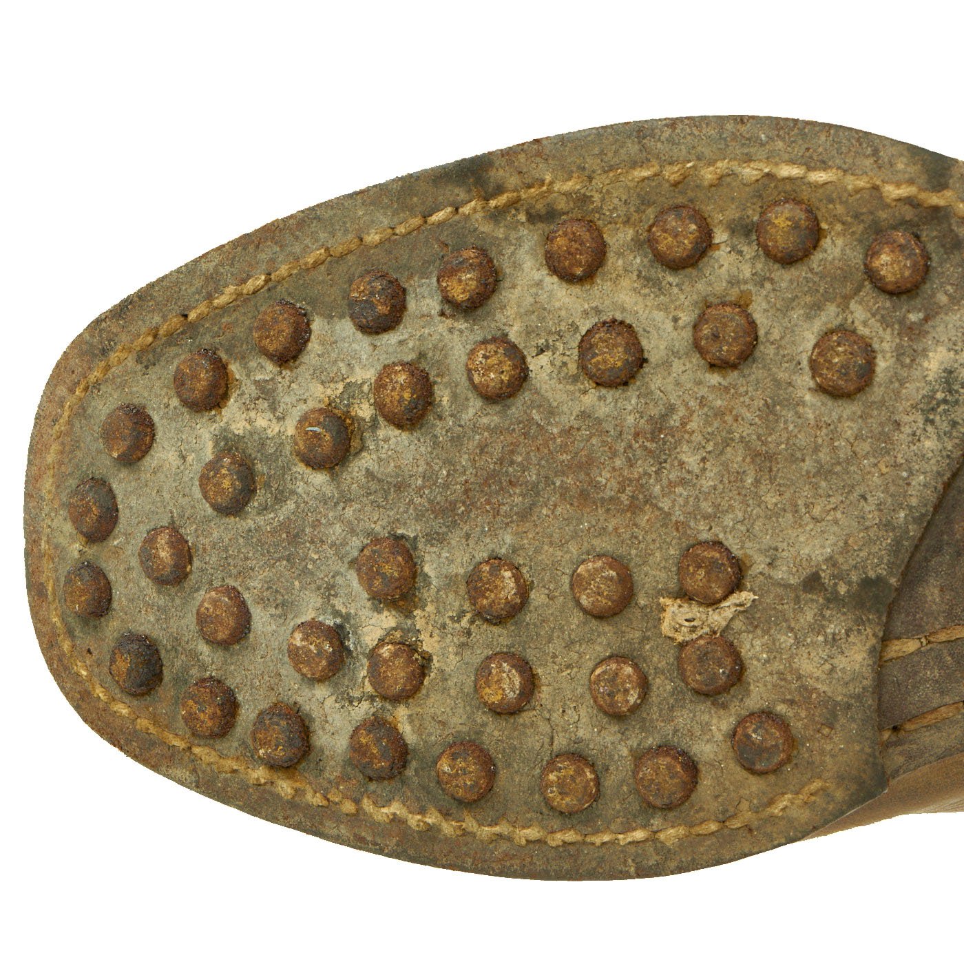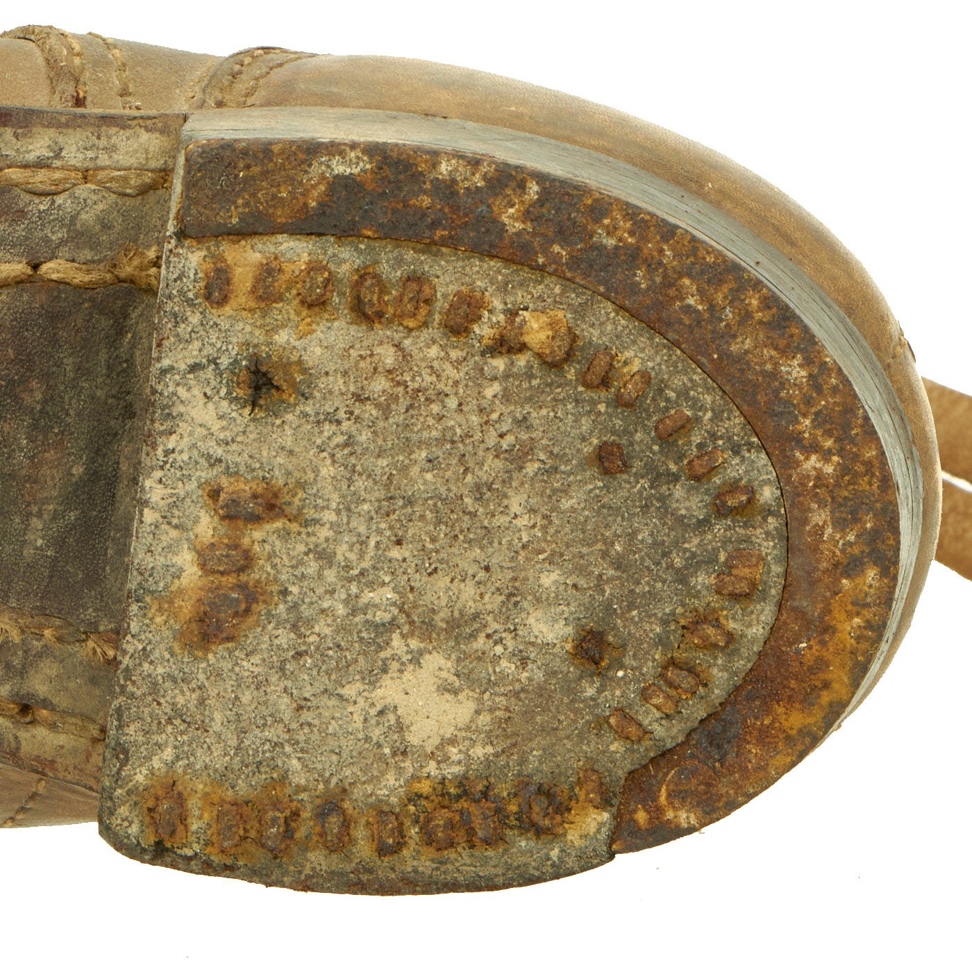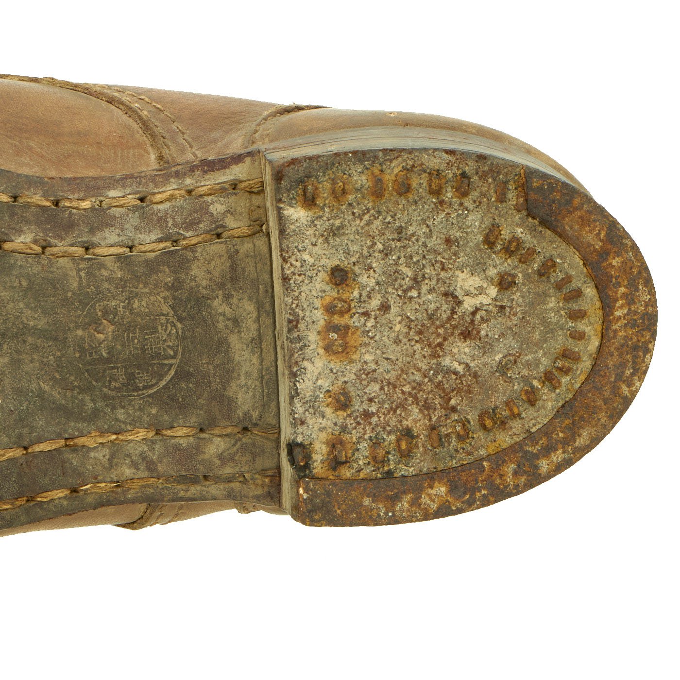 Original Items: Only One Set Available. This is a very nice lightly used pair of leather ankle combat boot, as issued to other ranks in the Imperial Japanese Army during the Pacific War. The feature stitched leather construction, with stitched on leather soles with hobnails for traction, and steel reinforced heels.