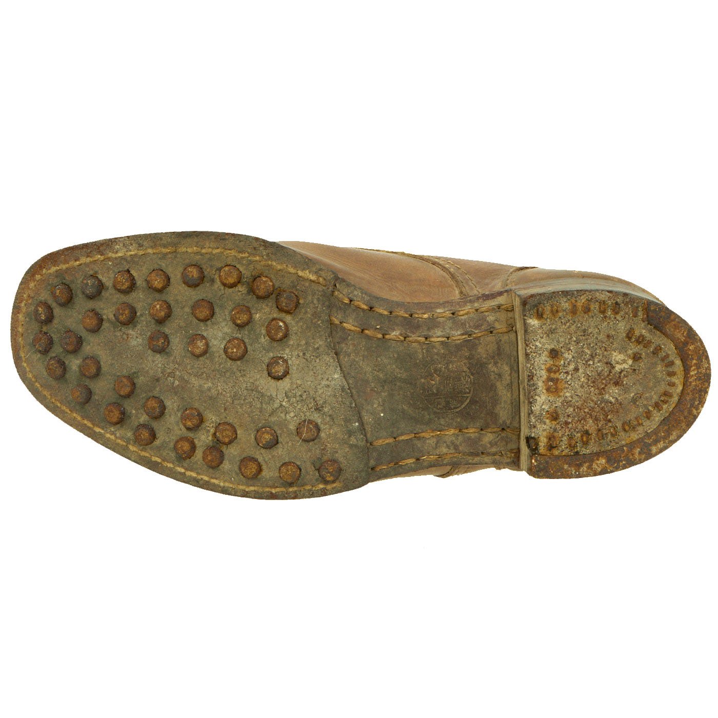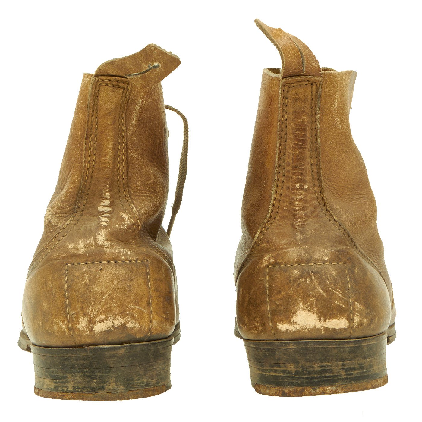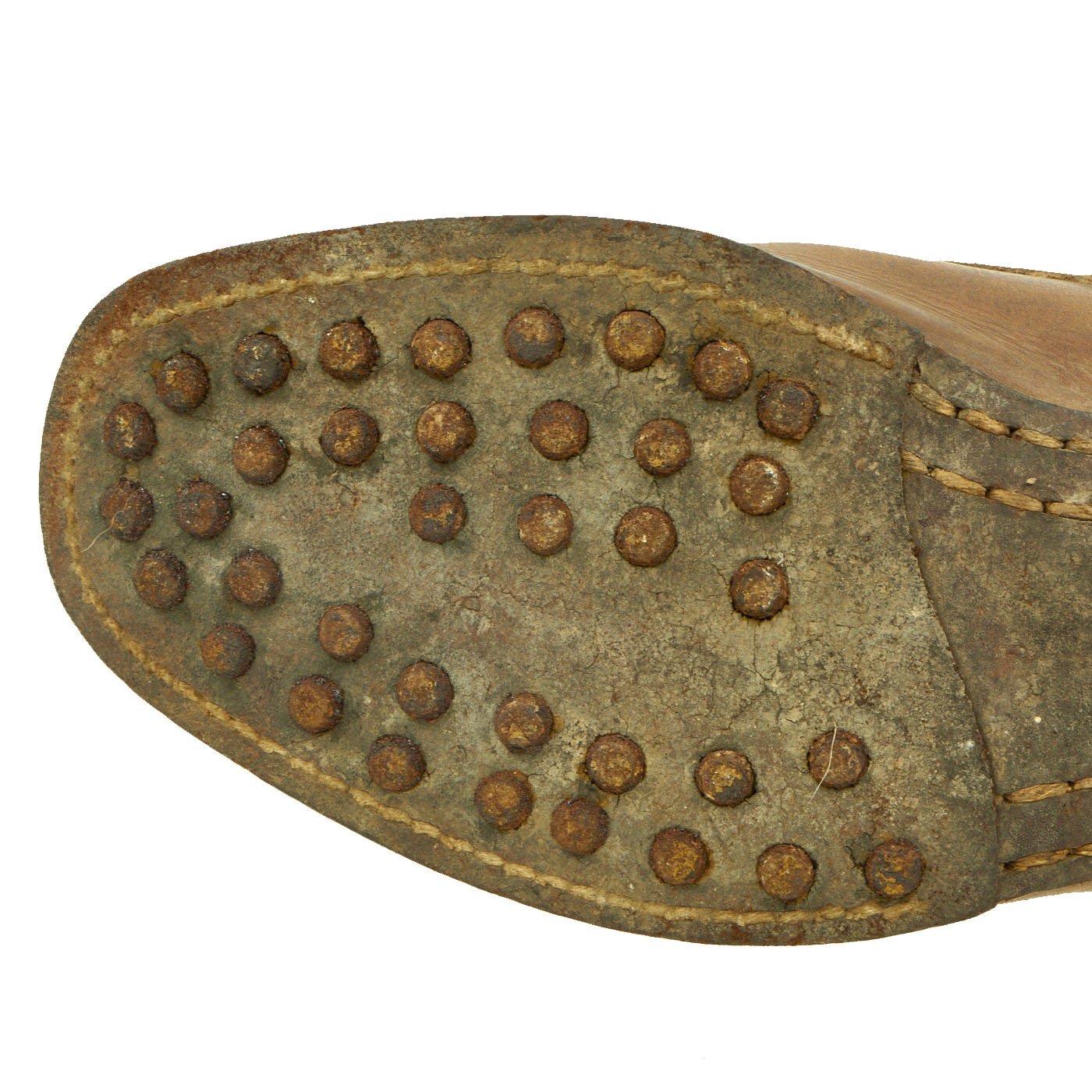 Original Items: Only One Set Available. This is a very nice lightly used pair of leather ankle combat boot, as issued to other ranks in the Imperial Japanese Army during the Pacific War. The feature stitched leather construction, with stitched on leather soles with hobnails for traction, and steel reinforced heels.