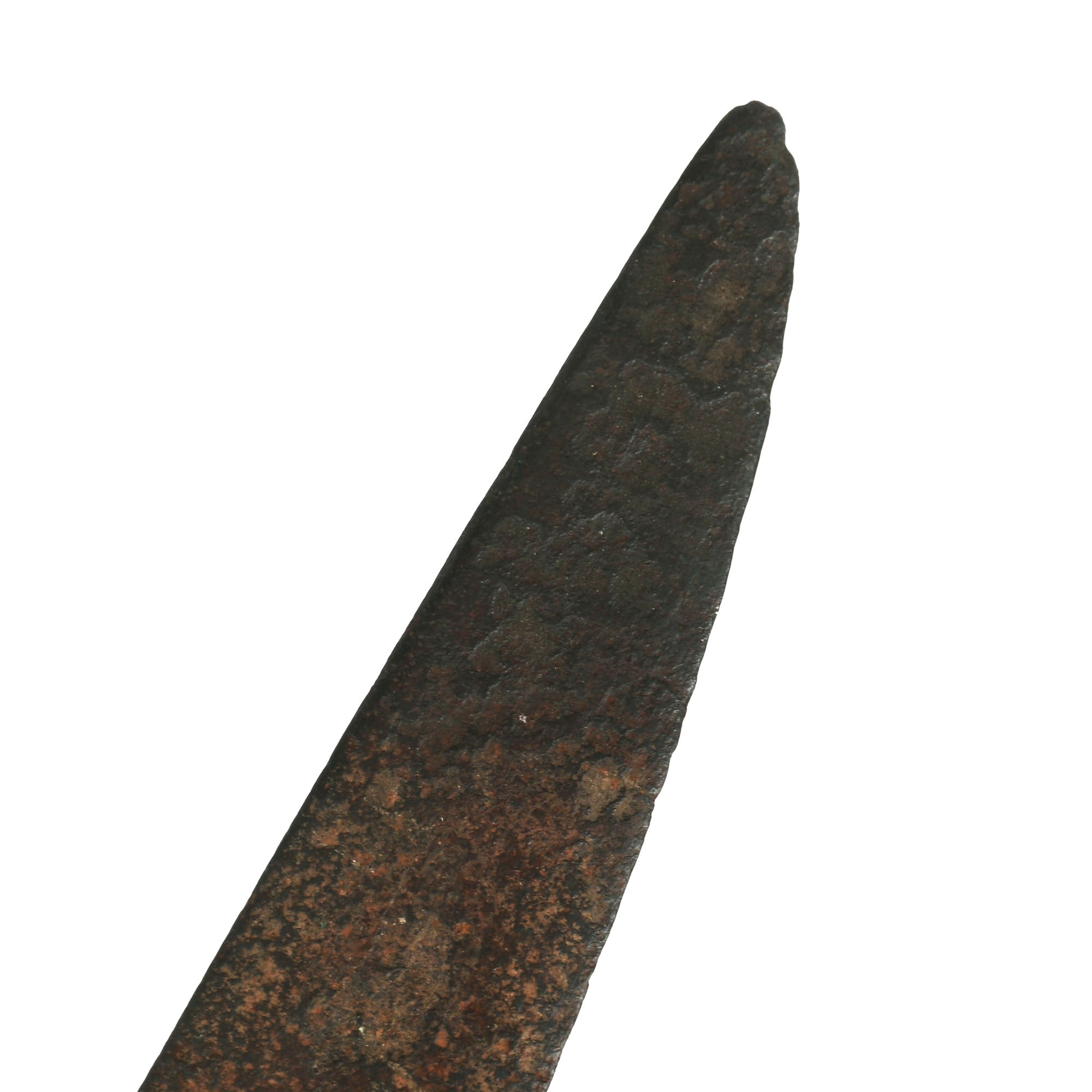 The steel blade has a heavy oxidized patina, with heavy surface rust, pitting and nicks in the edge. The edge has a few minor dents, but no significant ones. There is wear, especially near the transition from the ricasso.