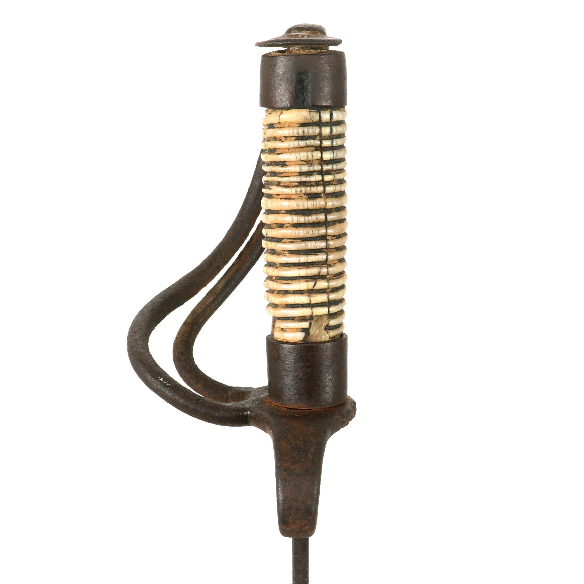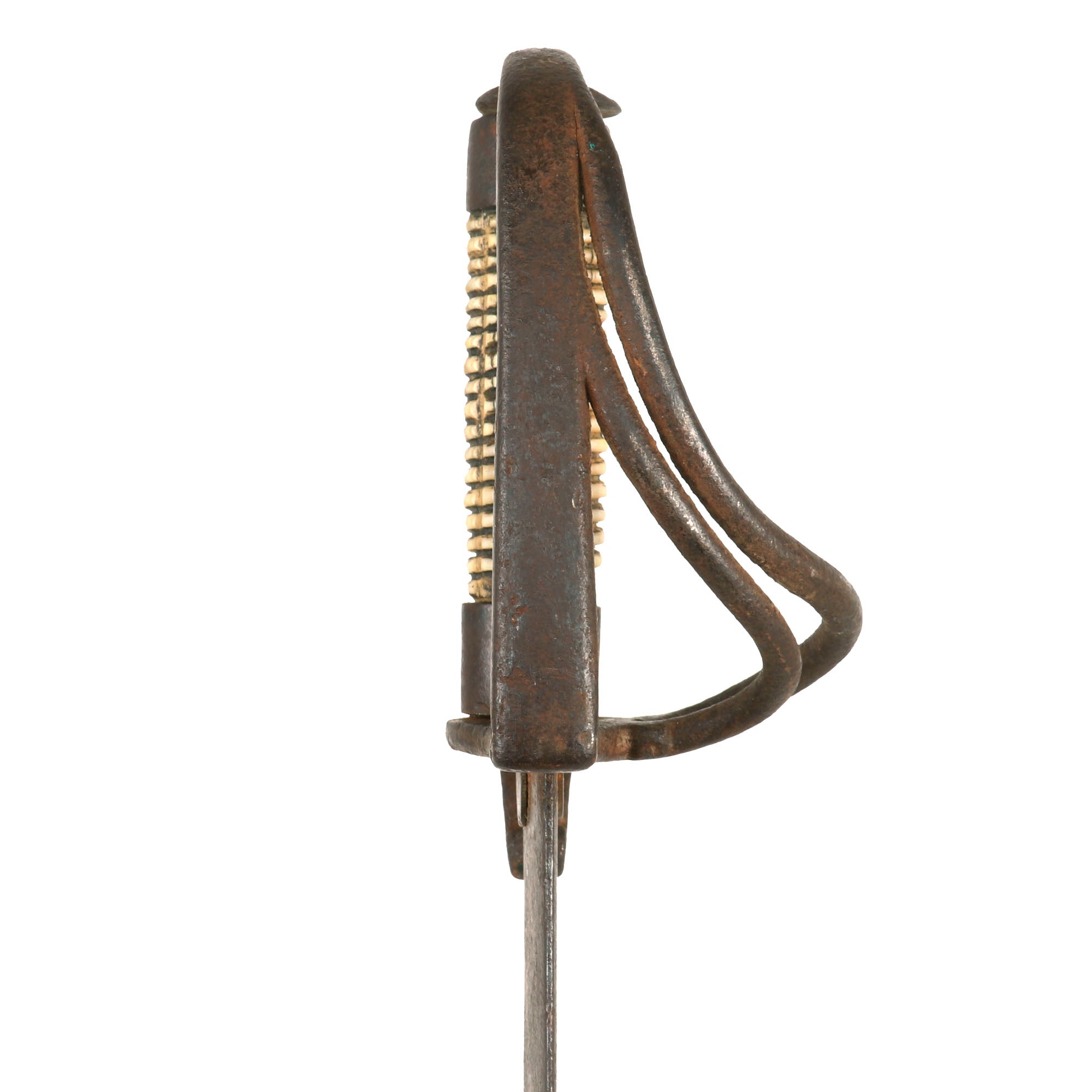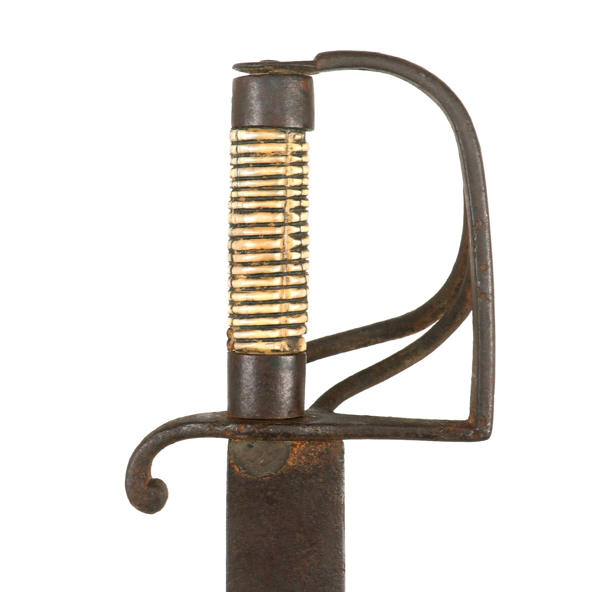 The design is a typical heavy curved saber of the time, with a 29 ½” curved single edged un-fullered blade, and a 3 bar basket hilt. The guard is of steel, while the grip is bone/ivory. Condition of the hilt is good, with the expected patination from age and use. Unfortunately the handle is stained and cracked in multiple places, causing expansion and ultimately a loose feel on the tang.