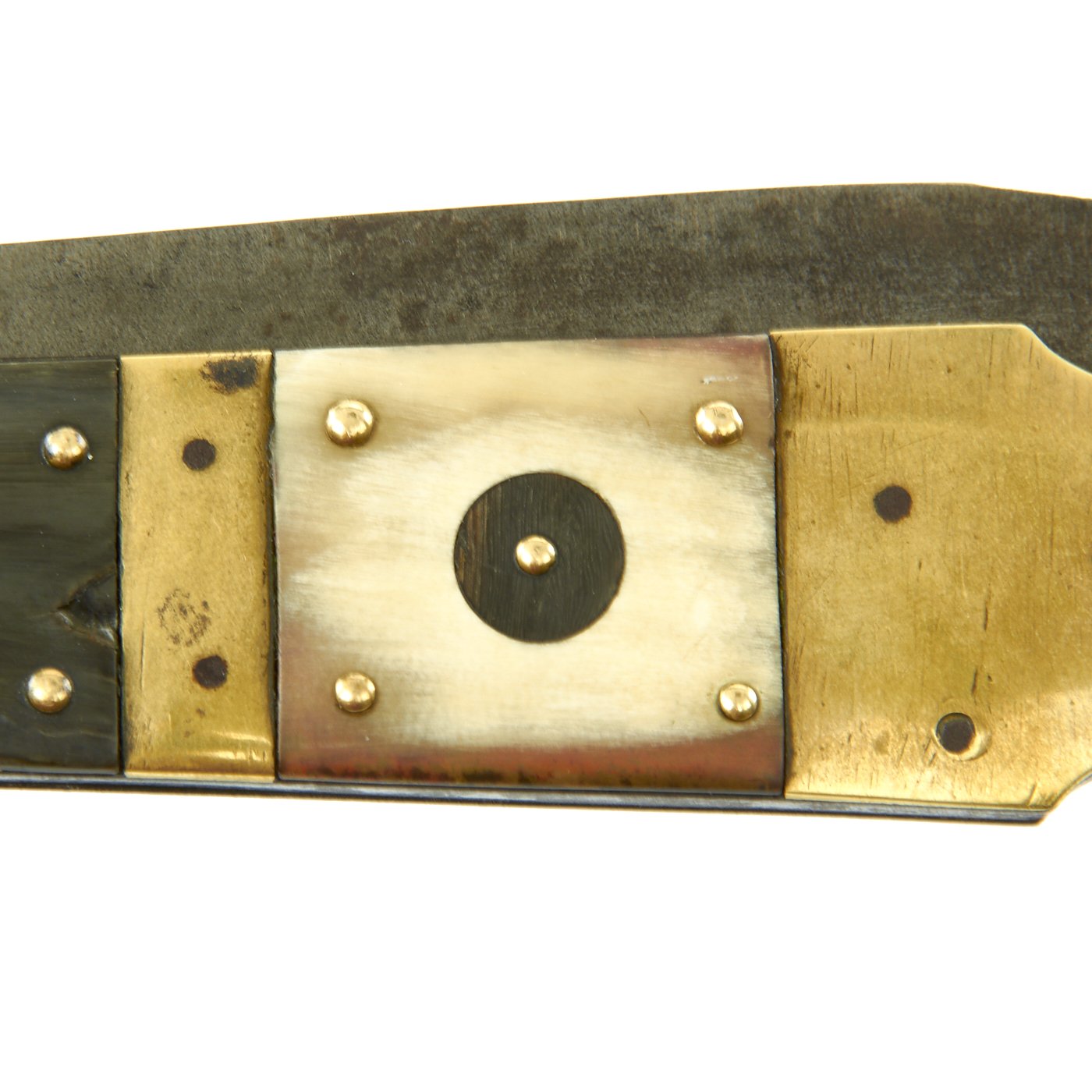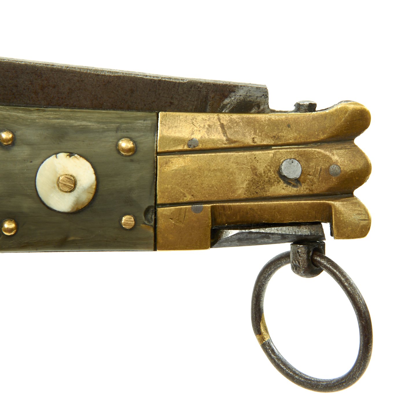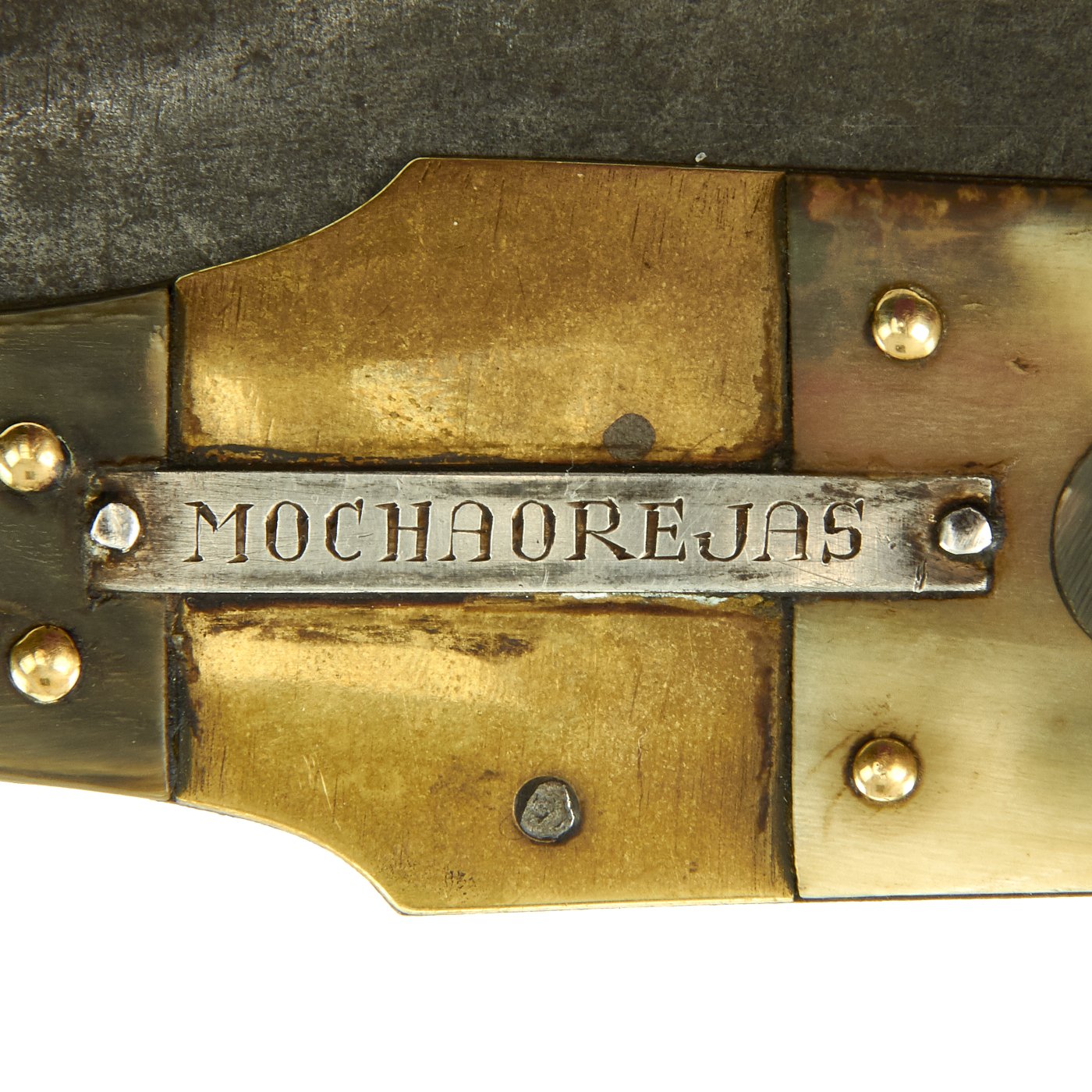 This folding knife is very large, closed its length is almost 12" but opened is is a full 21 1/2" in length. To close one needs to pull on the ring on the back base of the blade which allows the blade to fold away on itself. Both sides of the knife are covered in decorative horn and/or shell panels with brass fittings. There is a plaque in silver stating MOCHAOREJAS.