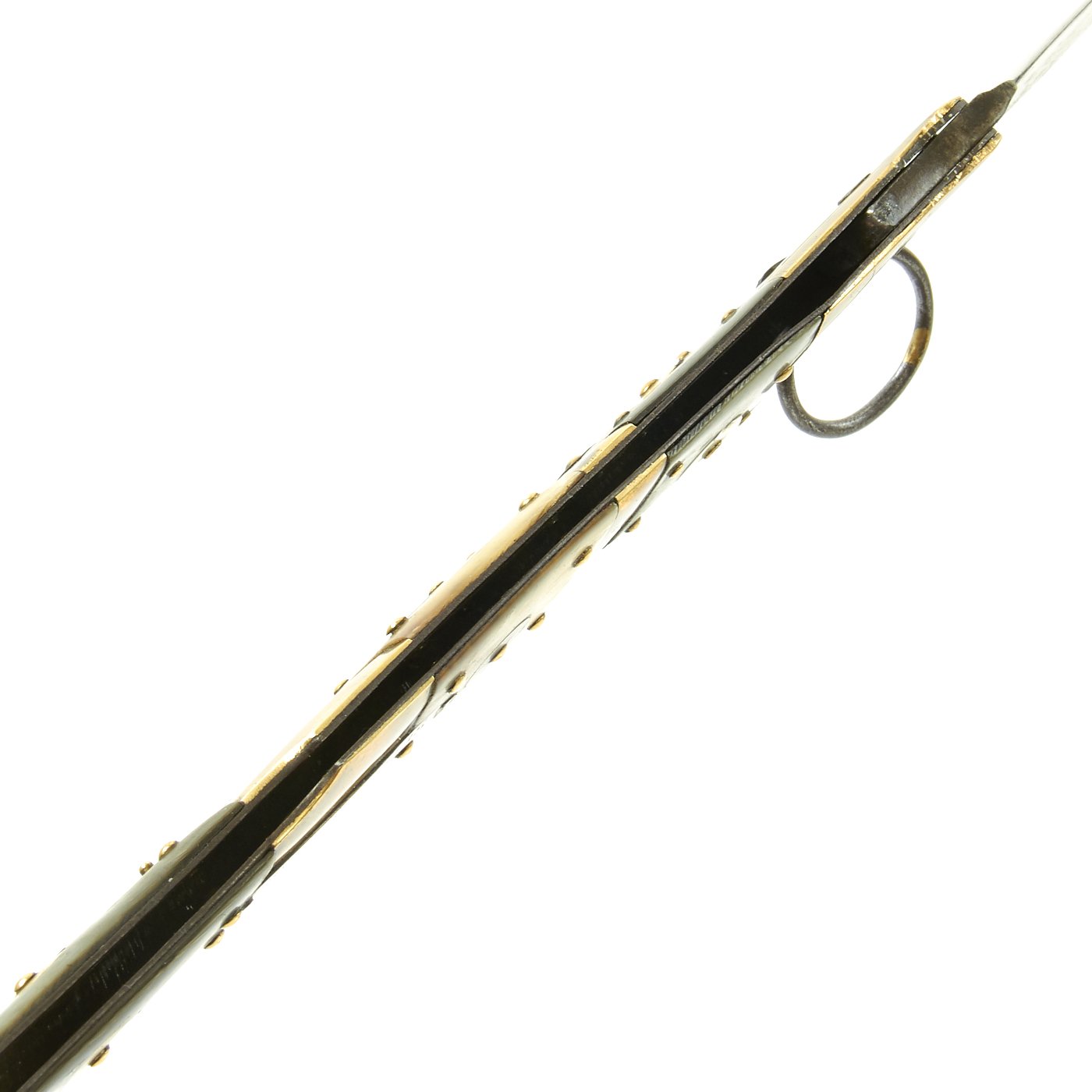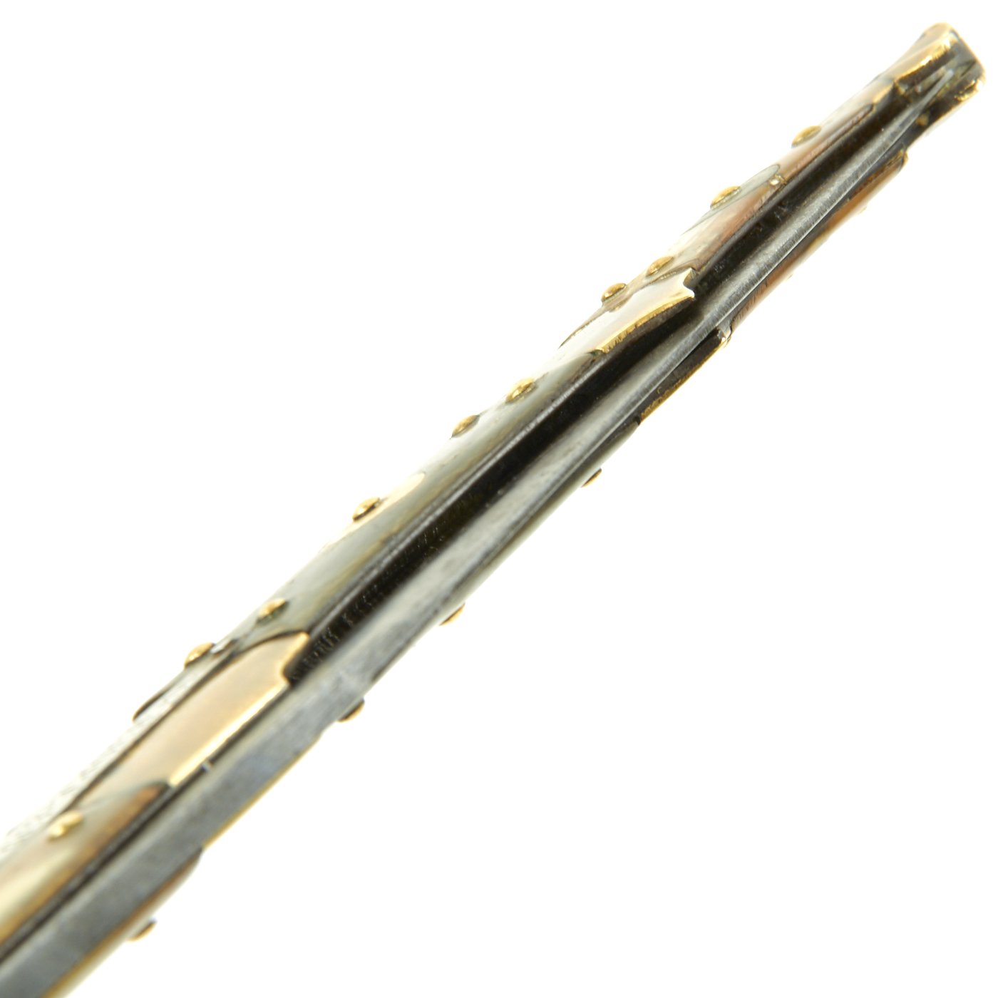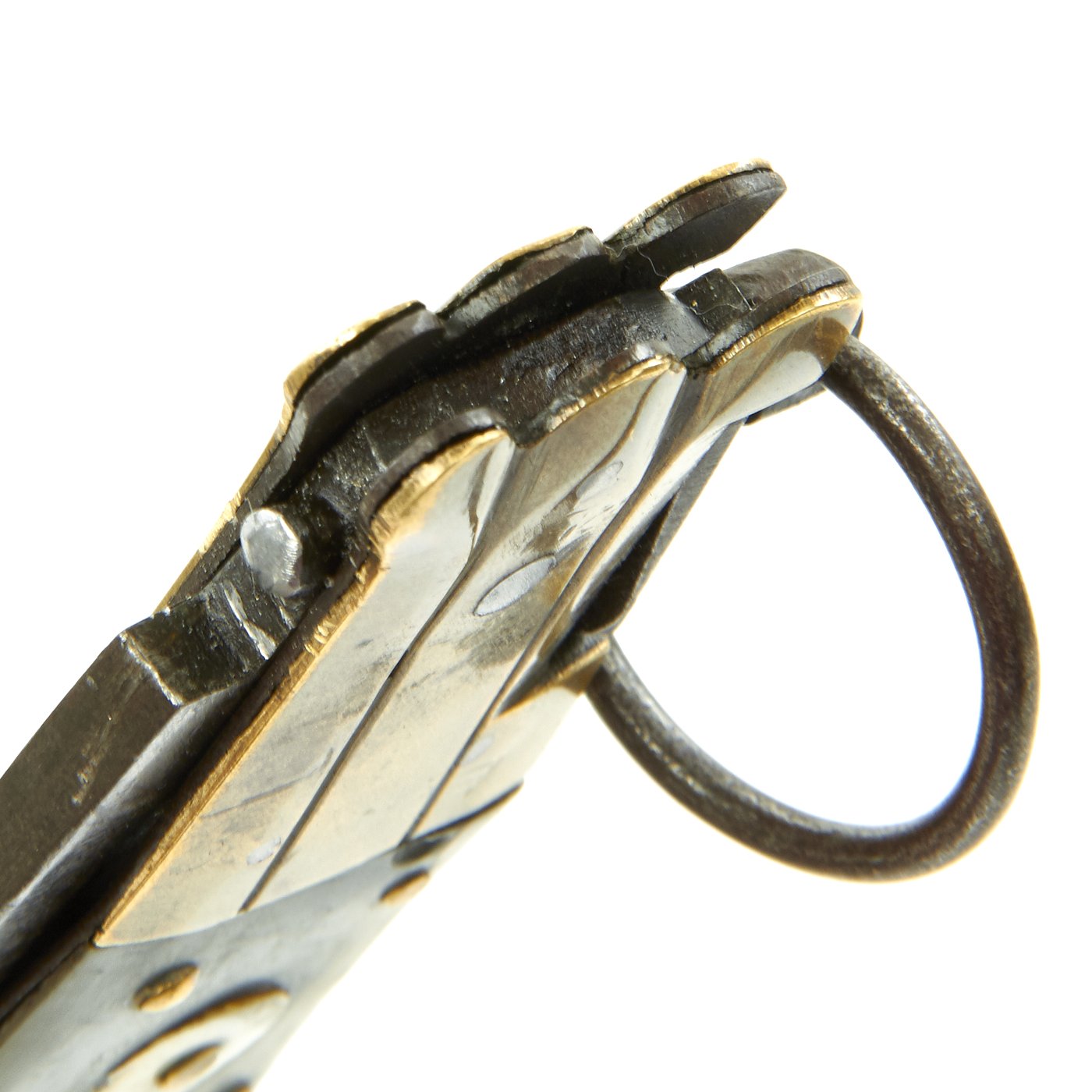 This folding knife is very large, closed its length is almost 12" but opened is is a full 21 1/2" in length. To close one needs to pull on the ring on the back base of the blade which allows the blade to fold away on itself. Both sides of the knife are covered in decorative horn and/or shell panels with brass fittings. There is a plaque in silver stating MOCHAOREJAS.