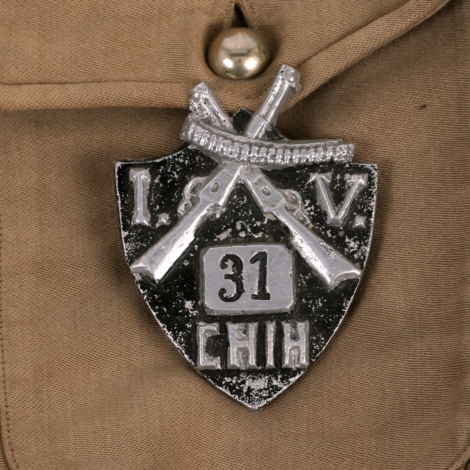The cuffs of the jacket also have insignia which we’ve been unable to identify, however it likely indicates Major due to the shoulder boards. There is a very peculiar badge attached by prongs to the left breast pocket which depicts two repeater rifles with a bandoleer of ammo around them, reading I. V. / 31 / CHIH. We are unsure of what this badge represents, but we can assume that CHIH refers to the State of Chihuahua, a really great research opportunity!