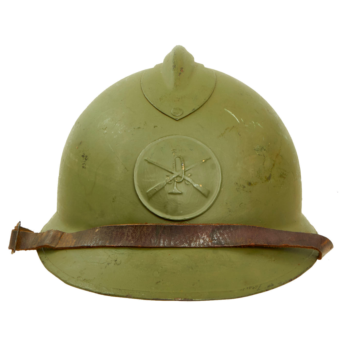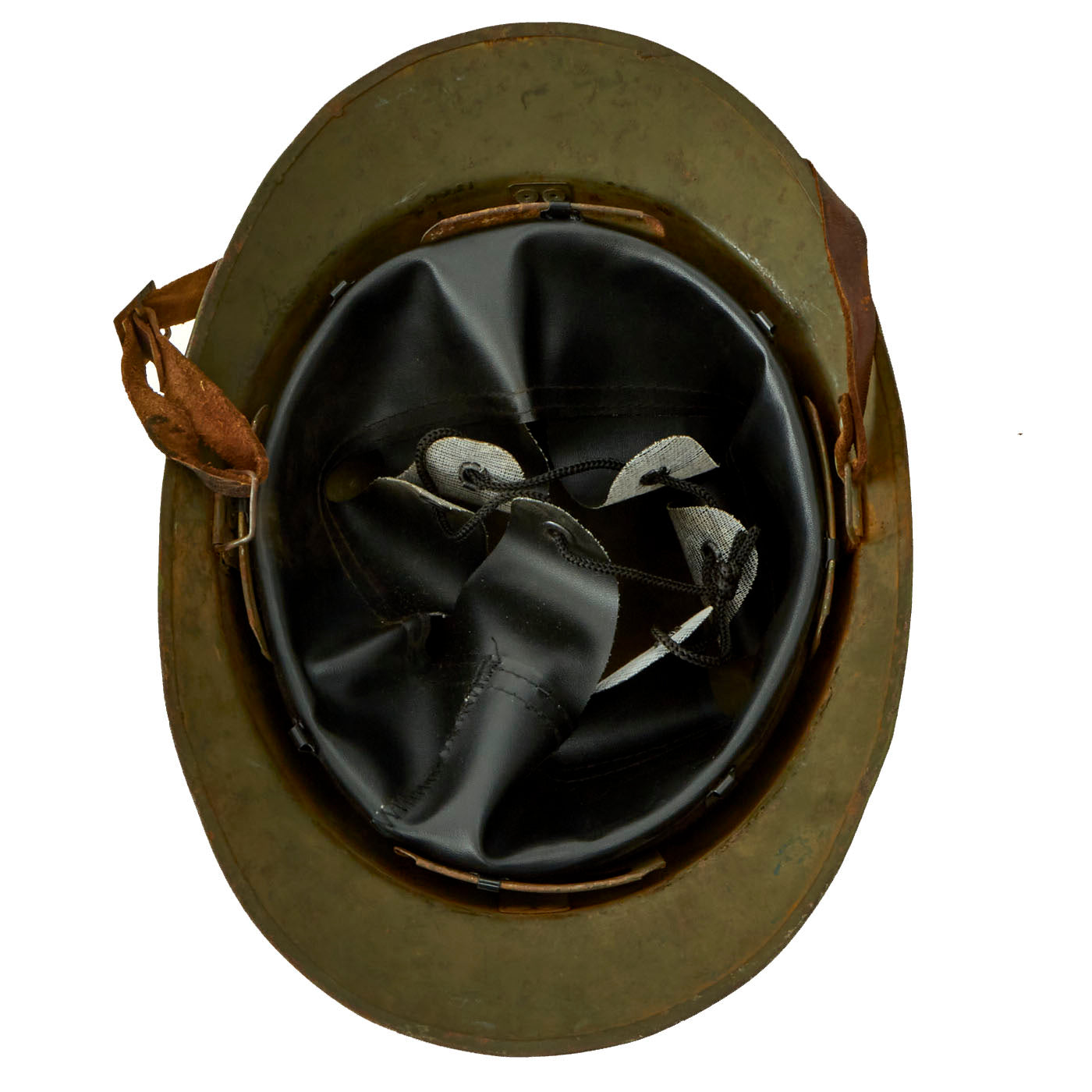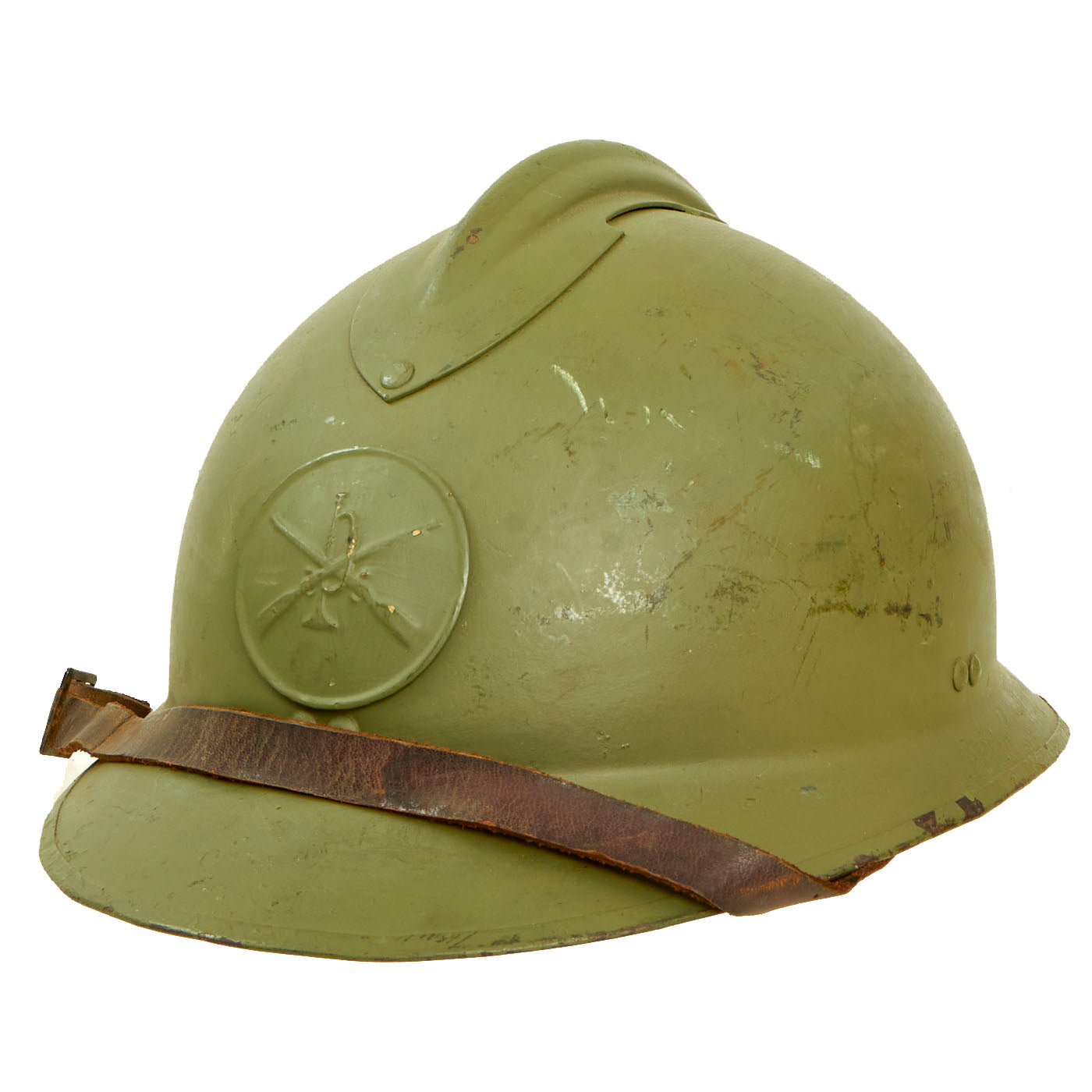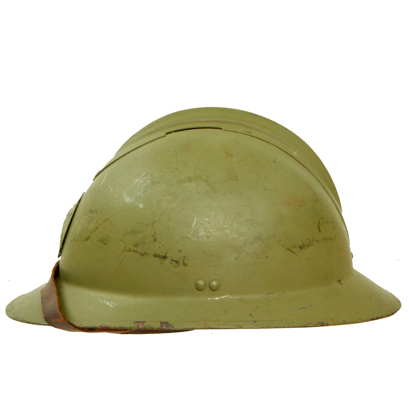 The double rivets on the front and sides of the helmet indicate that this was made under contract in France for Mexico, and the design is very similar to the French M1926 helmet. The main difference is the liner and liner attachment system, which is unfortunately not nearly as robust on the Mexican version. This example, like most we have seen, was completely missing the liner, and was fitted with a much newer replacement. The original chinstrap is present.