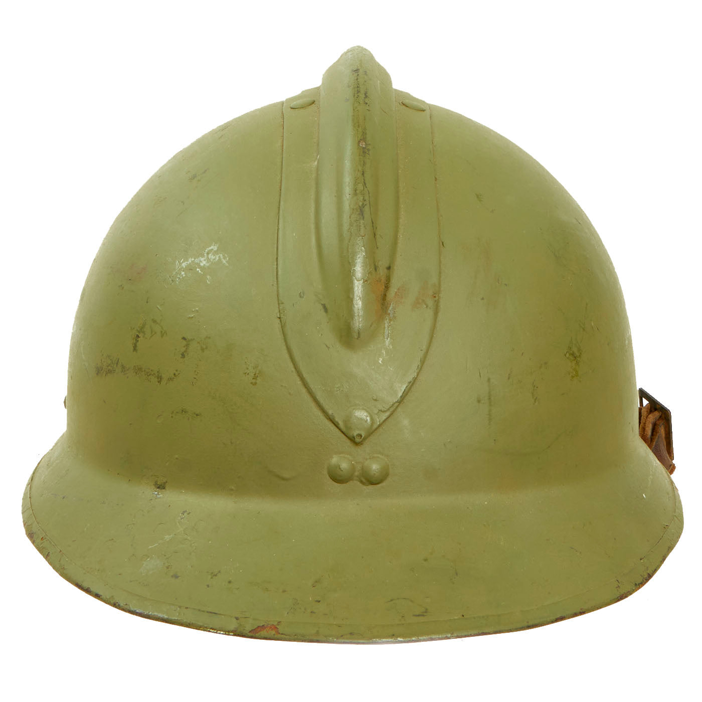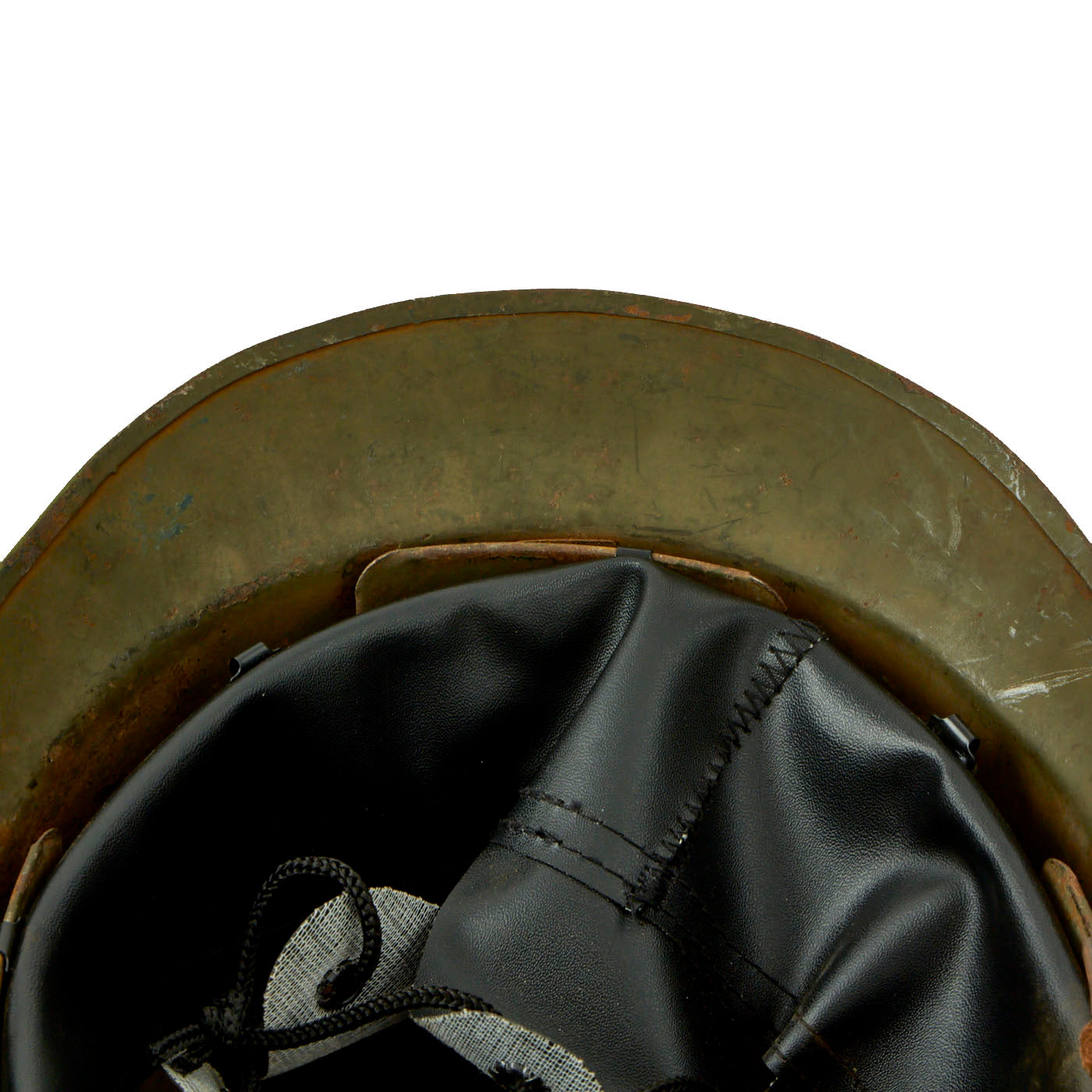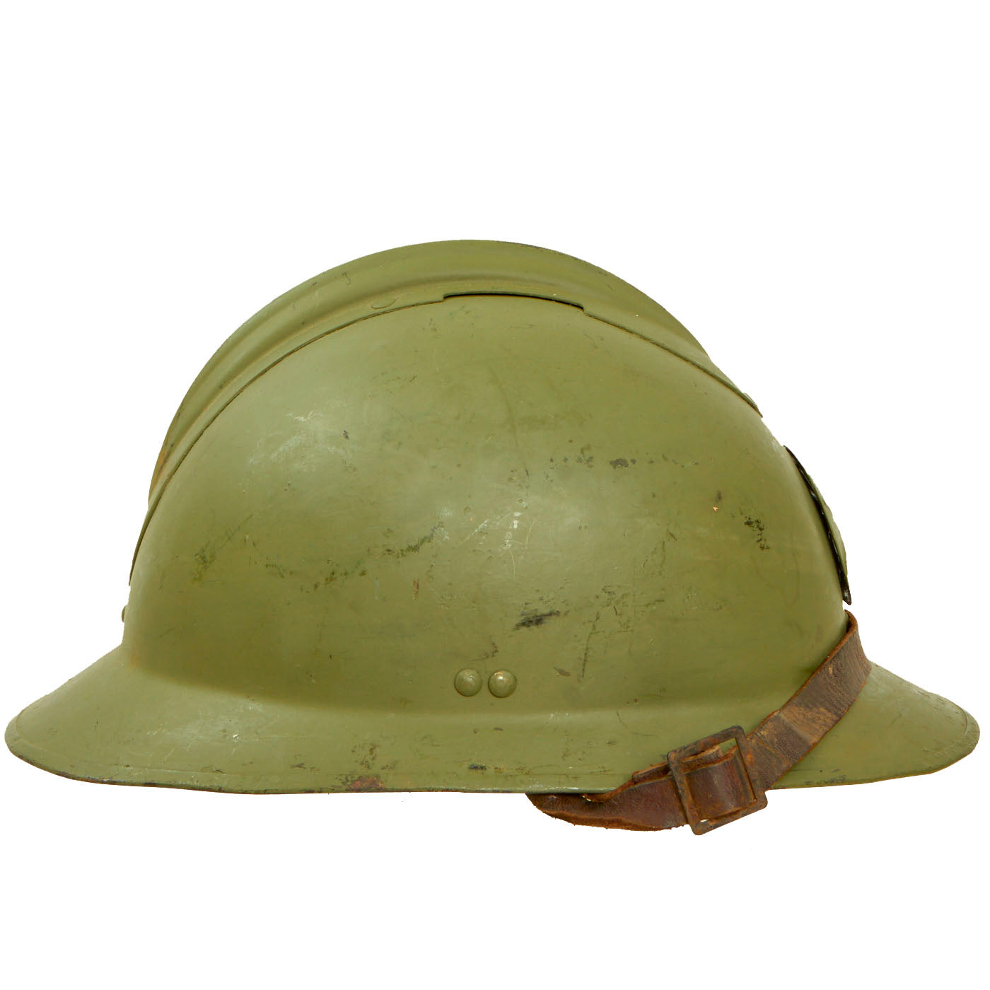 The double rivets on the front and sides of the helmet indicate that this was made under contract in France for Mexico, and the design is very similar to the French M1926 helmet. The main difference is the liner and liner attachment system, which is unfortunately not nearly as robust on the Mexican version. This example, like most we have seen, was completely missing the liner, and was fitted with a much newer replacement. The original chinstrap is present.