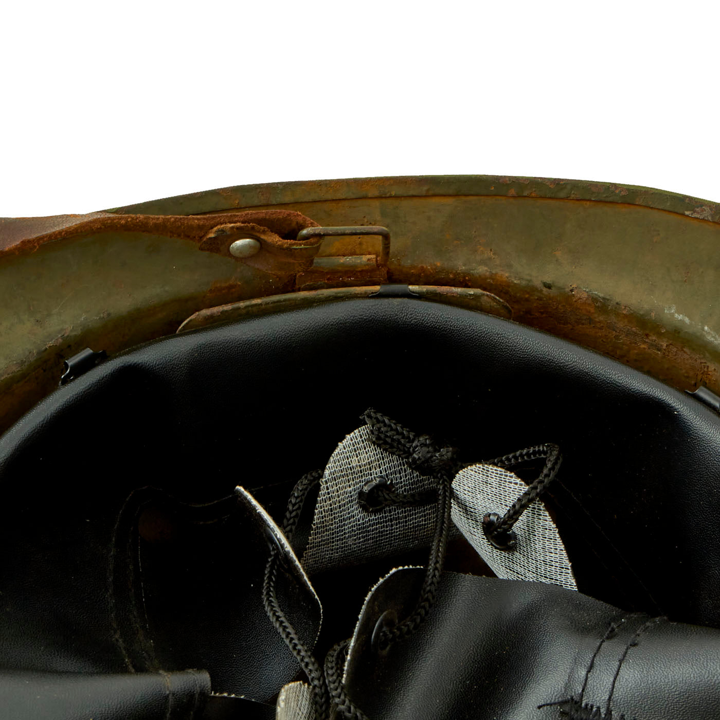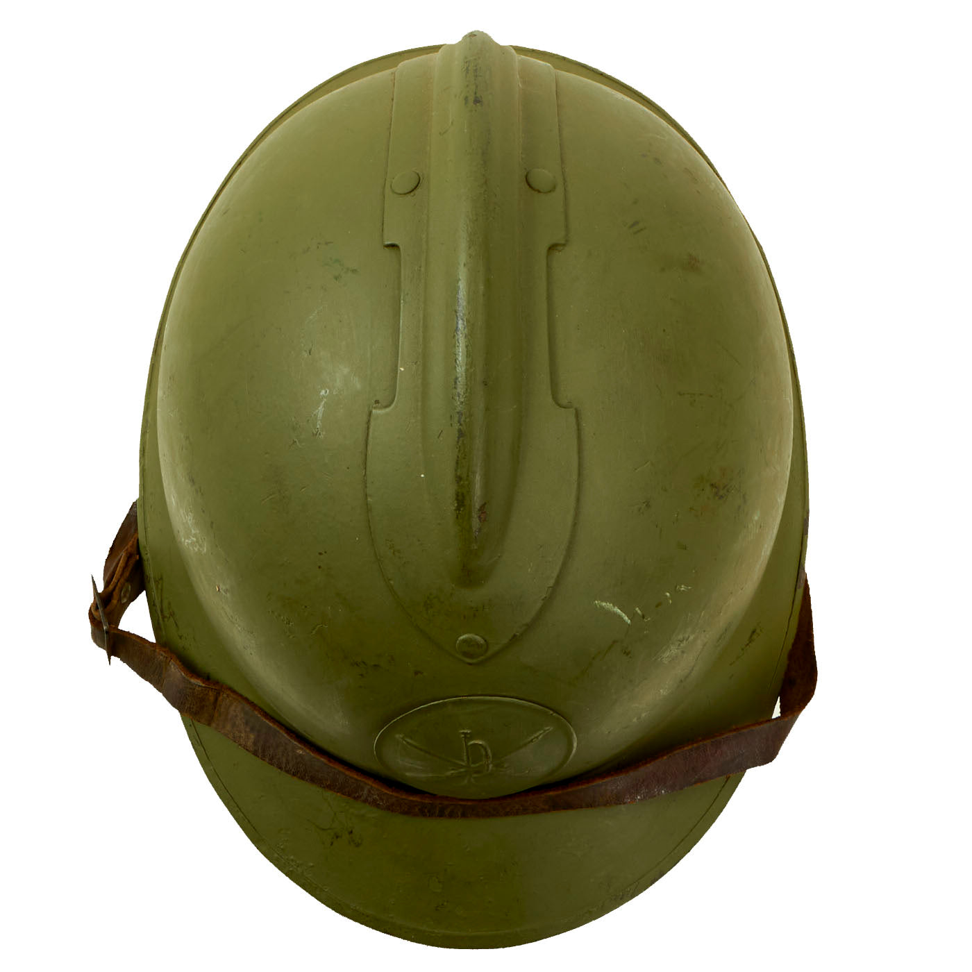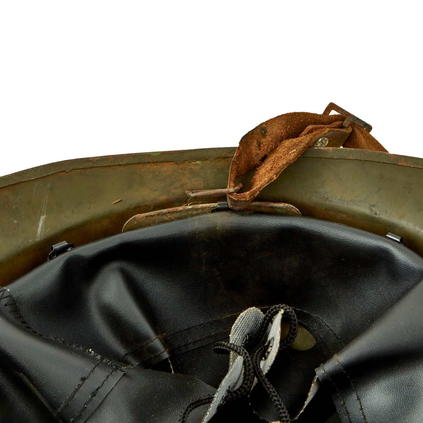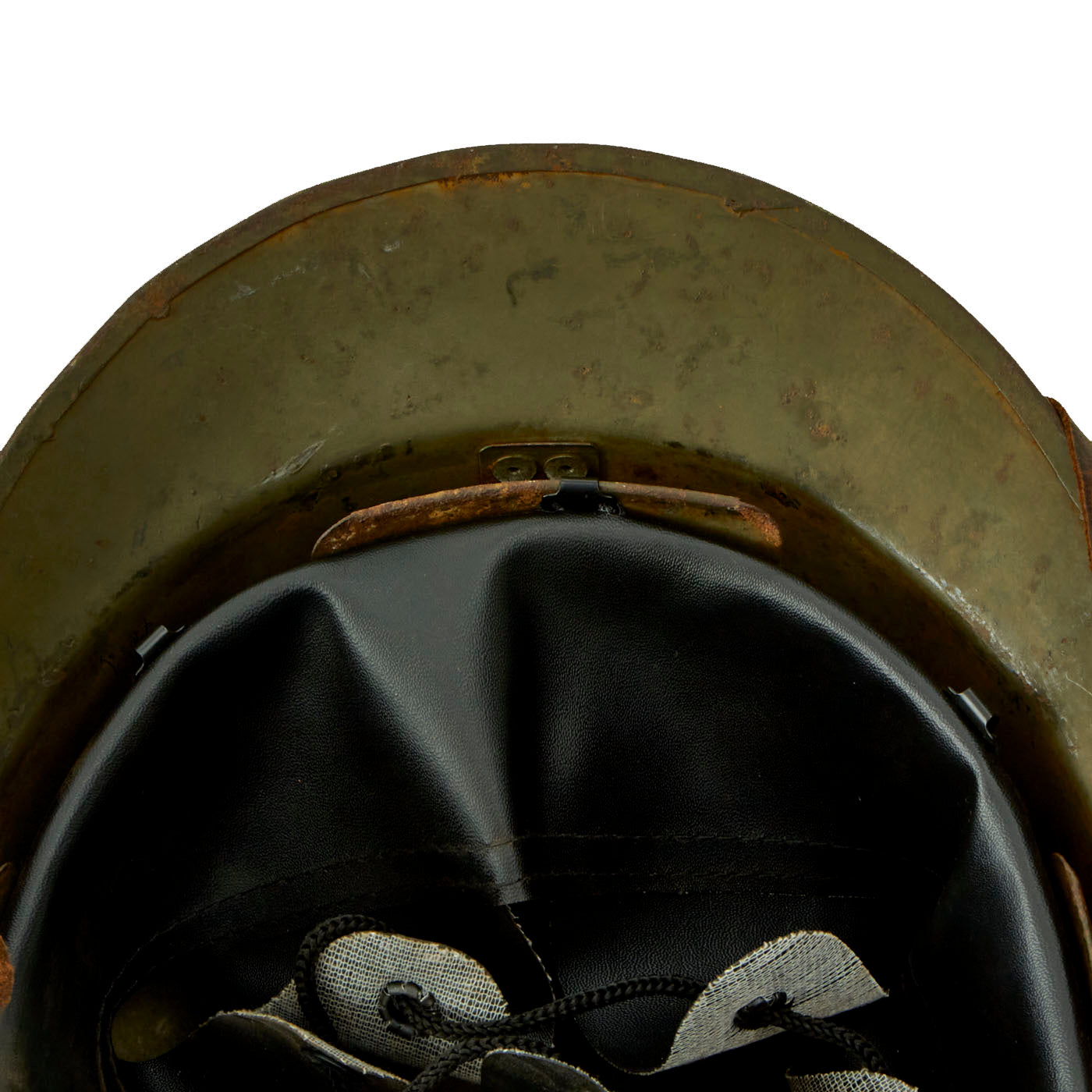 The double rivets on the front and sides of the helmet indicate that this was made under contract in France for Mexico, and the design is very similar to the French M1926 helmet. The main difference is the liner and liner attachment system, which is unfortunately not nearly as robust on the Mexican version. This example, like most we have seen, was completely missing the liner, and was fitted with a much newer replacement. The original chinstrap is present.