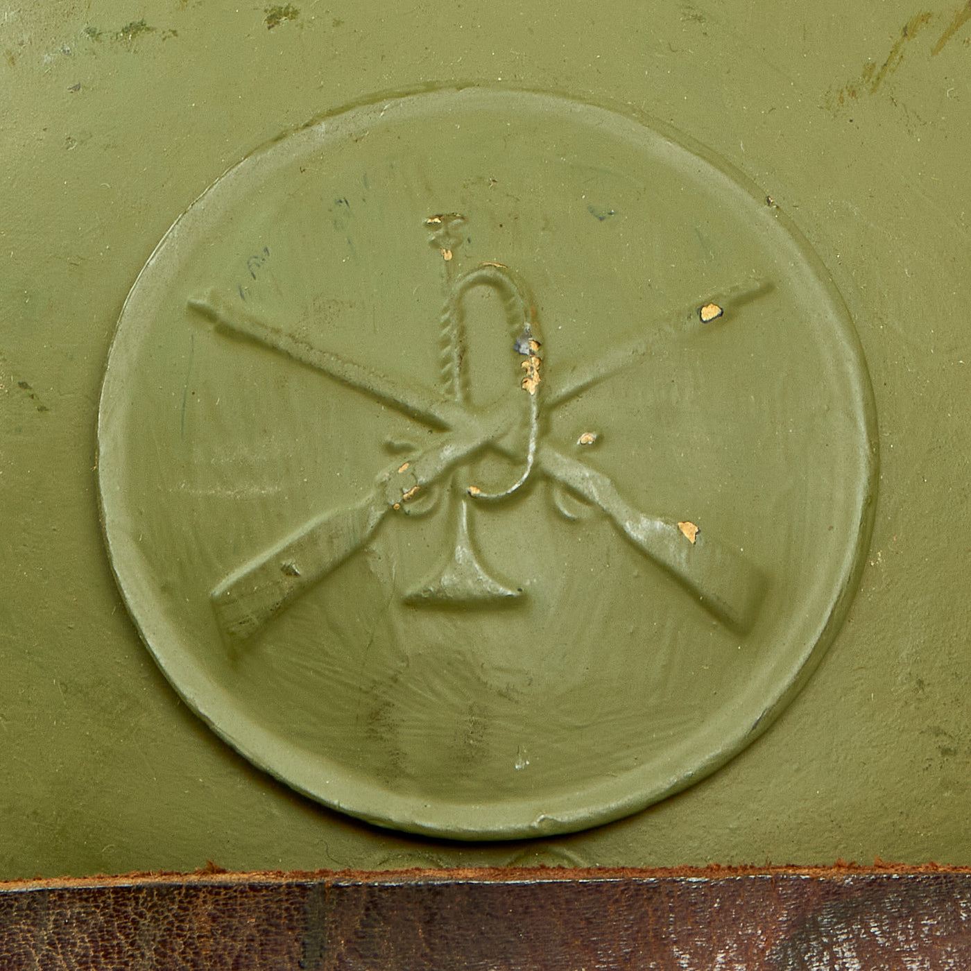 Original Item: Only One Available. This is a genuine World War II M1926 "Adrian" helmet as used by the Mexican Army before and during WWII. It has an original Mexican Infantry badge on the front of the helmet. which shows crossed rifles over an infantry bugle, the Mexican WWII era emblem for Infantry units.