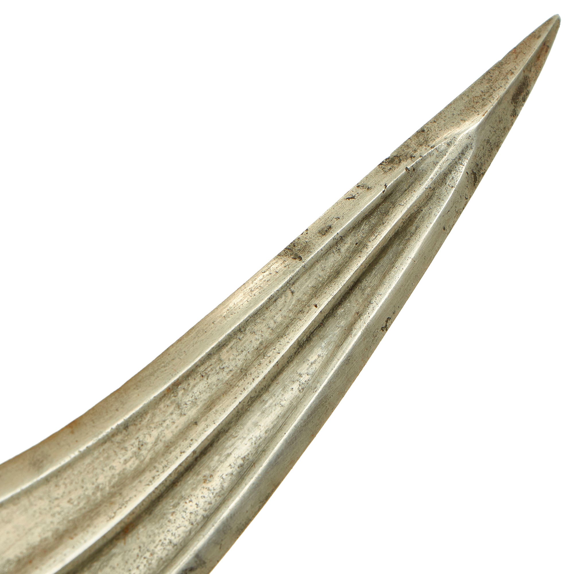 The double edged blade of the jambiya is constructed of steel which in some cases is damascus or wootz steel. This example features a lovely 9 ½” wootz steel blade with some of the design still able to be seen. Wootz steel, also known as Seric steel, is a crucible steel characterized by a pattern of bands and high carbon content. These bands are formed by sheets of microscopic carbides within a tempered martensite or pearlite matrix in higher carbon steel, or by ferrite and pearlite banding in lower carbon steels. It was a pioneering steel alloy developed in southern India in the mid-1st millennium BC and exported globally. The blade is in fantastic condition with minimal peppering or staining. There is no significant damage and the edge is free of nicks and is still quite sharp!