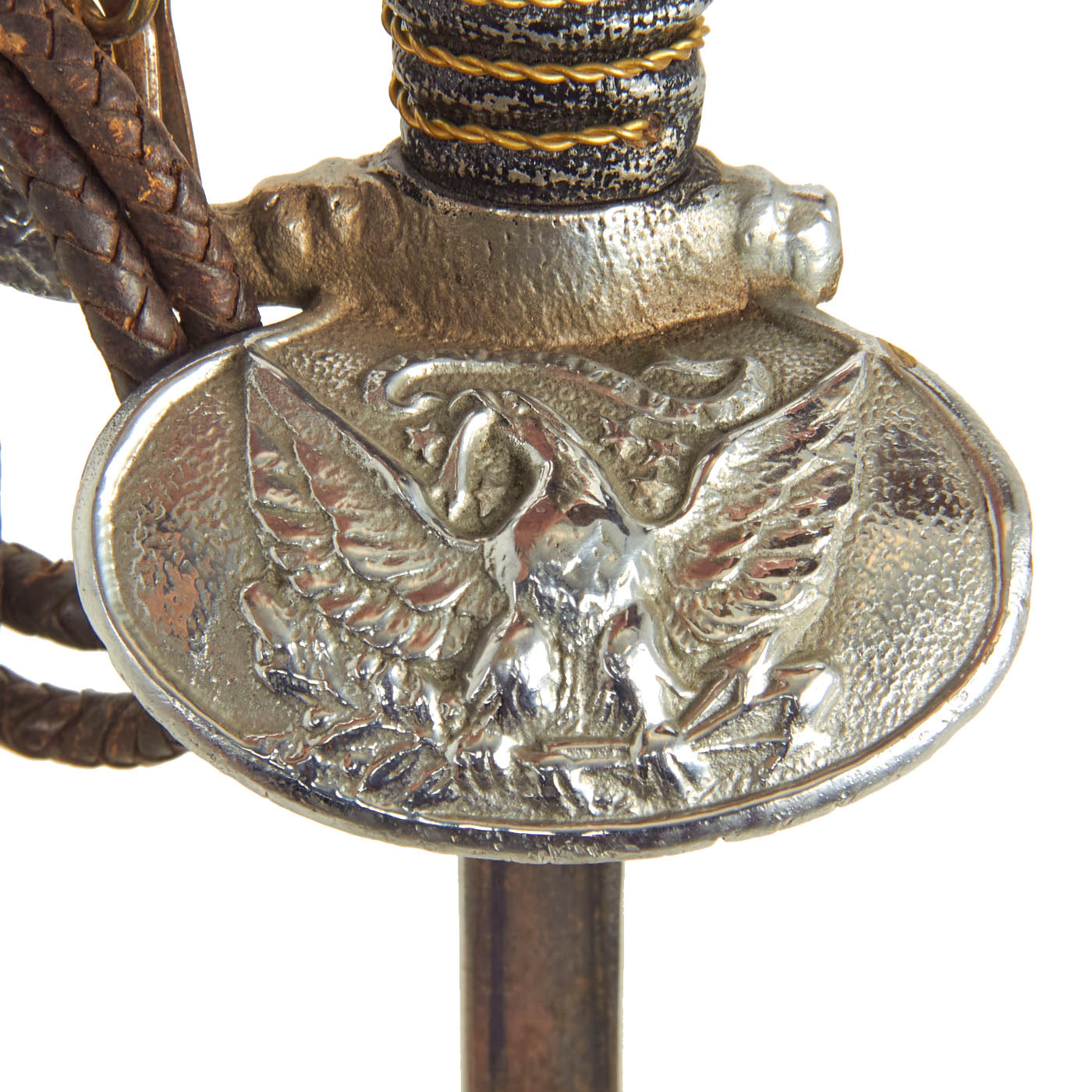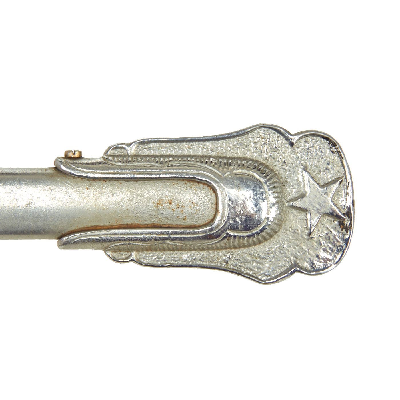 The sword and fittings replicate those on the full size examples, down to the five pointed star and crossed flags on the scabbard drag. The "shell" guard has the U.S. Federal Eagle on it, with additional U.S. motifs on the rest of the handle.