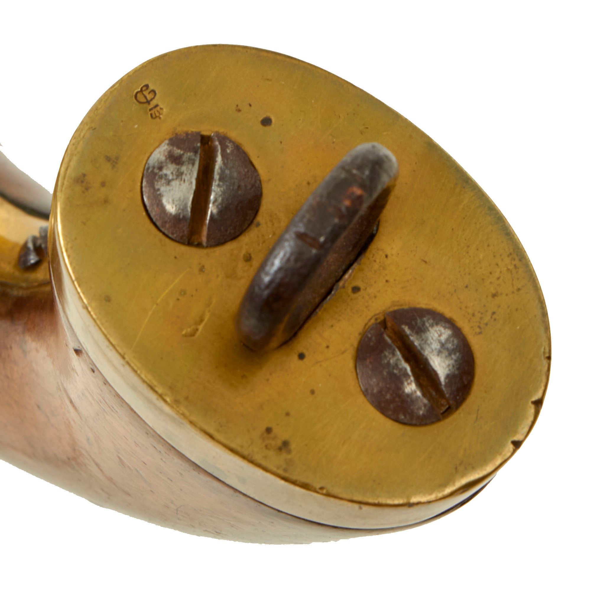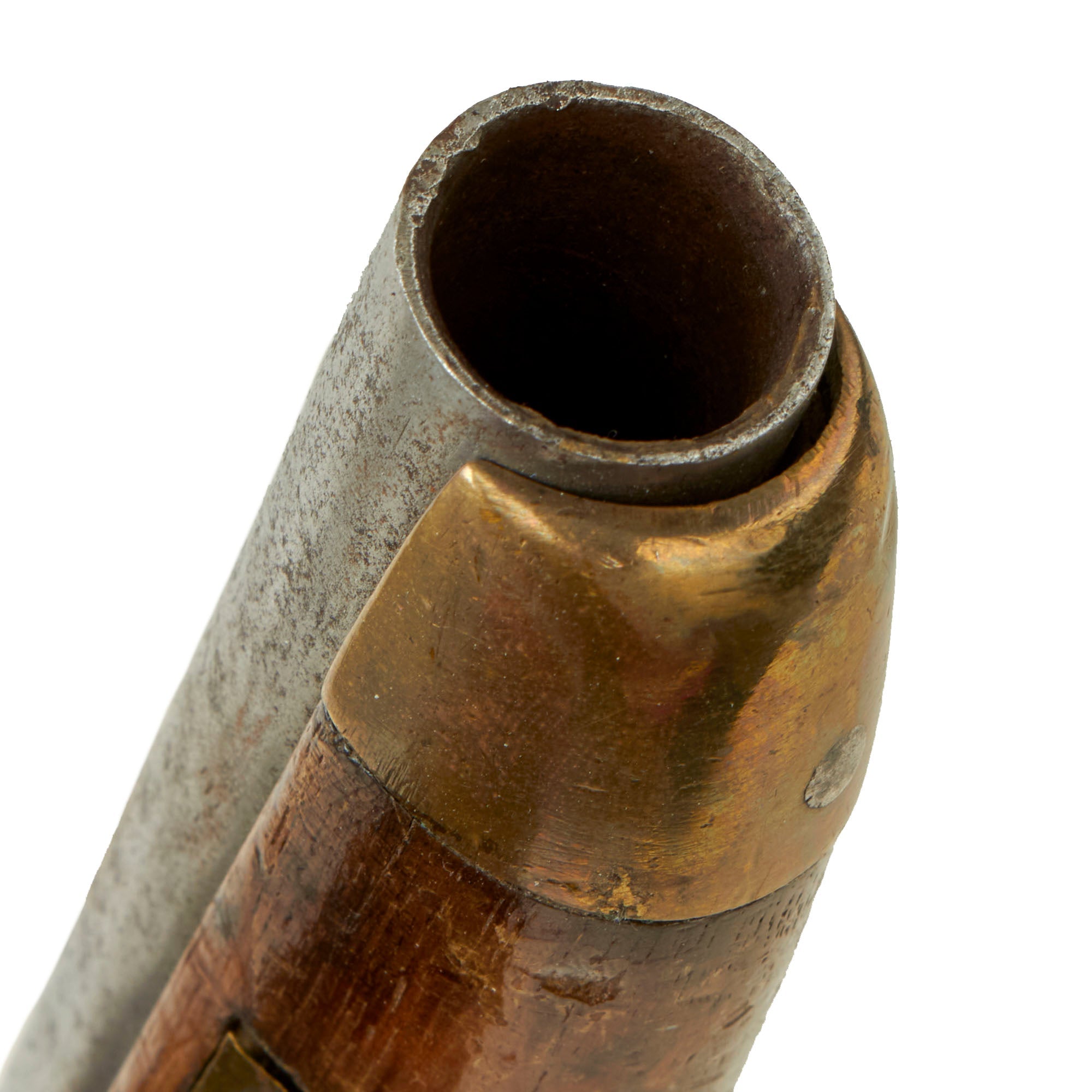 We have previously had an example with Ottoman empire markings, however this example, made right around the time of the Battle of Waterloo, bears German Proof marks on the breech end of the barrel. There are several CROWN / U and CROWN / R proof marks, along with a date of 15, for 1815. We can also see that there used to be a proof mark on the lock plate, which possibly originally was "CROWN over DN", indicating "Delft Nederlandse", indicating it was processed at arsenal in the Netherlands before being dispersed into service. Was this pistol originally made for one of the German States, or was it made for the Dutch / Batavian Navy and then captured and remarked? Definitely some great research potential here!