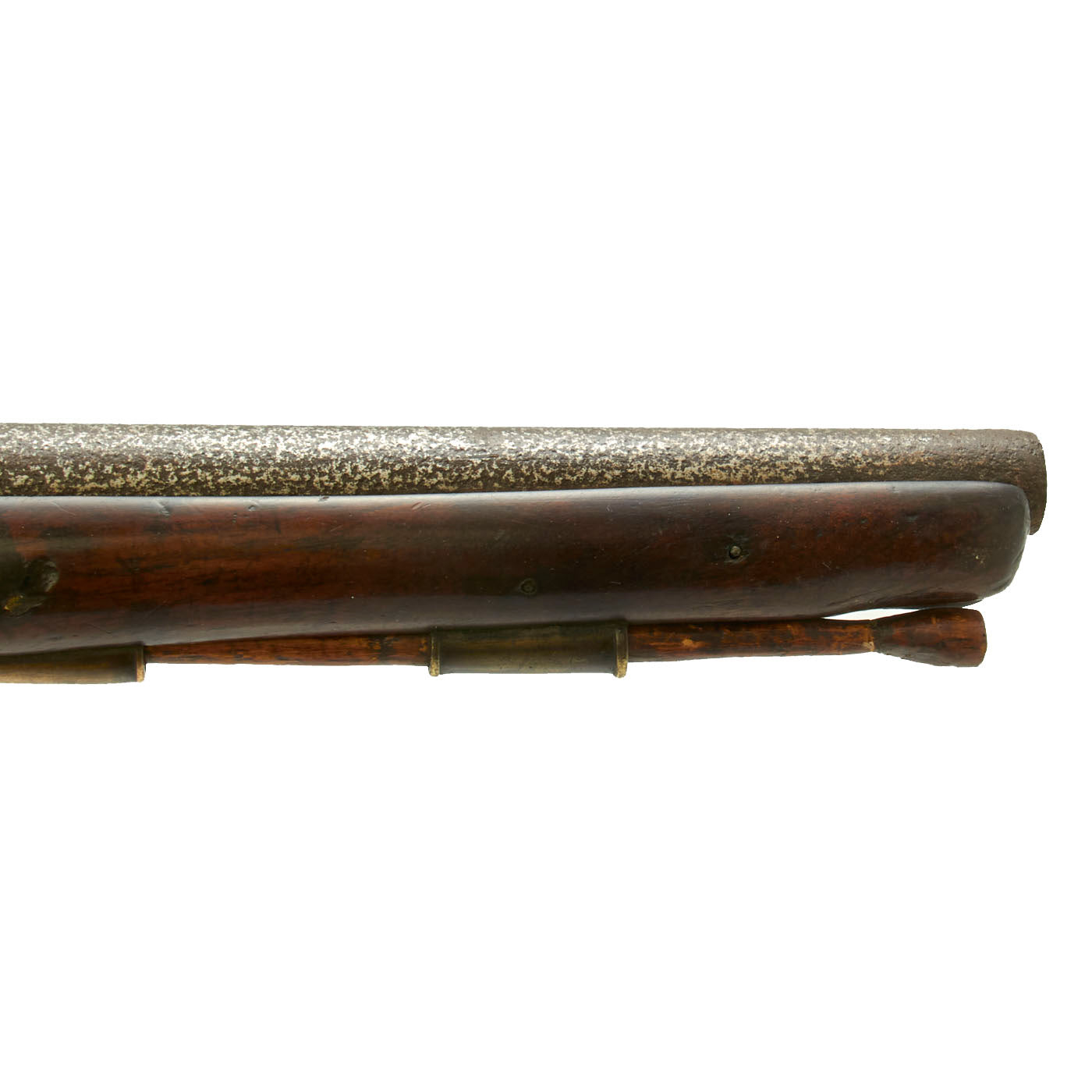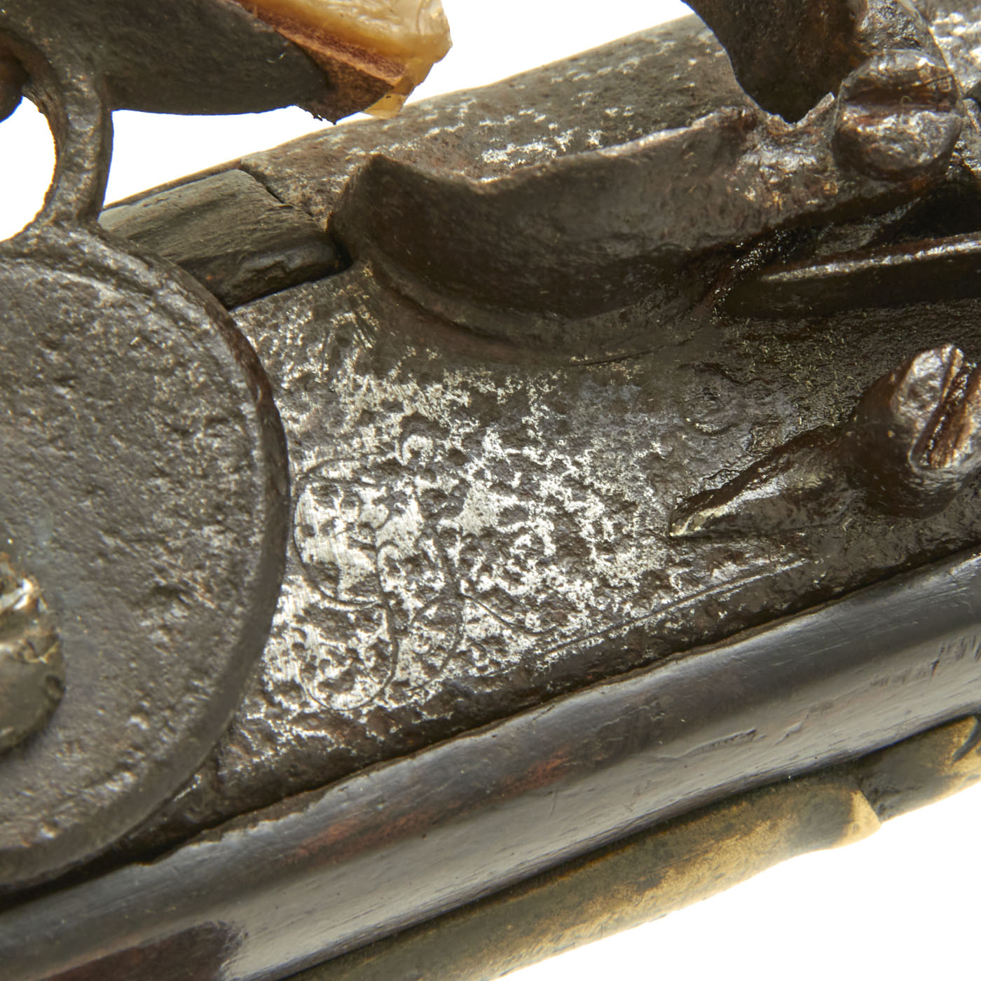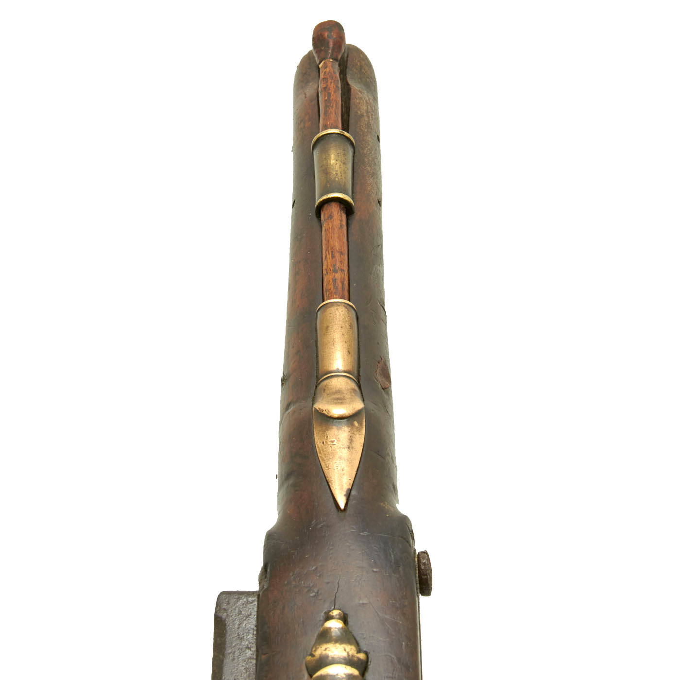 Overall condition is good, but definitely shows age and wear, with some components being close to "relic" condition. The sea air definitely took its toll on the vulnerable iron and steel components. The wood and brass faired much better, though there is wear and damage, as with any pistol that saw long service. The stock has some cracking on the left side near the lock screws, and there are also some small wood fill repairs. The trigger guard is cracked through near the butt cap. There is a ramrod, but it is a carved wood replacement.