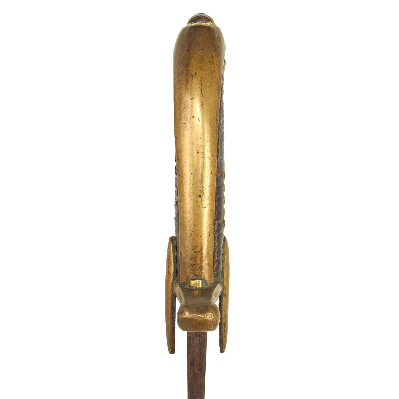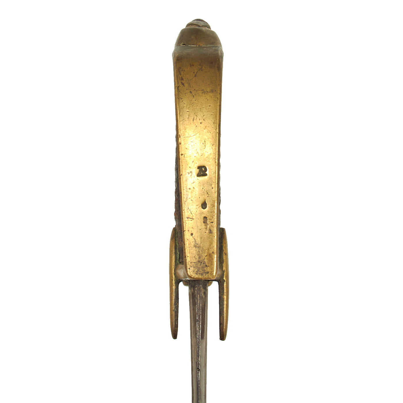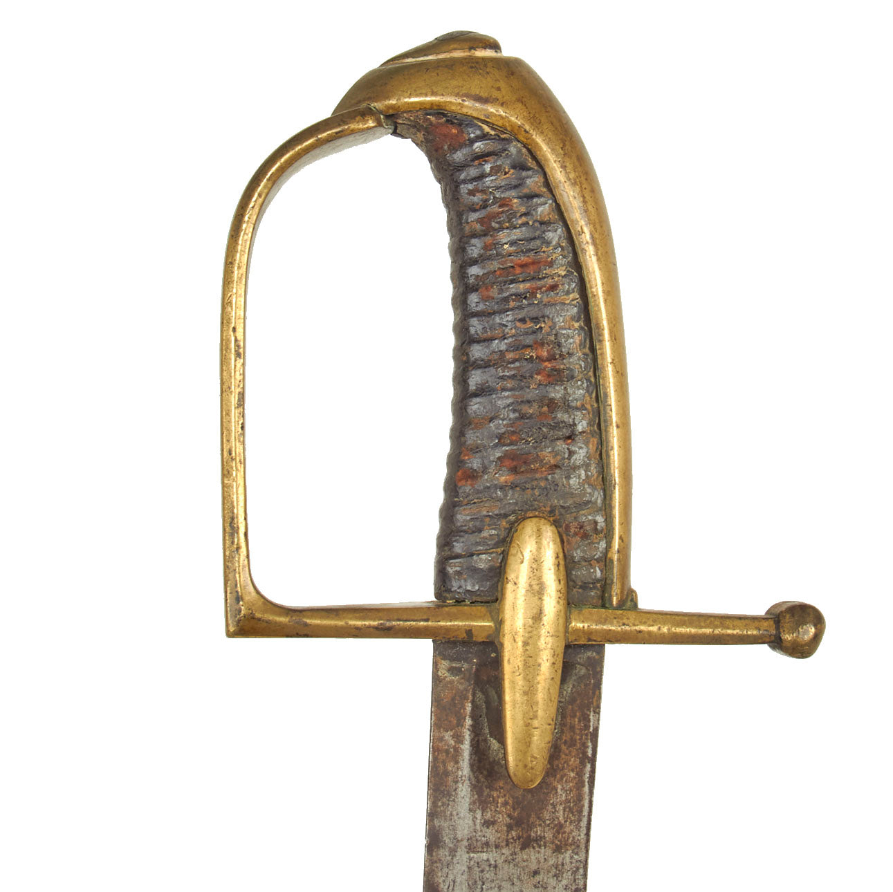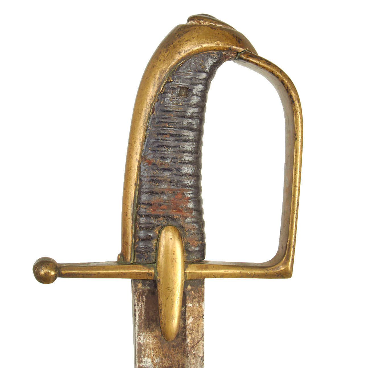 Original Item: Only One Available. This is a very nice service used French brass mounted Modèle 1777 Sabre de Hussard (M1777 Hussar Saber), dating from the 1st Empire of Napoleon Bonaparte. It has a curved 31 1/2" steel blade, typical for mounted cavalry swords of the time. The hilt features a "stirrup" style guard surrounding a leather wrapped grip, which has unfortunately lost the brass wire wrapping it would usually have. It measures almost 37" overall.