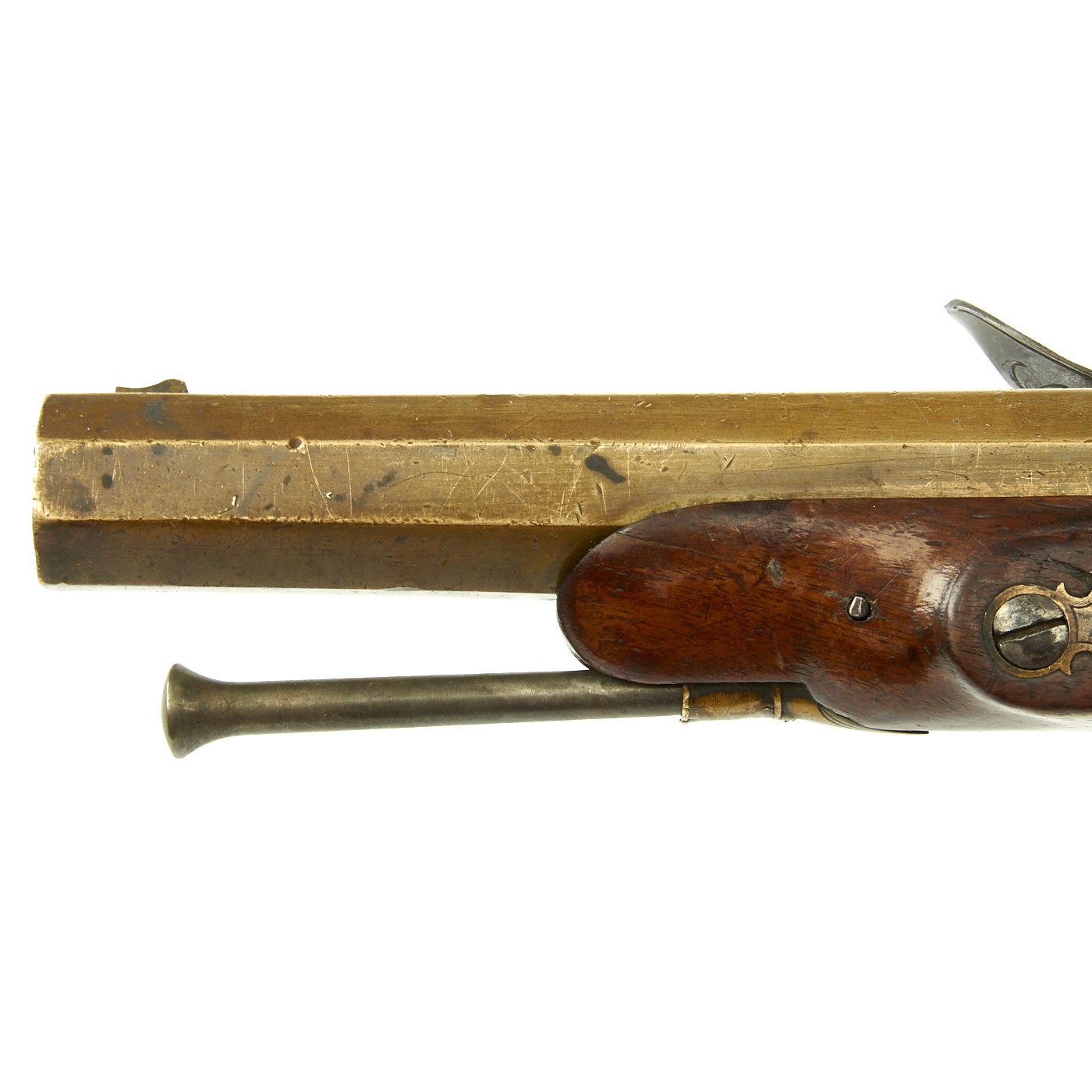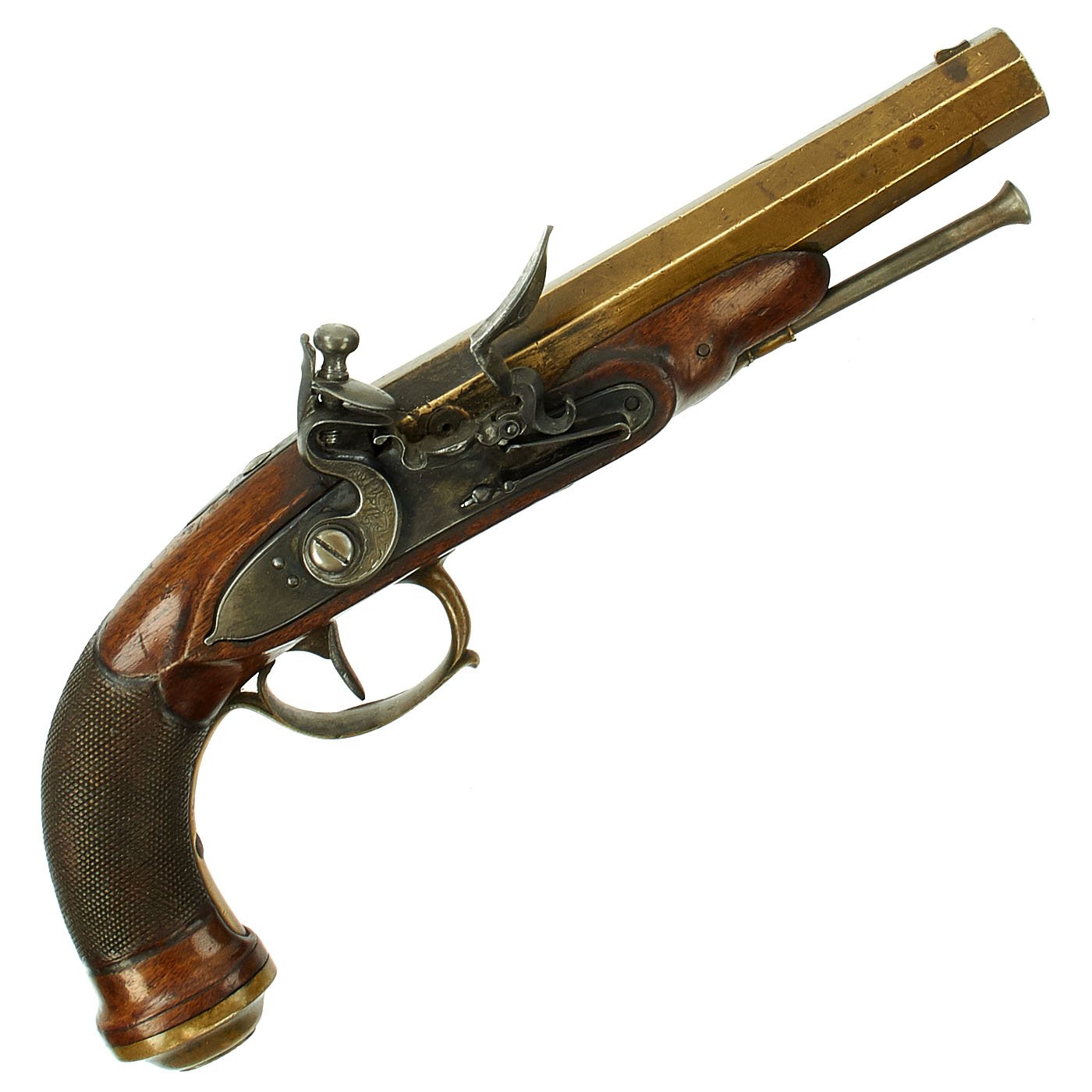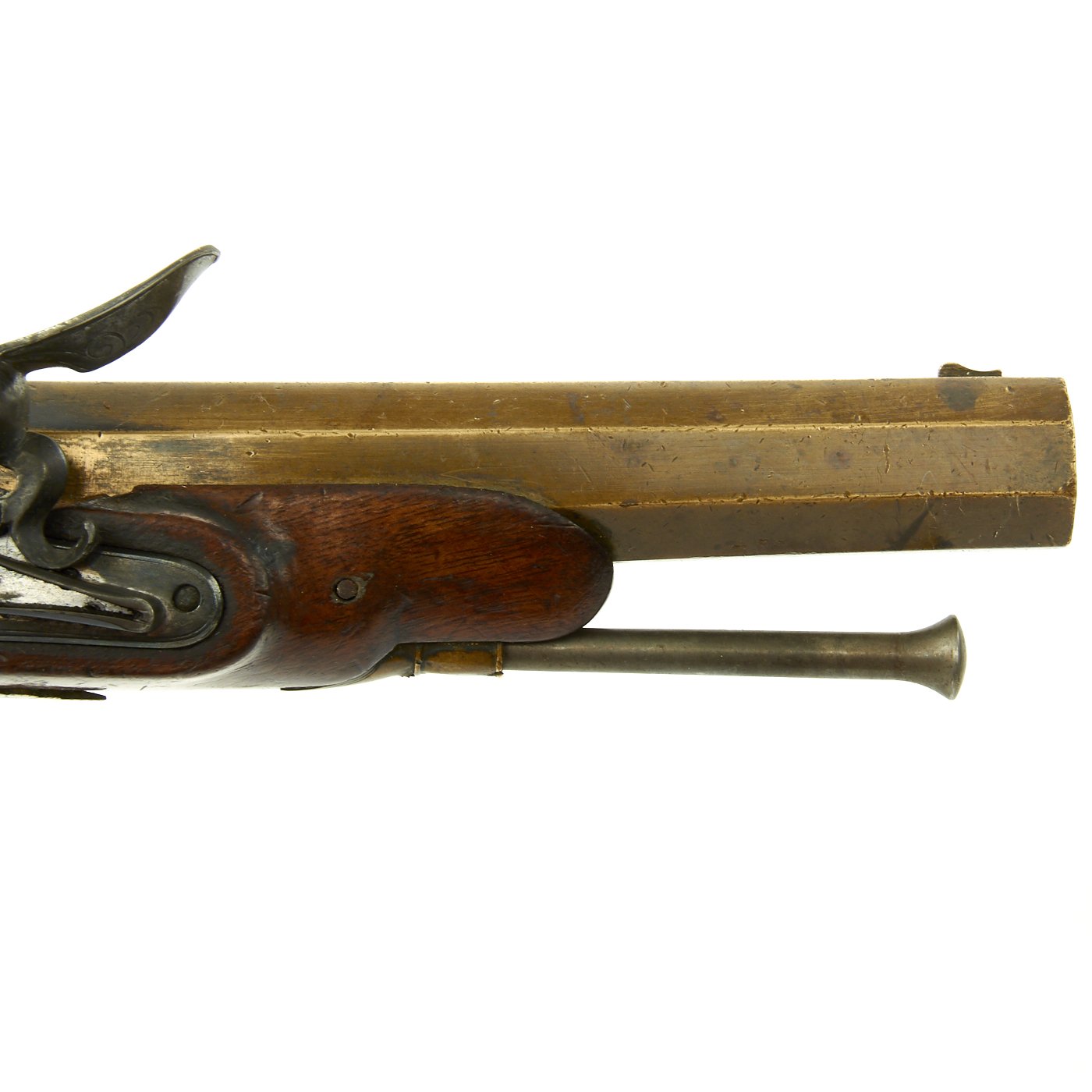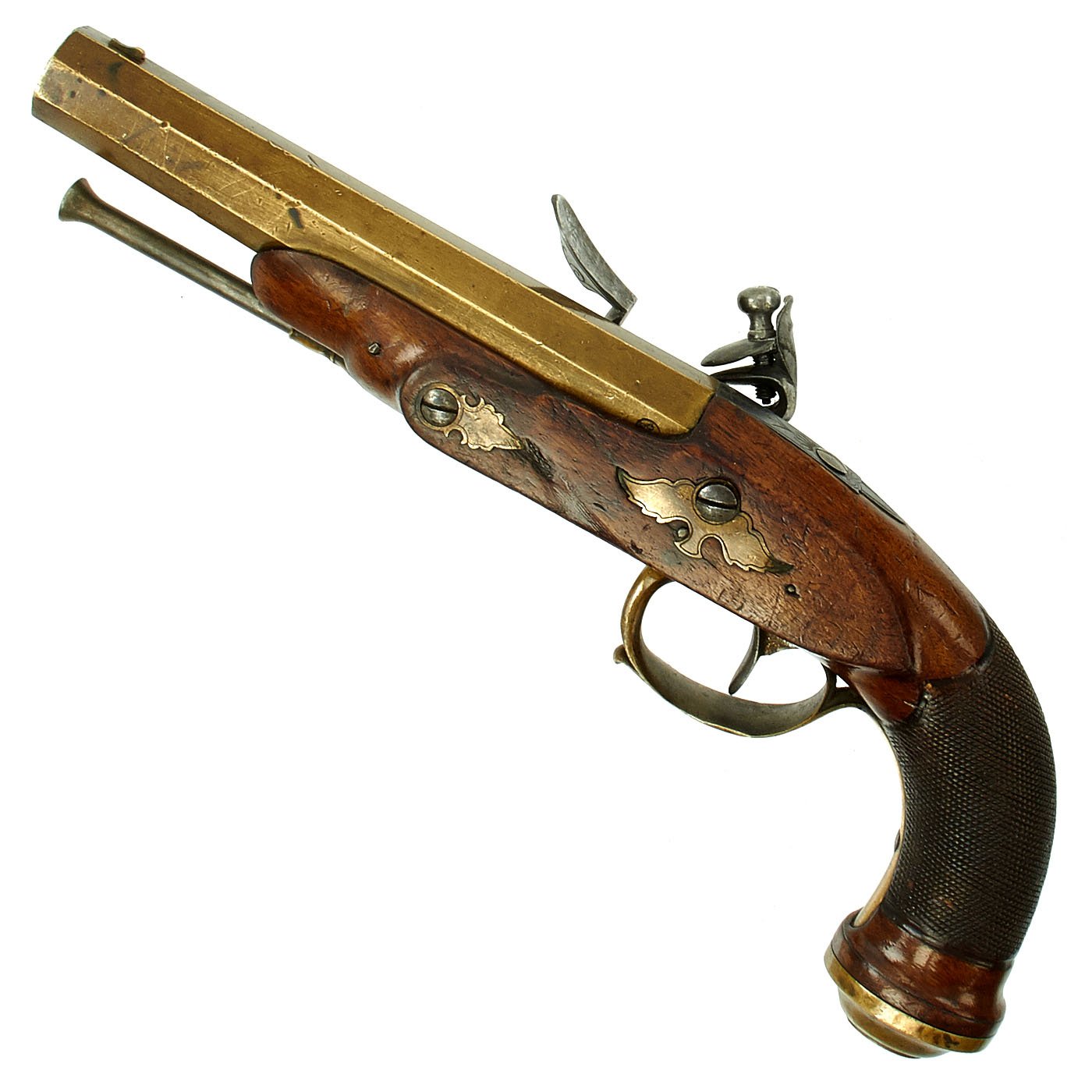 It has a quality Walnut stock and the grip is elegantly checkered, brass/bronze Mounts and brass/bronze 6 3/4" octagonal barrel. The lock plate is un-signed. Decorated mounts, complete with iron ram rod. Overall 11 1/2" in length, and in great shape. The lock functions correctly, holding at half cock and firing at full.